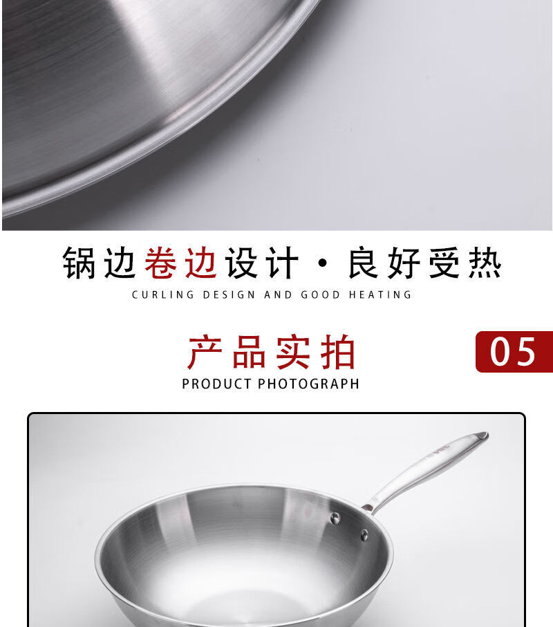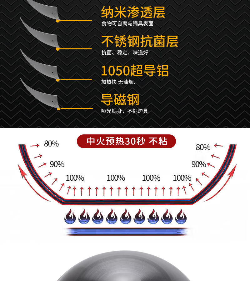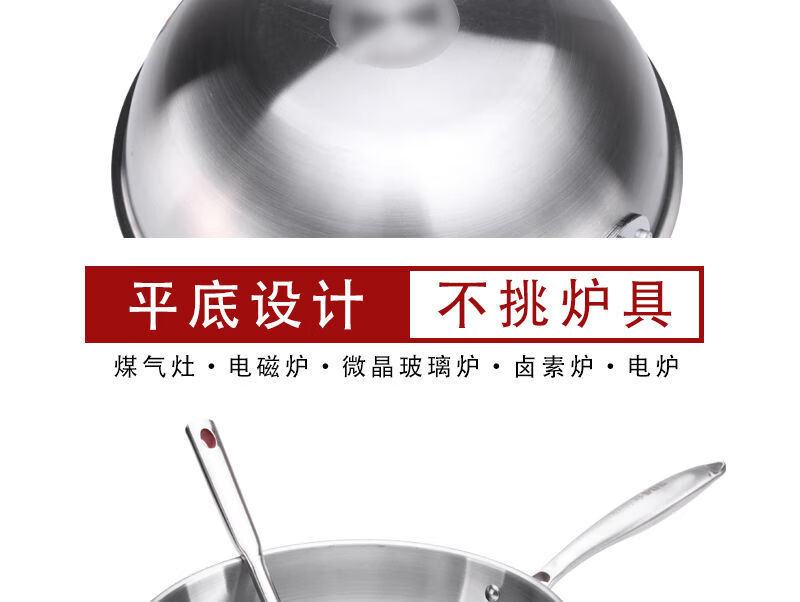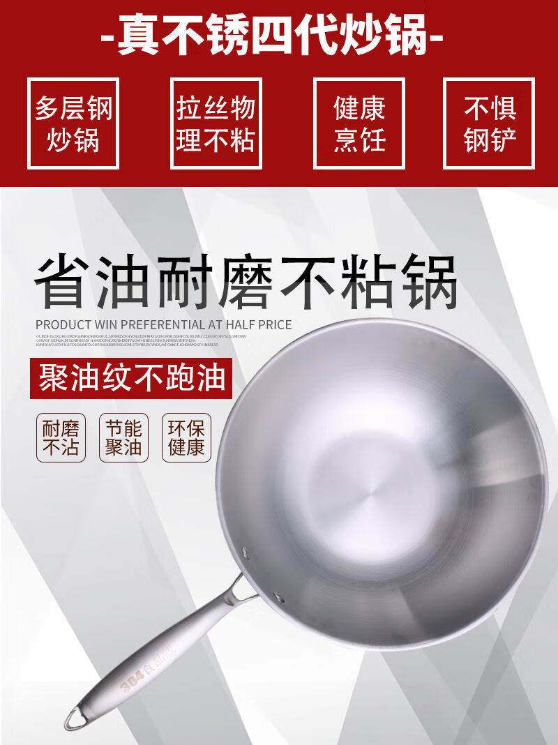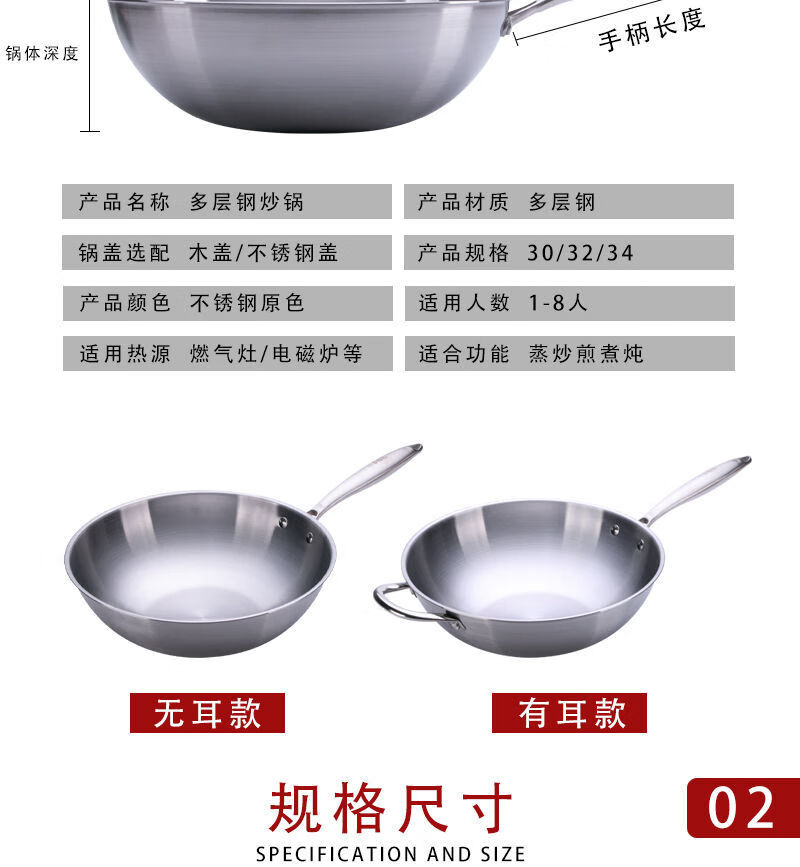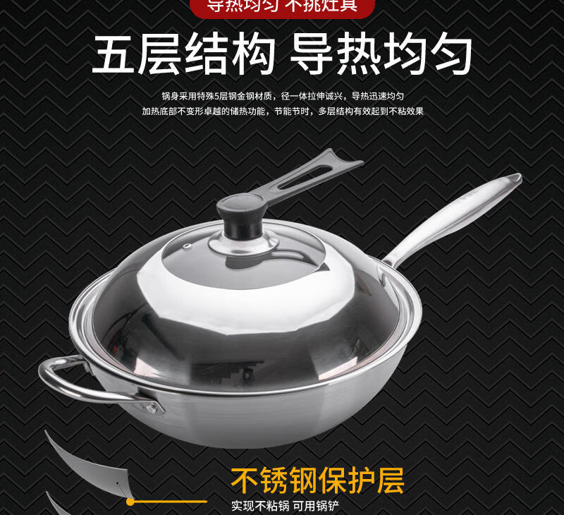 PJ6302次回购厨师无油烟不锈钢炒锅家用无涂层炒菜锅电磁炉燃 1寸 升级款五层钢+可立盖1寸 内径34厘米有耳
