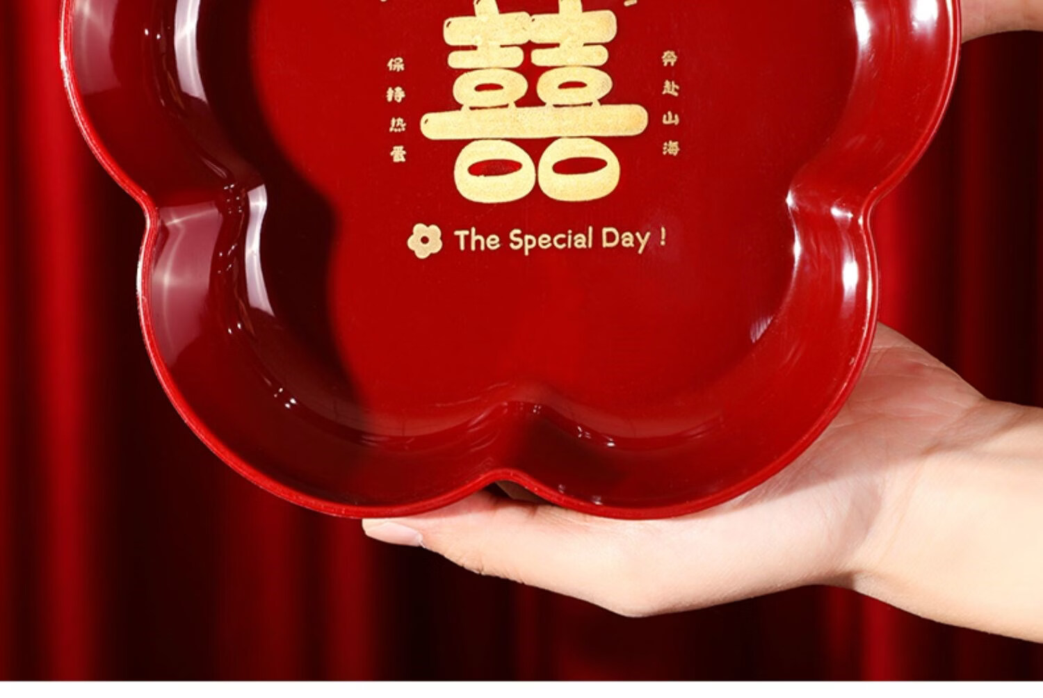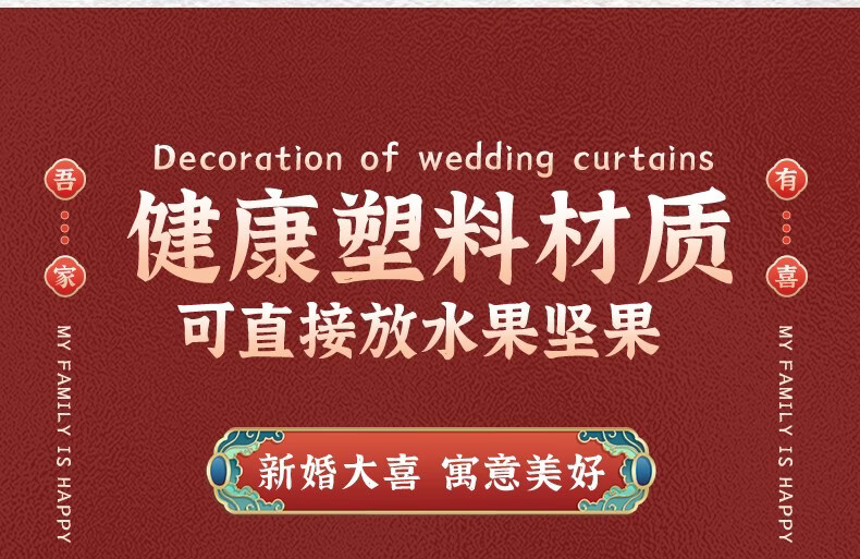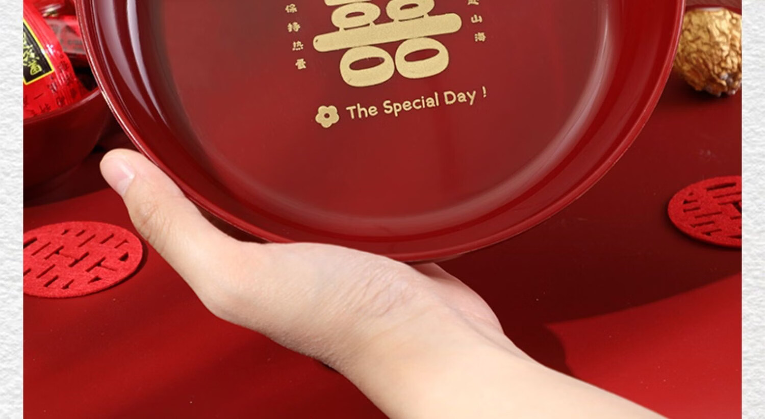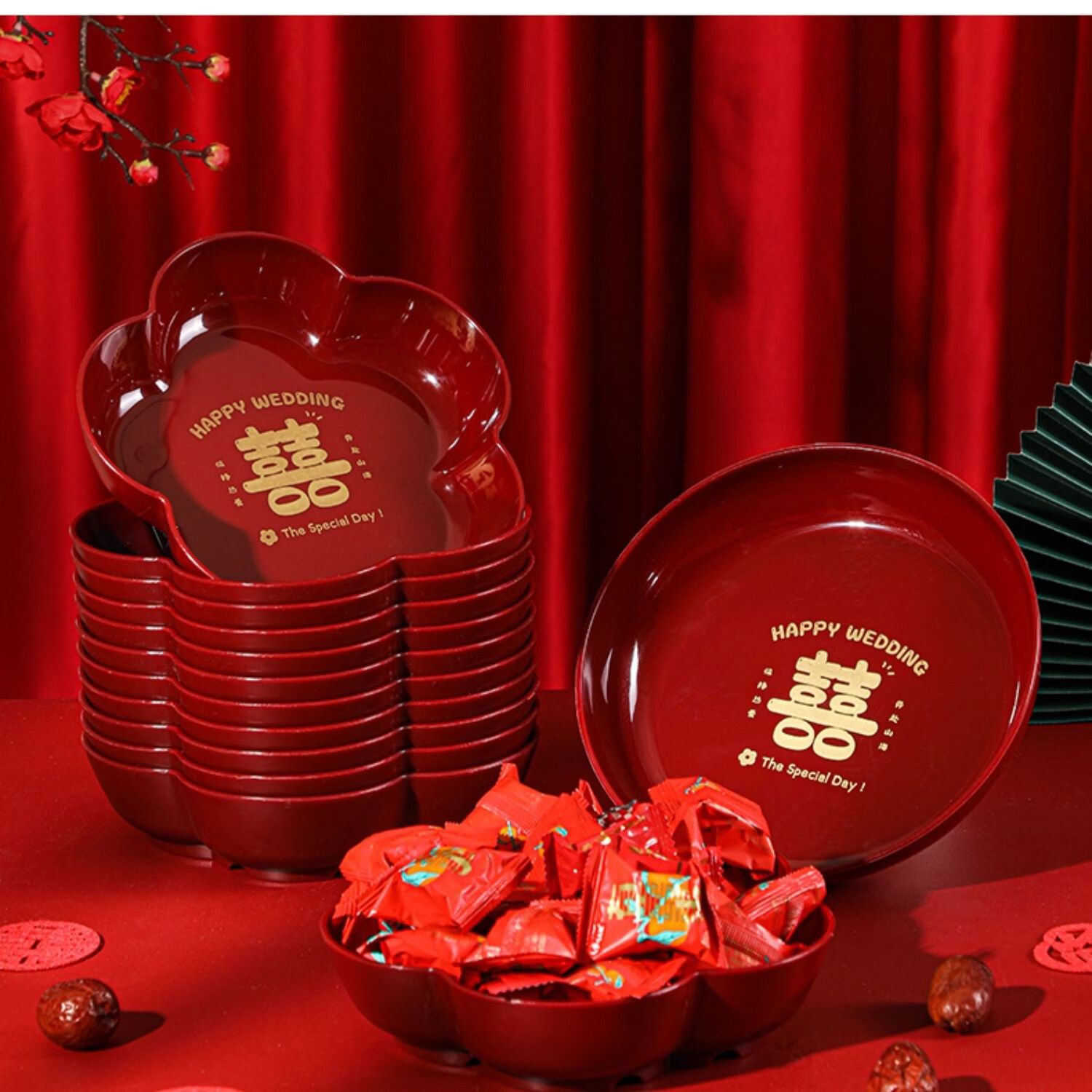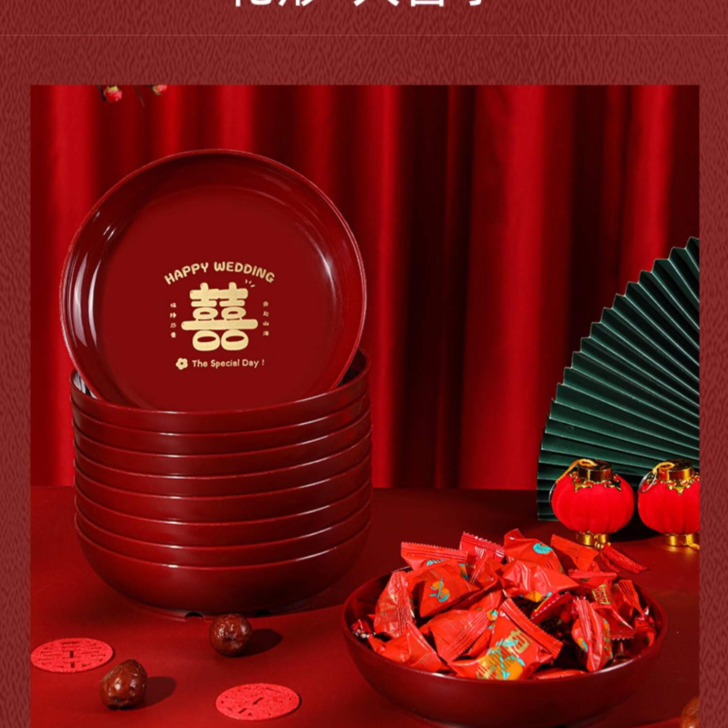 科鹿结婚果盘红色客厅喜糖盘订婚摆件喜盘子干果盘网红婚庆用品大全盘 【喜柿发生-4个】圆形