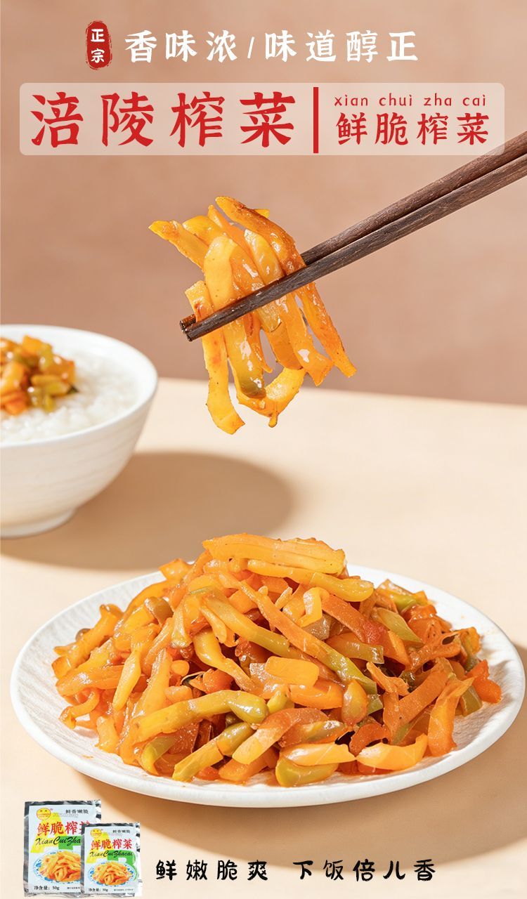 涪陵榨菜去皮芥菜咸菜蔬菜下饭菜新鲜蔬菜早餐简餐户外旅行 榨菜丝50g/袋 3袋