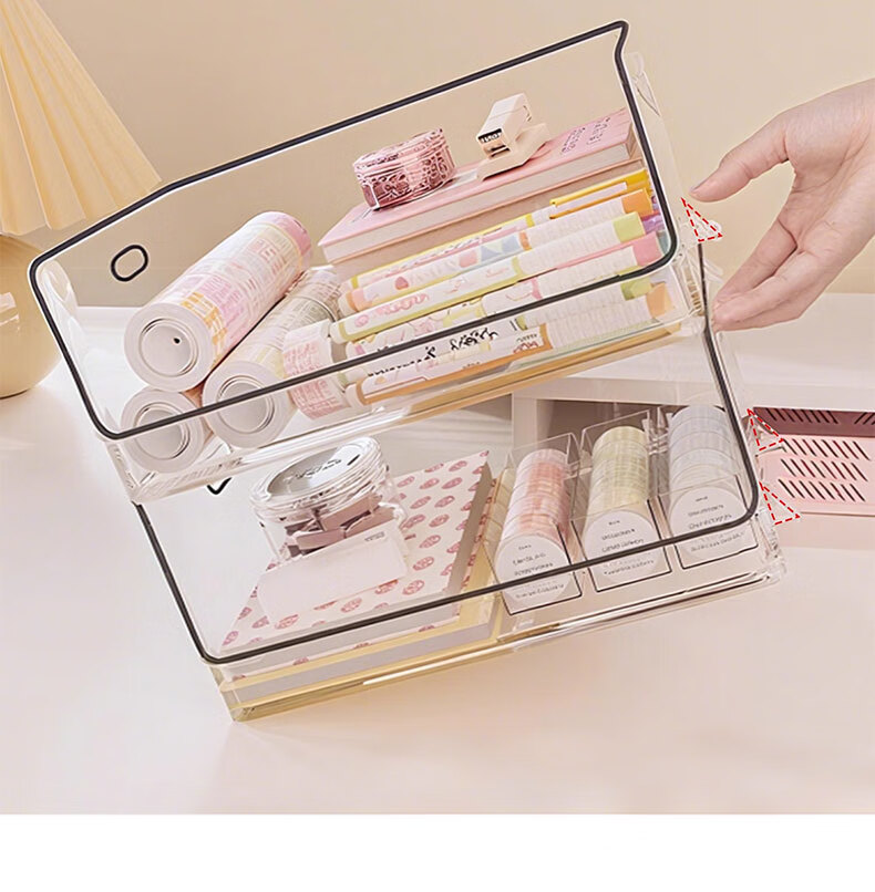 稻草熊桌面收纳盒抽屉式透明化妆品口红整理盒杂物办公室桌上文具置物架 茶色-特大号3个装【自由叠加】