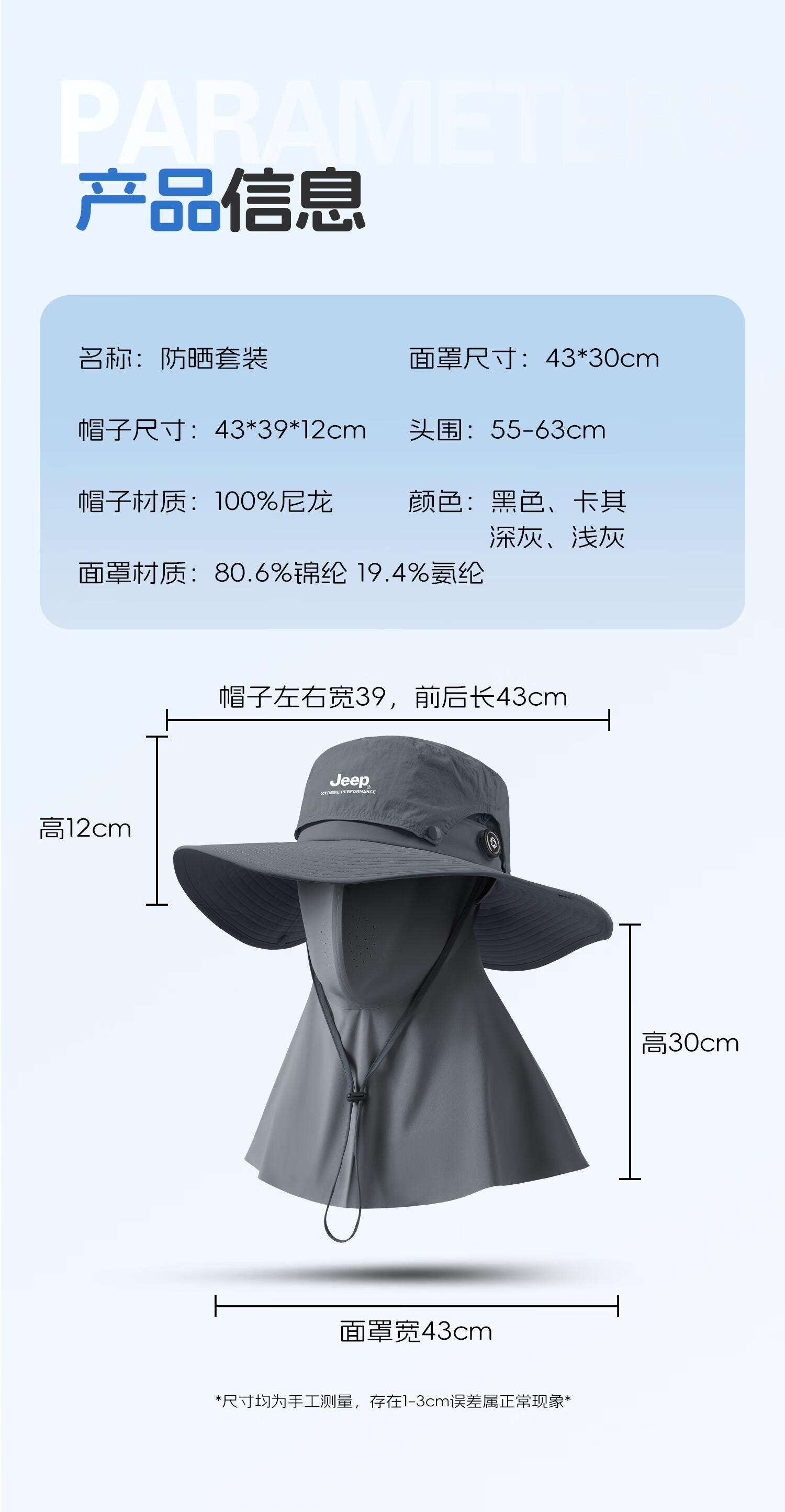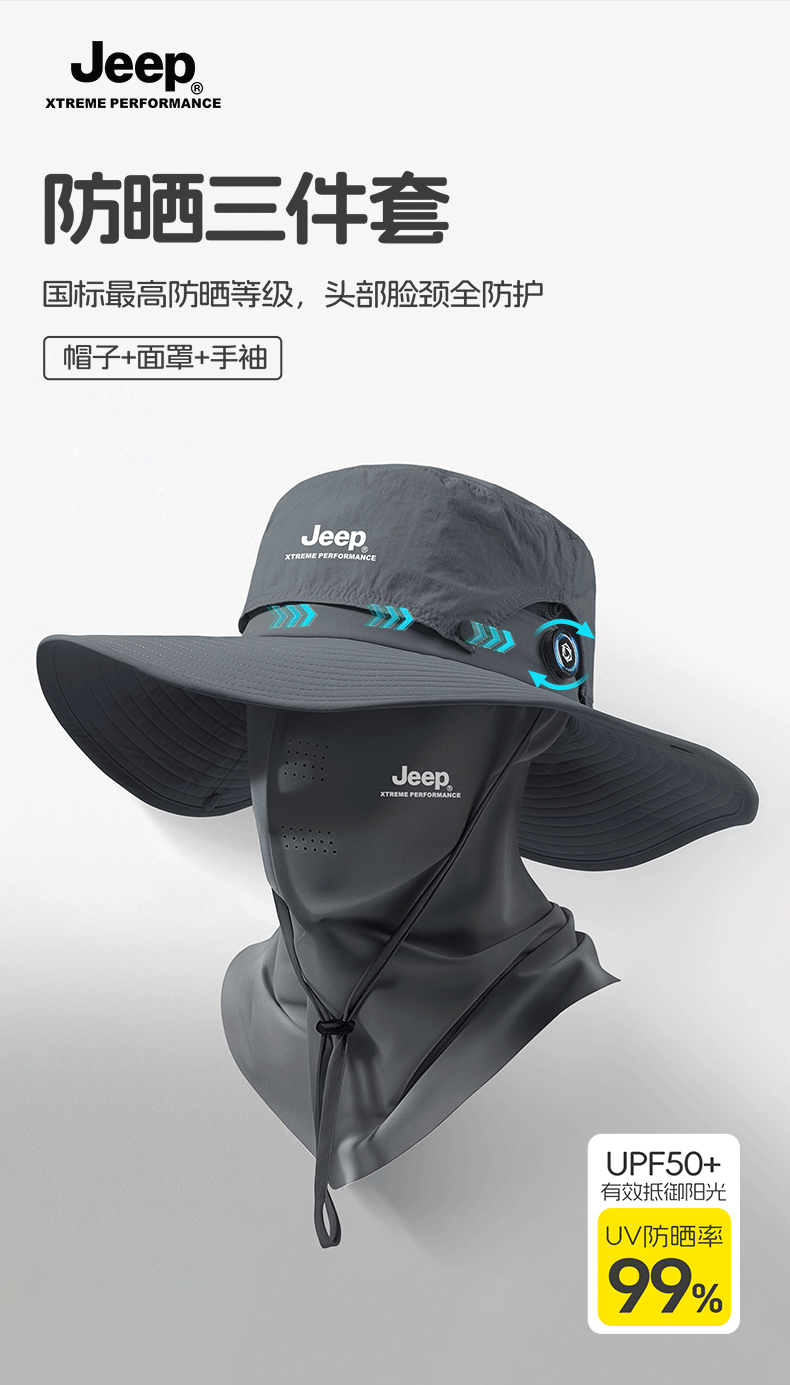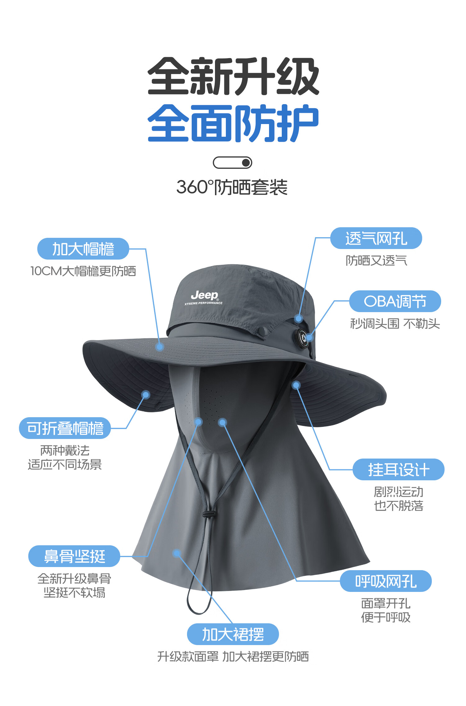 JEEP帽子男士夏季户外防紫外线渔夫帽遮阳帽男登山帽钓鱼防晒帽太阳帽 深灰两件套【帽子+格子面罩】 均码 【齿轮械调帽围】