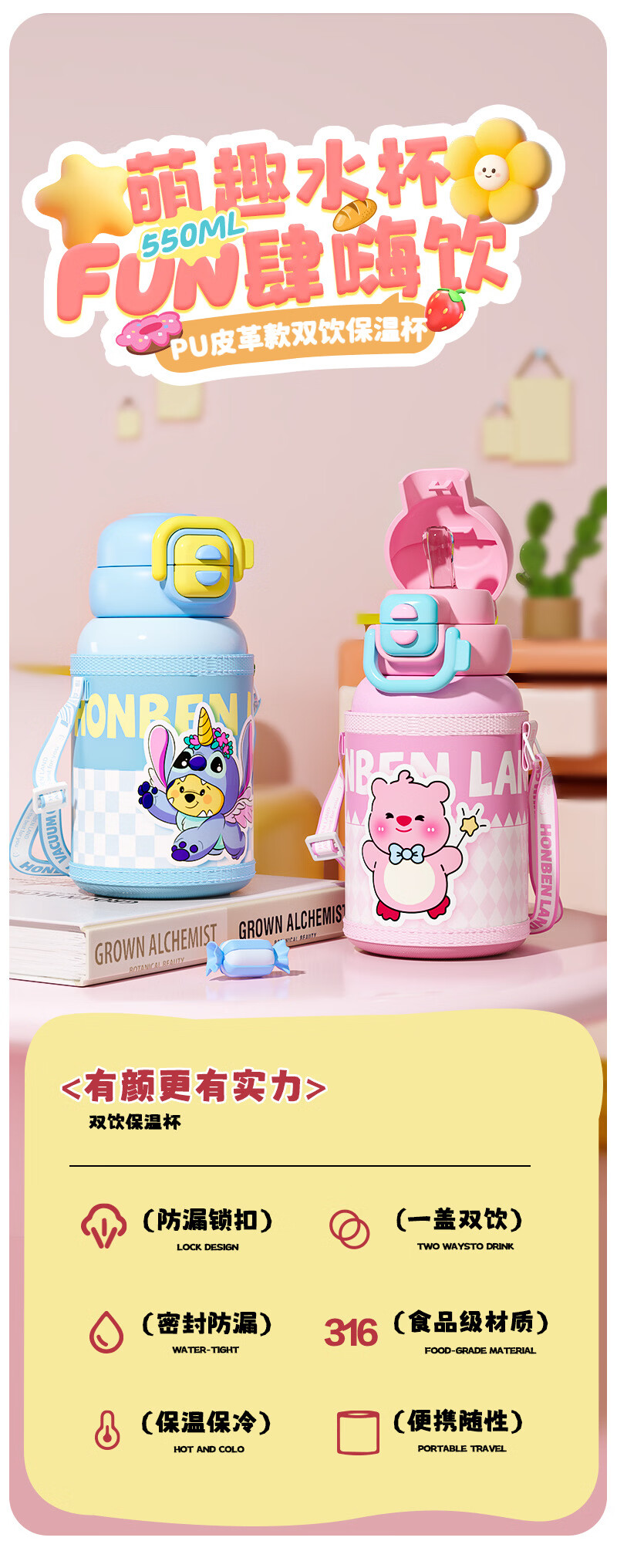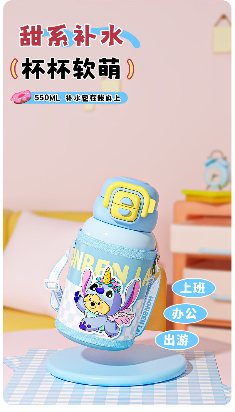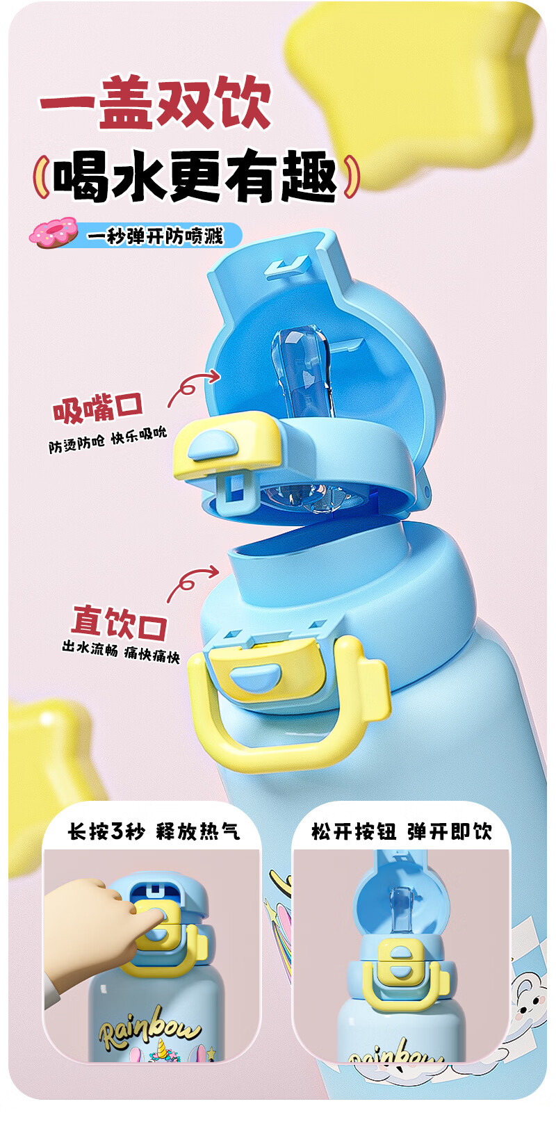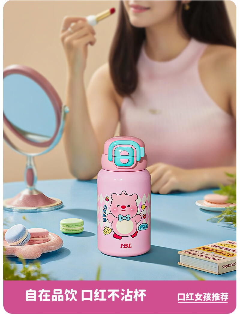 可爱吸管弹跳杯保温杯双层不锈钢女生高颜值水杯便携学生斜挎杯子 粉色(玻璃内胆 450ml(送3D贴+背肩带