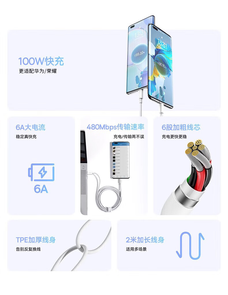 EQCG适配华为充电线66W/100W/120W超级快充原装type-c数据线闪充6A手机荣耀X6/mate70/nova7/P50Pro 100W快充线2米【3C安全认证】买一送一
