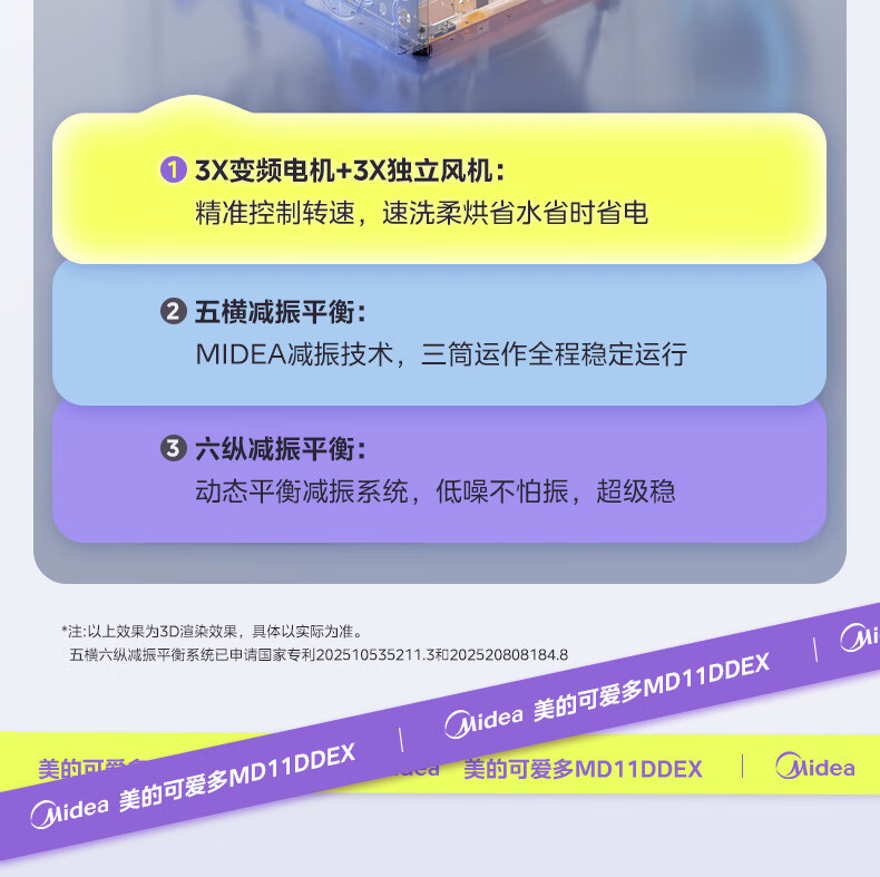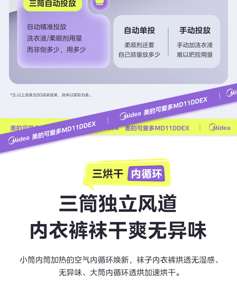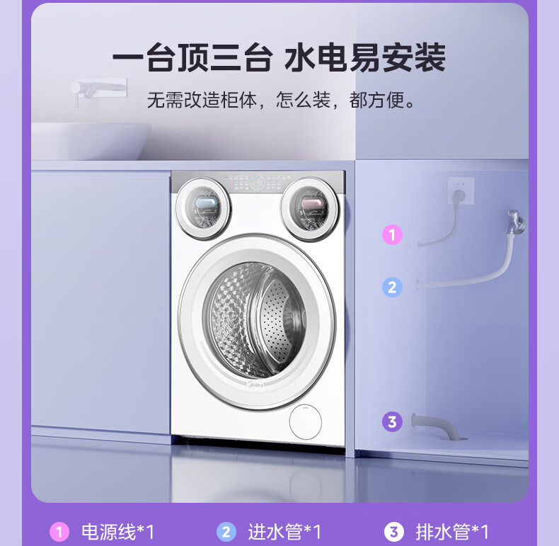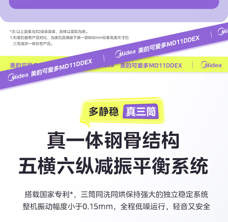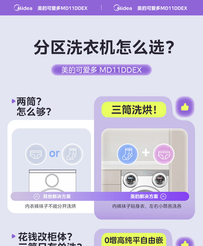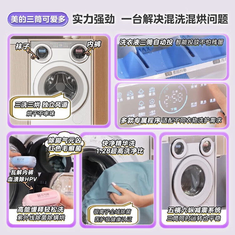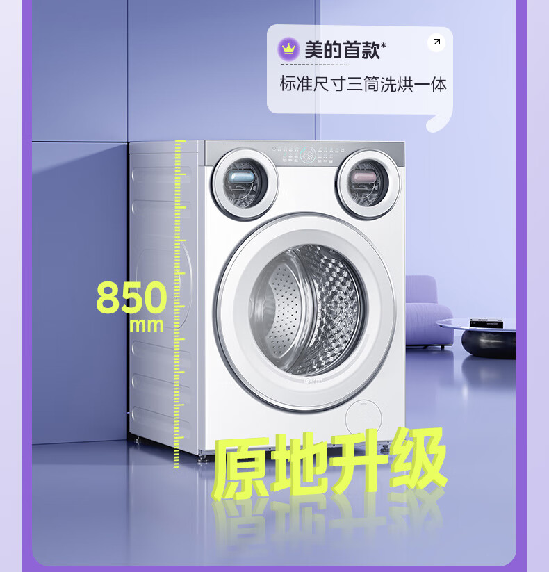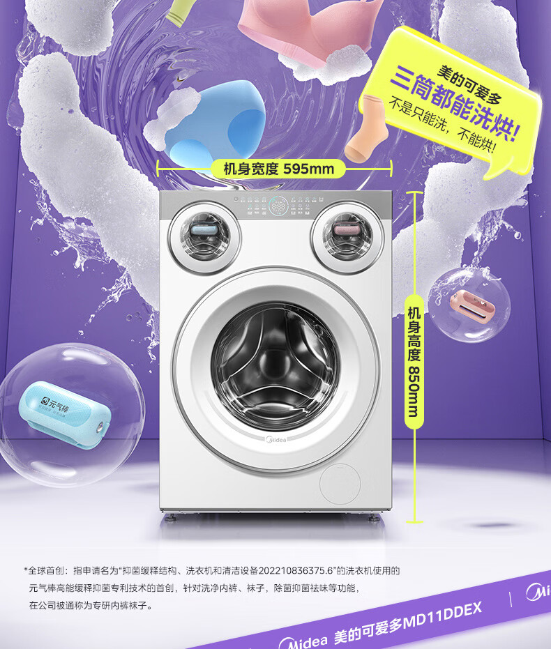 美的(Midea)三筒洗衣机洗烘一体全自动分区洗除菌净血渍三桶智能投放850mm标准高度国家补贴20% 【可爱多MD11DDEX】