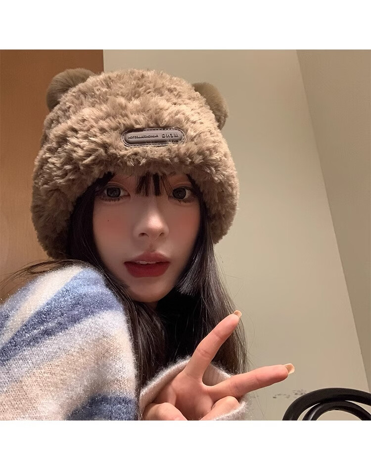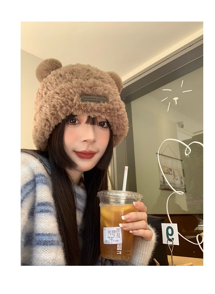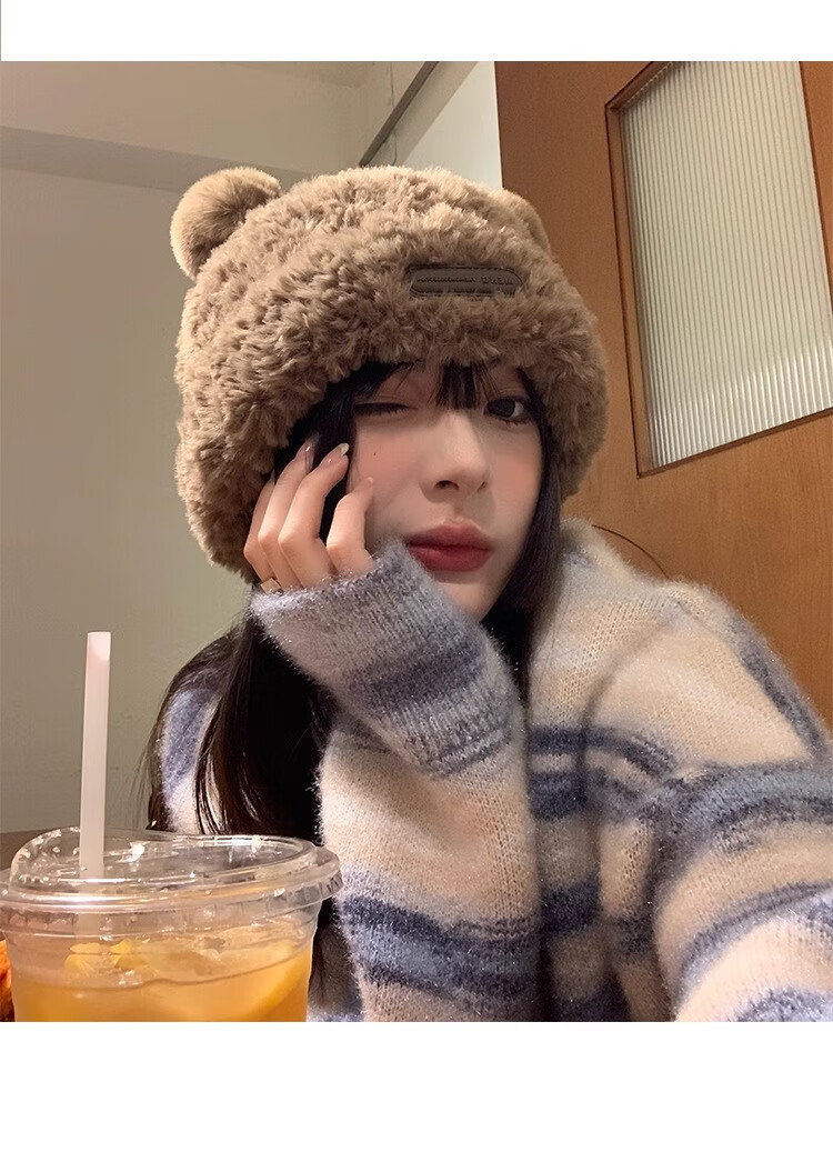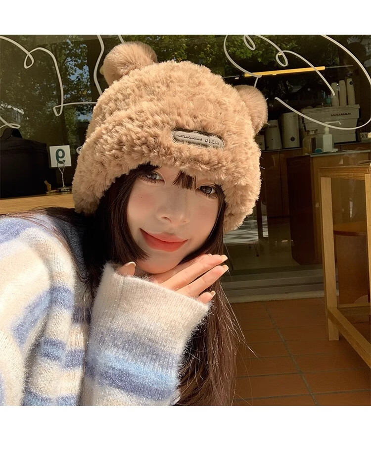 朋意可爱小熊毛线帽子女冬季爆款毛绒保暖毛毛秋冬大头围针织帽 小熊毛线帽-卡其 无规格