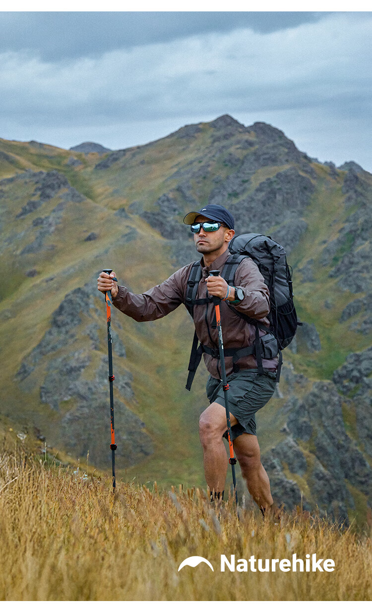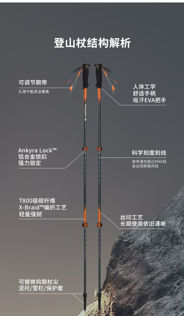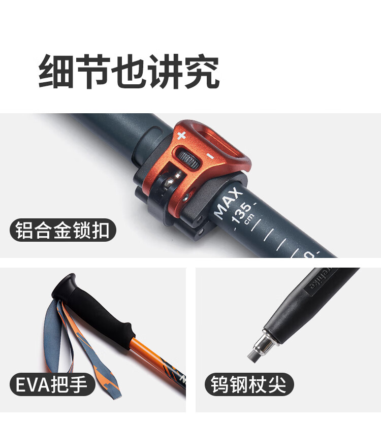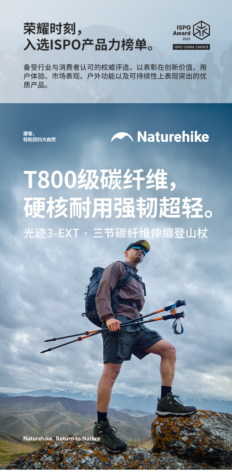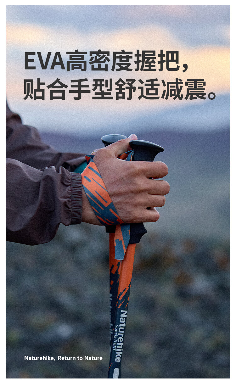 Naturehike挪客光迹3EXT三节碳纤维伸缩登山杖轻量男户外专业徒步手杖女超轻 单根/推荐身高1.9m以下/赤焰橙/62-135cm