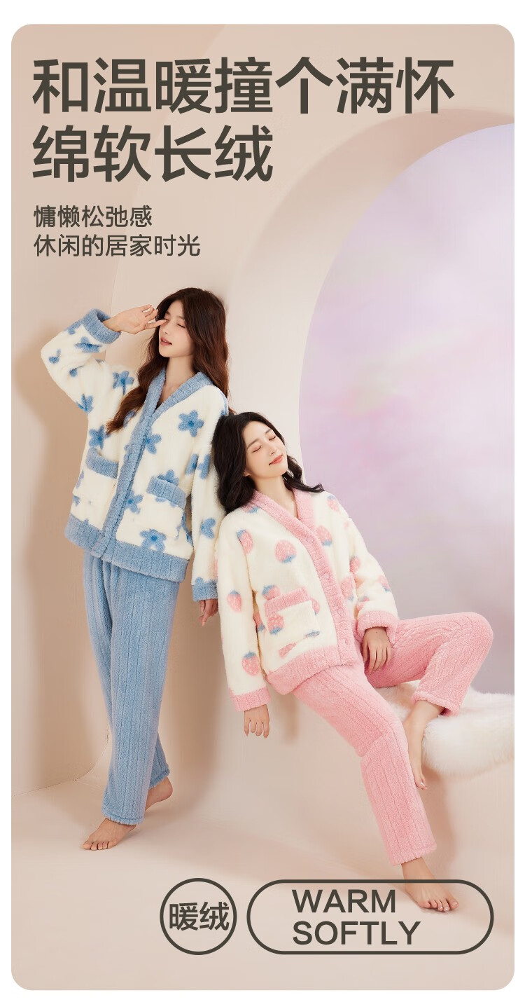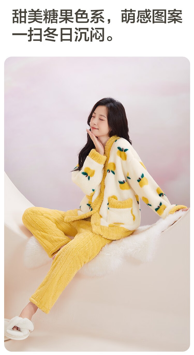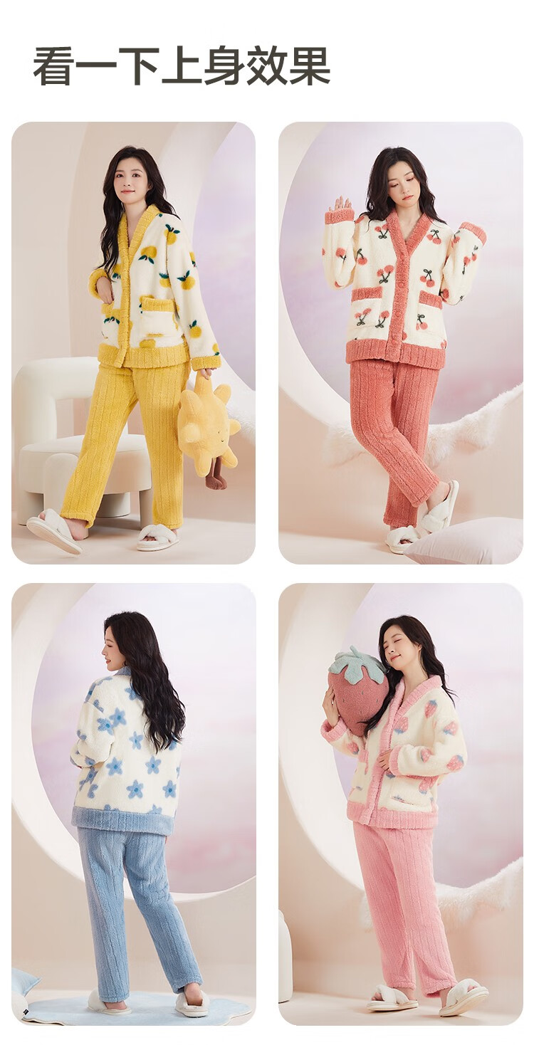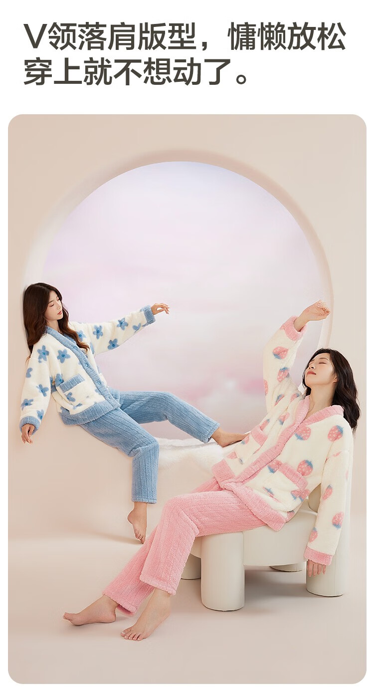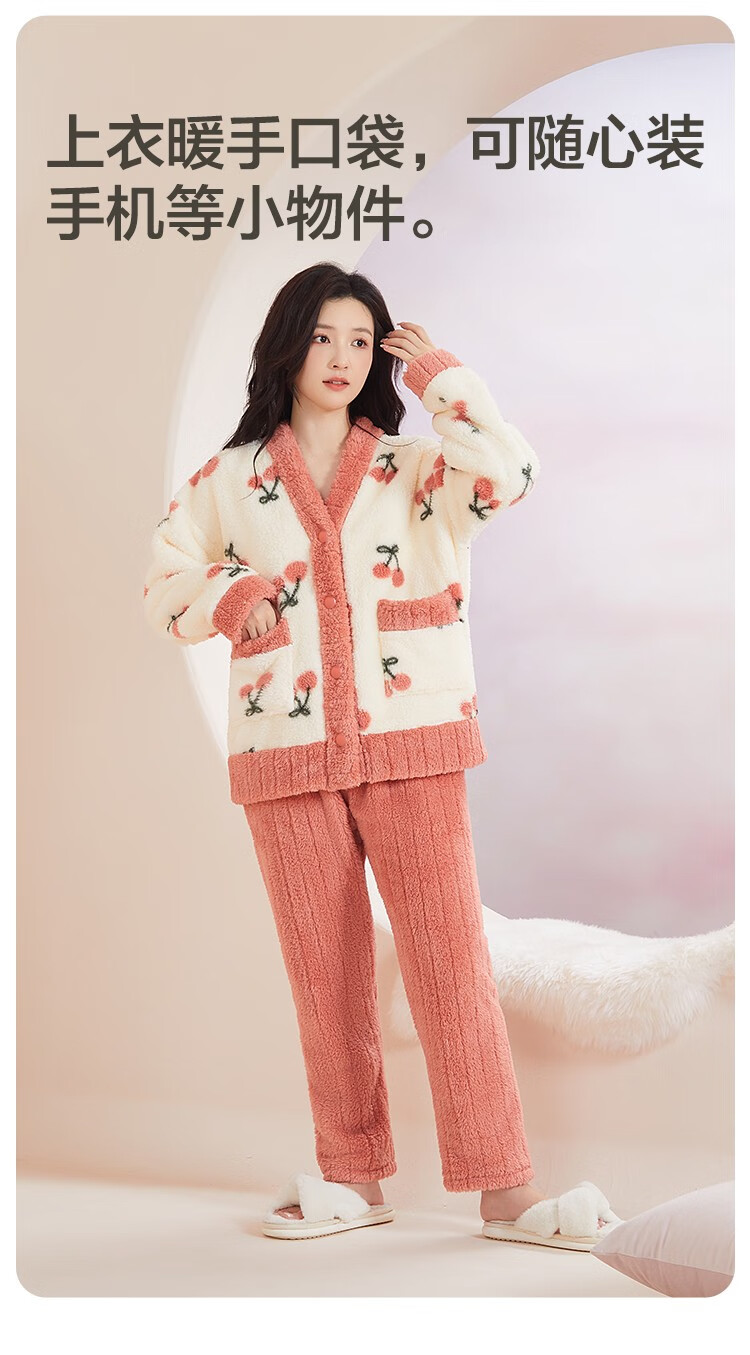 红豆居家(Hodohome)【加绒加厚】秋冬保暖印花女士开衫长袖睡衣套装甜美居家服可外穿 蜜橘粉 M 女士165