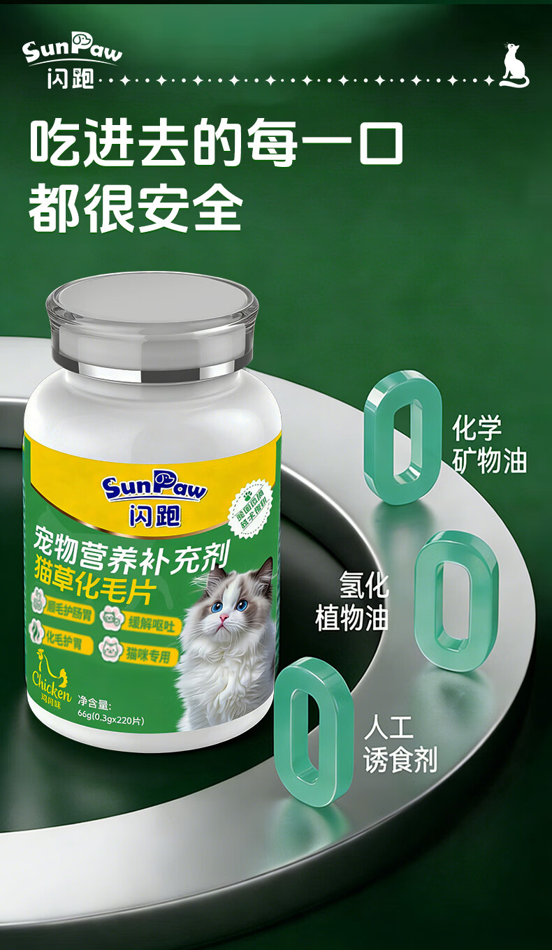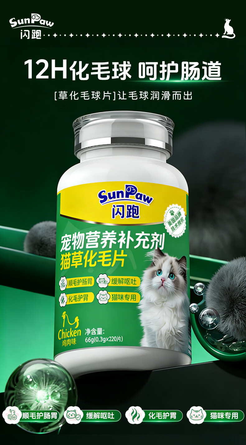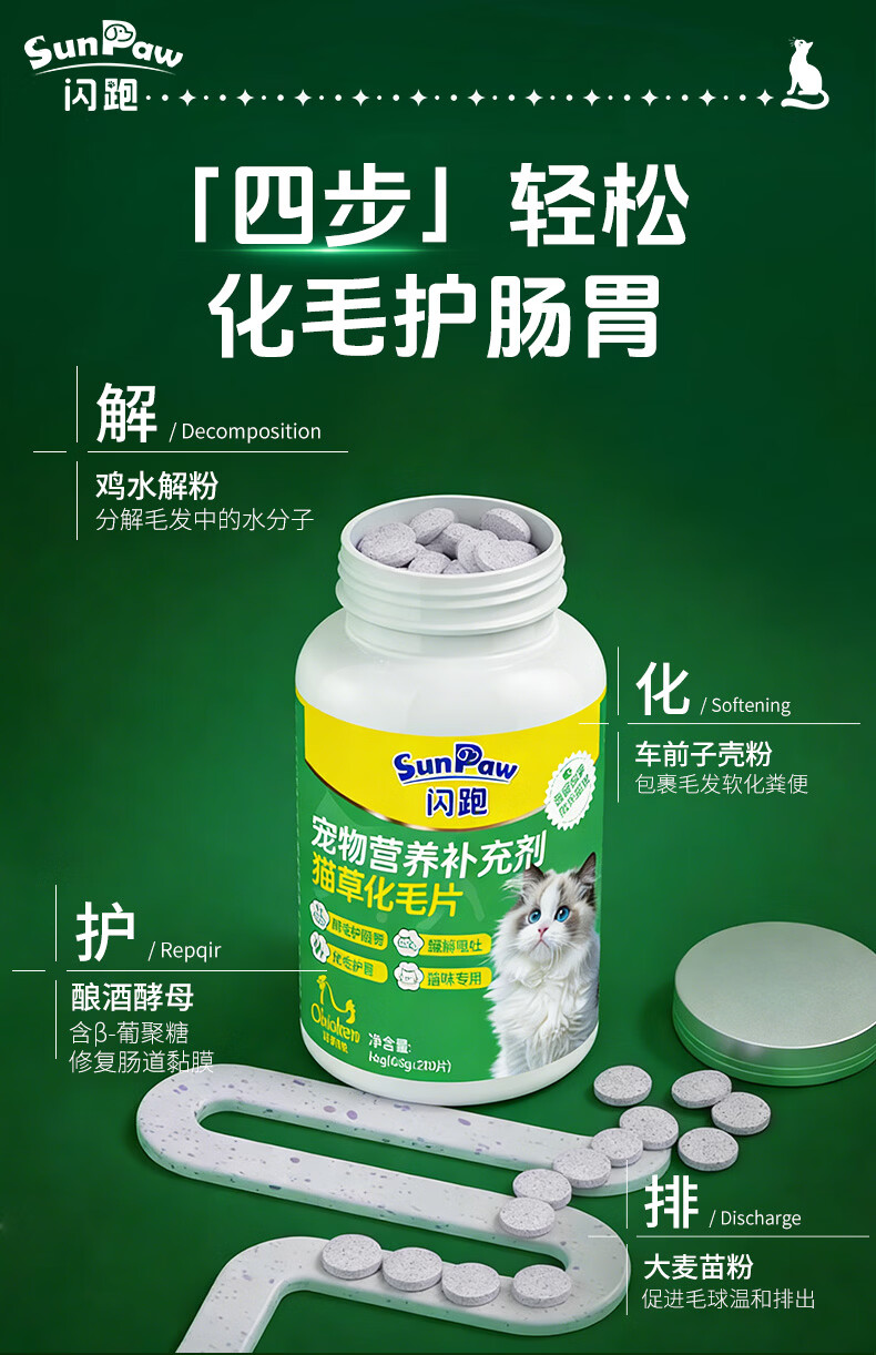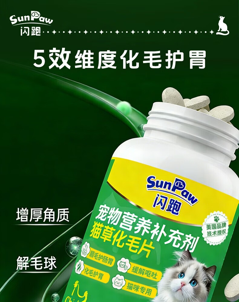 SunPaw闪跑美国猫草片化毛球片猫咪专用排除毛球调理肠胃防吐毛化毛膏 【温和排毛】化毛球片 220片*1瓶
