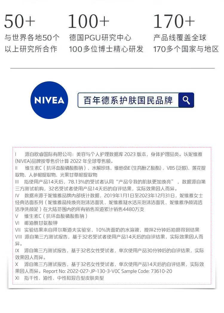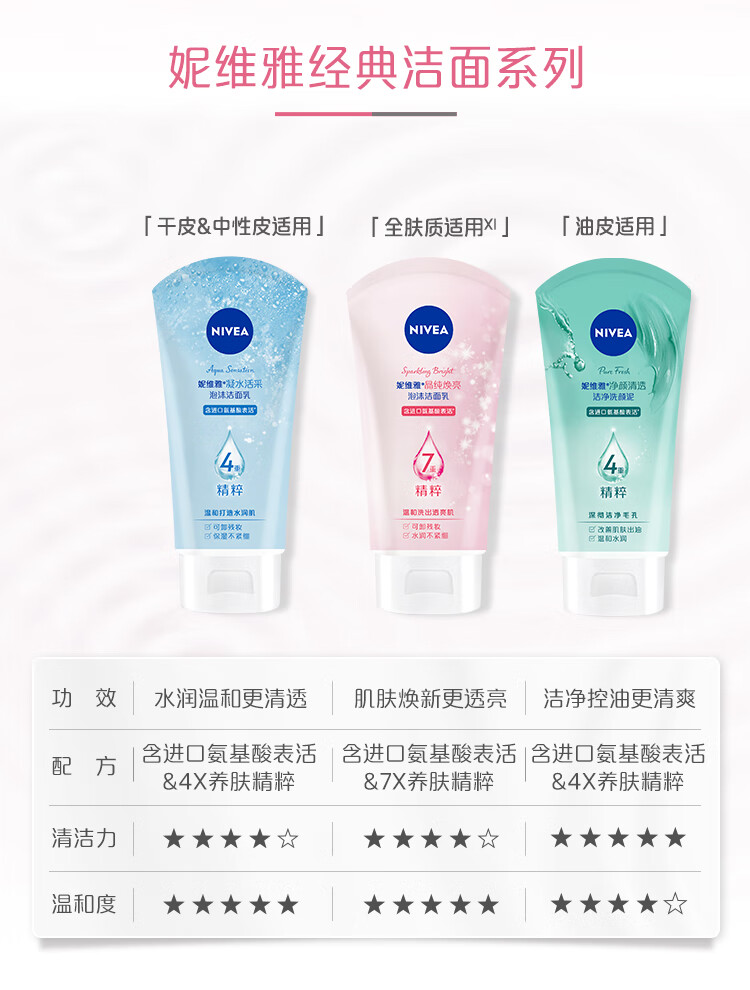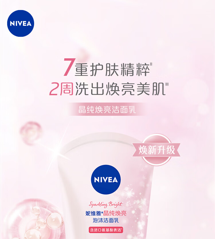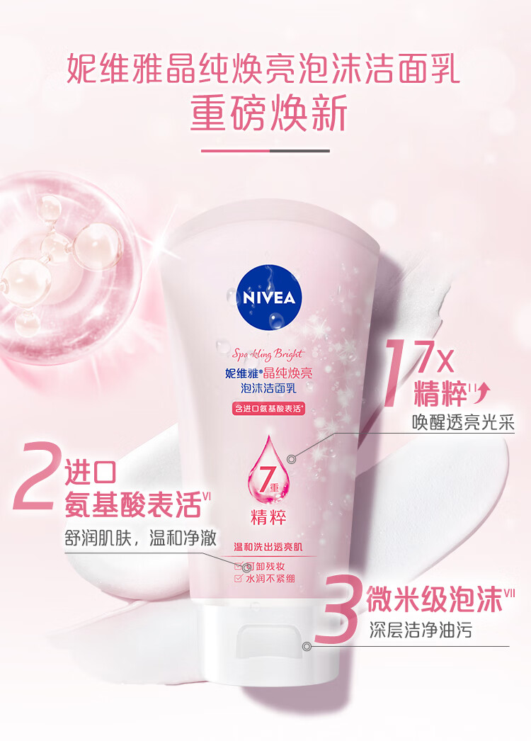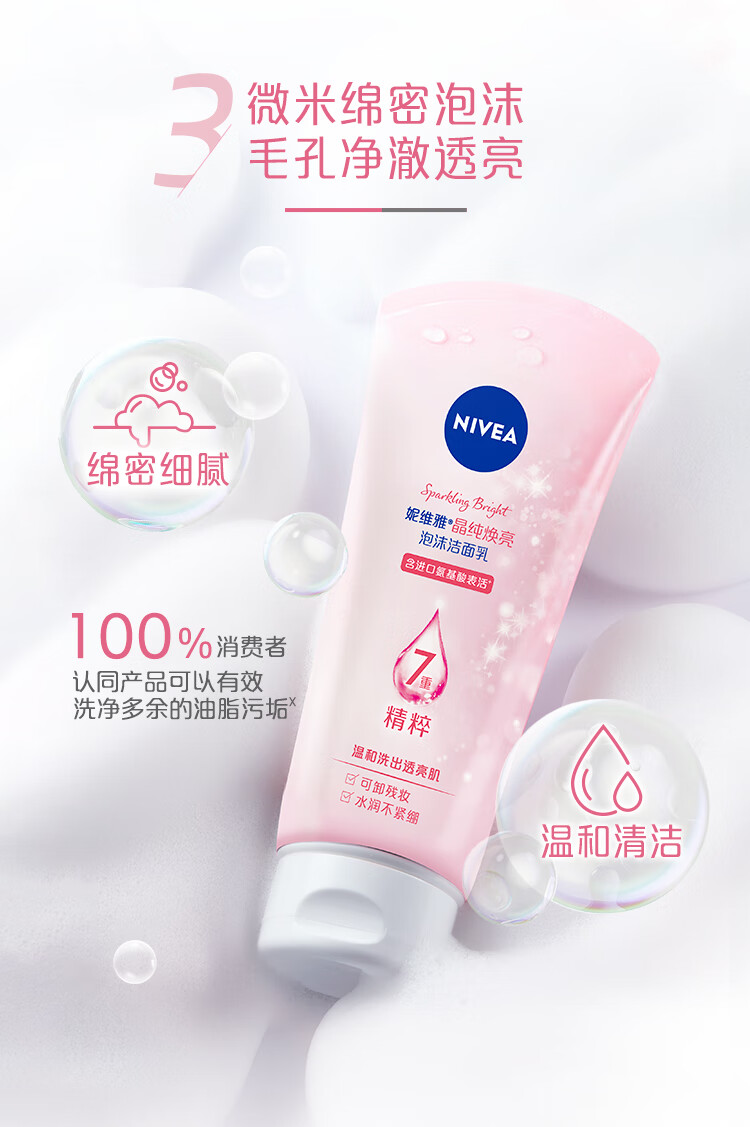 妮维雅(NIVEA)洗面奶女洗脸护肤洁面膏洁面乳提亮肤色控油学生 晶纯系列 晶纯焕亮泡沫洁面乳150g 1支装