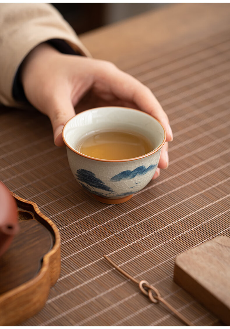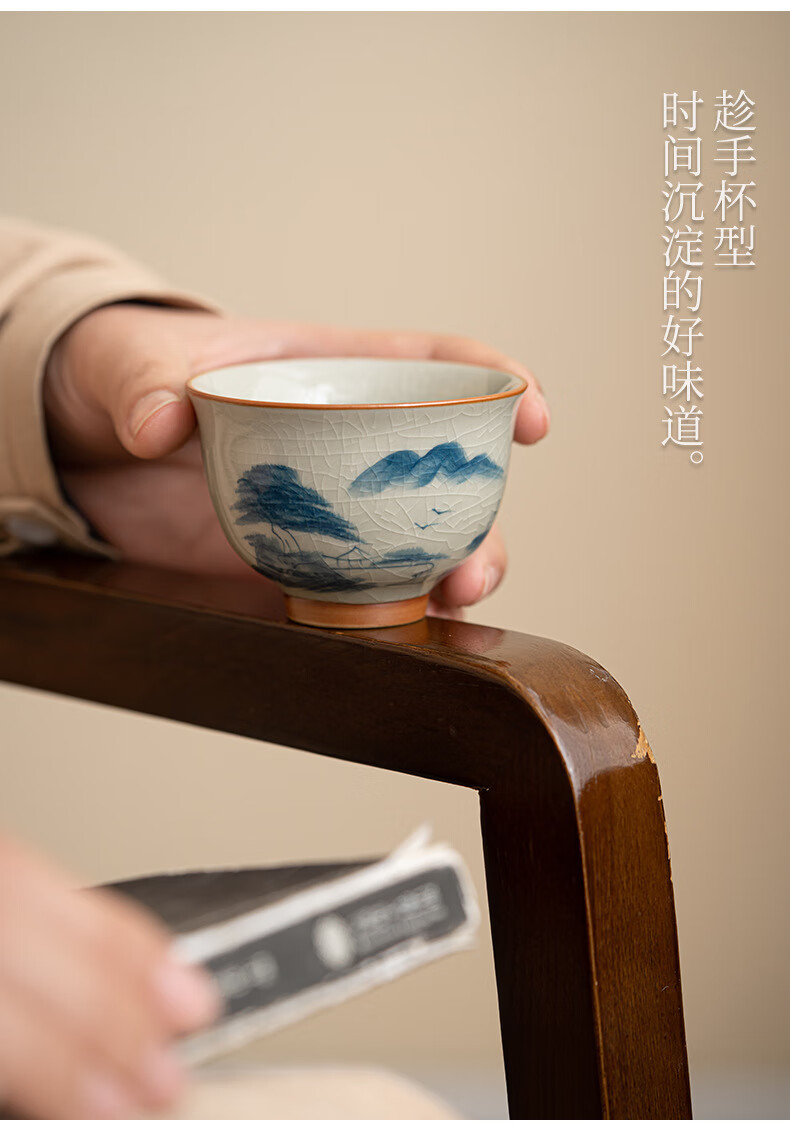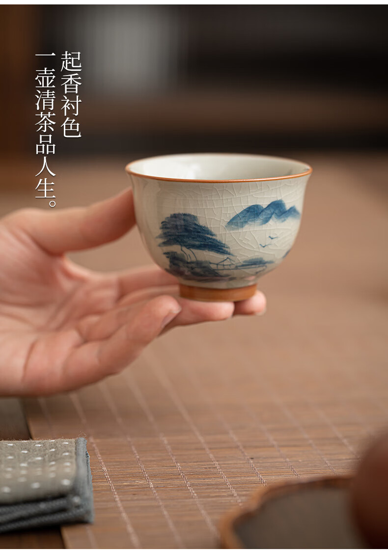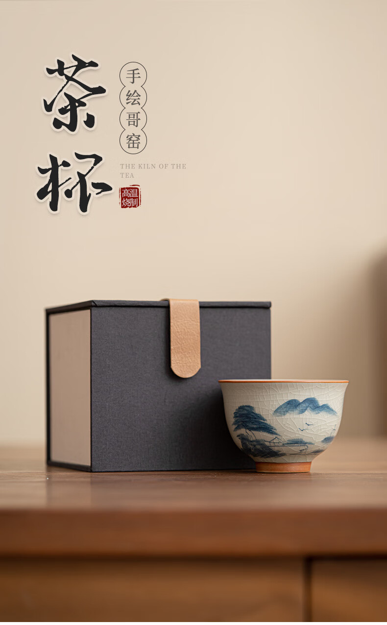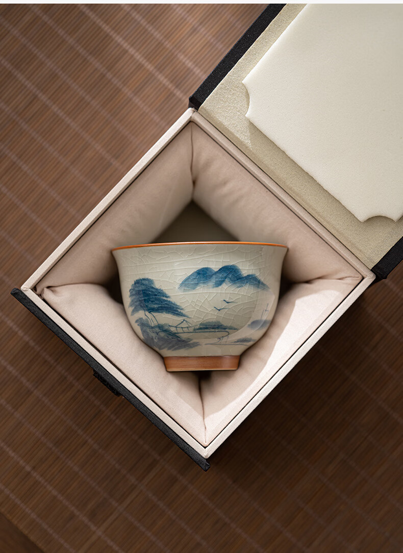 陶思想手绘哥窑茶杯功夫茶具陶瓷品茗杯家用开片釉主人杯礼盒装 哥窑手绘--碗杯【山水】礼盒装