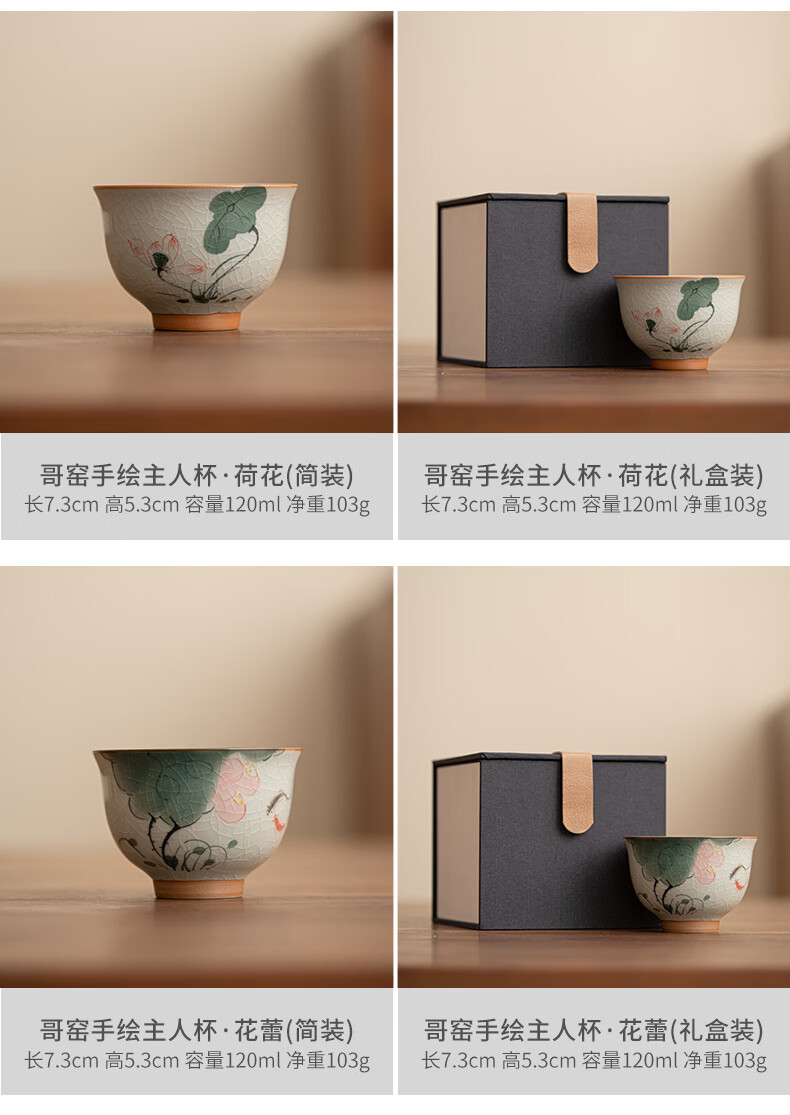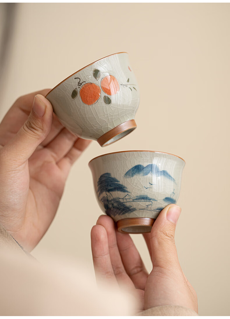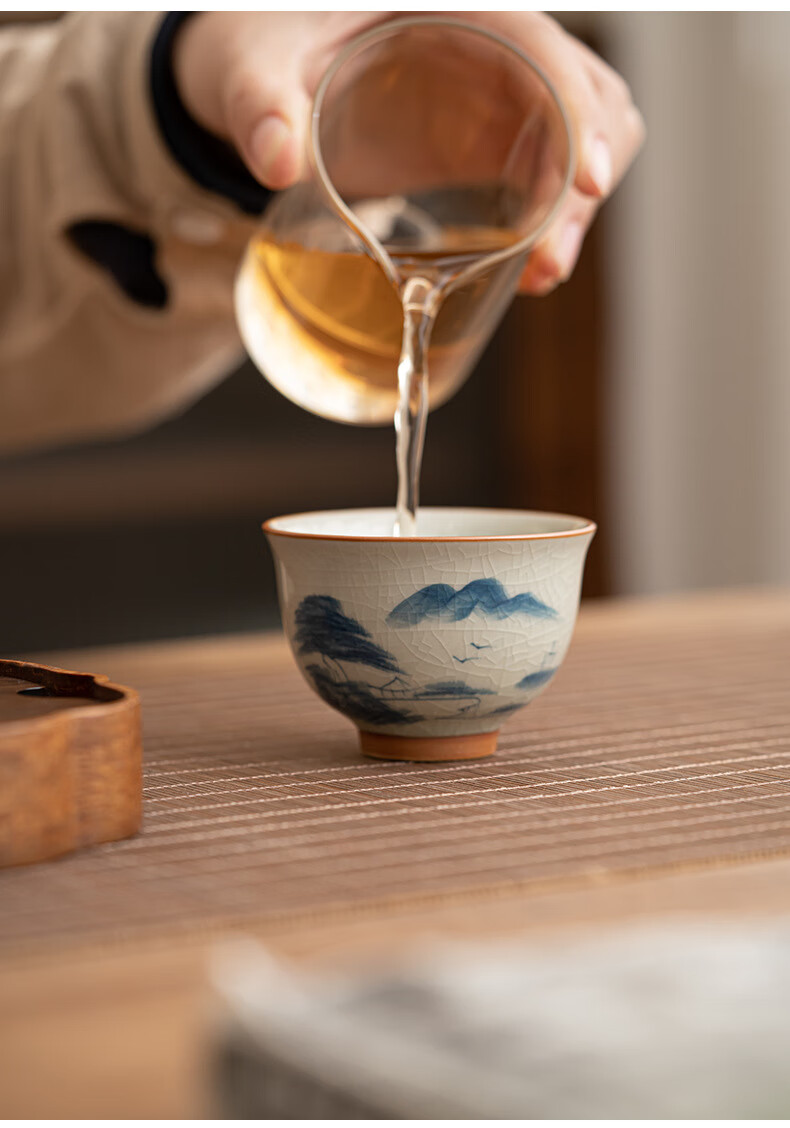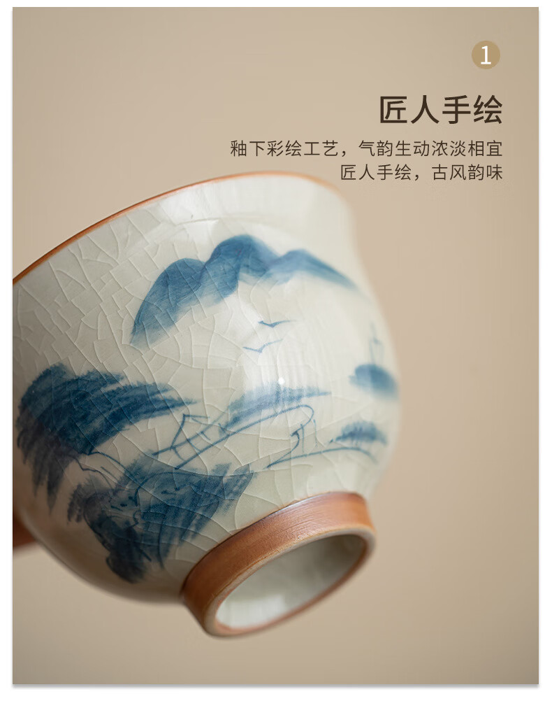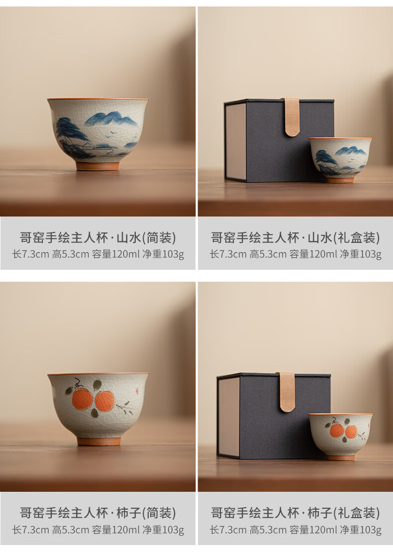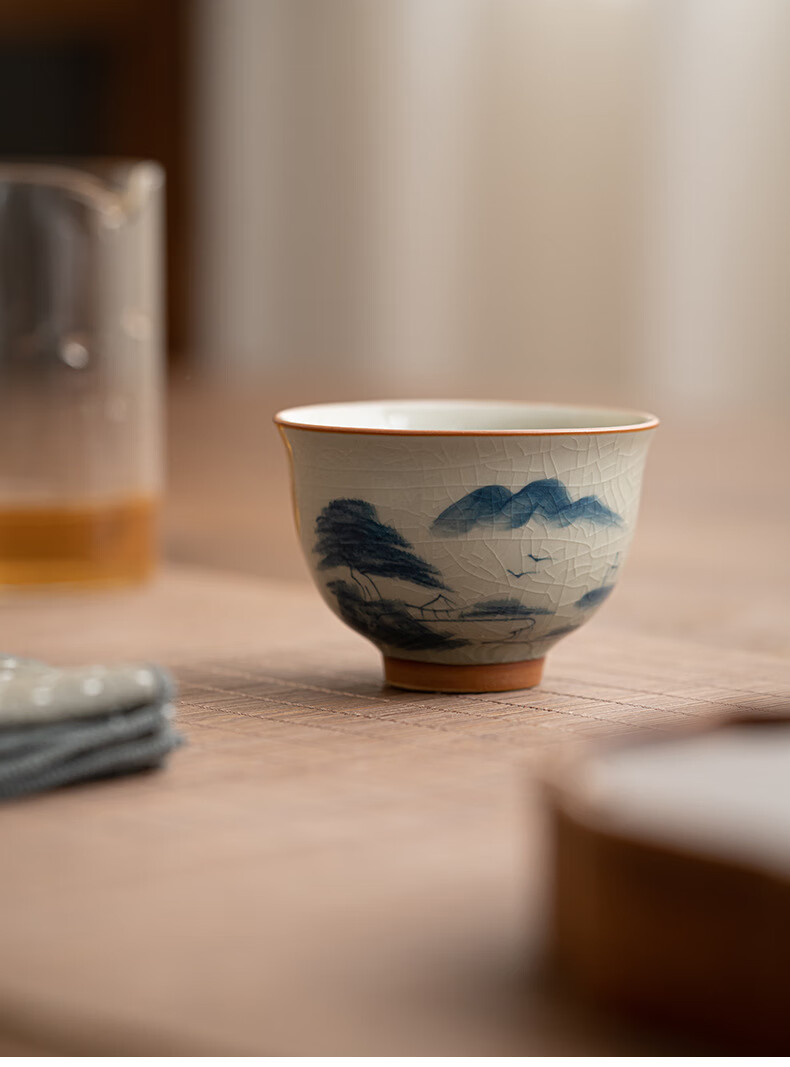 陶思想手绘哥窑茶杯功夫茶具陶瓷品茗杯家用开片釉主人杯礼盒装 哥窑手绘--碗杯【山水】礼盒装