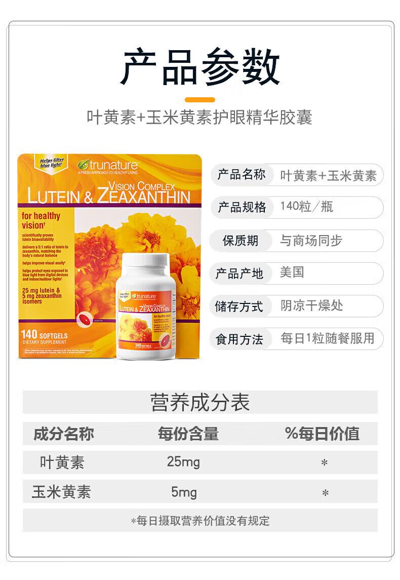 原装进口 Lutein 叶黄素玉米黄素 25mg*140粒 眼睛视力营养品 护眼叶黄素[缓解眼疲劳][140粒*1