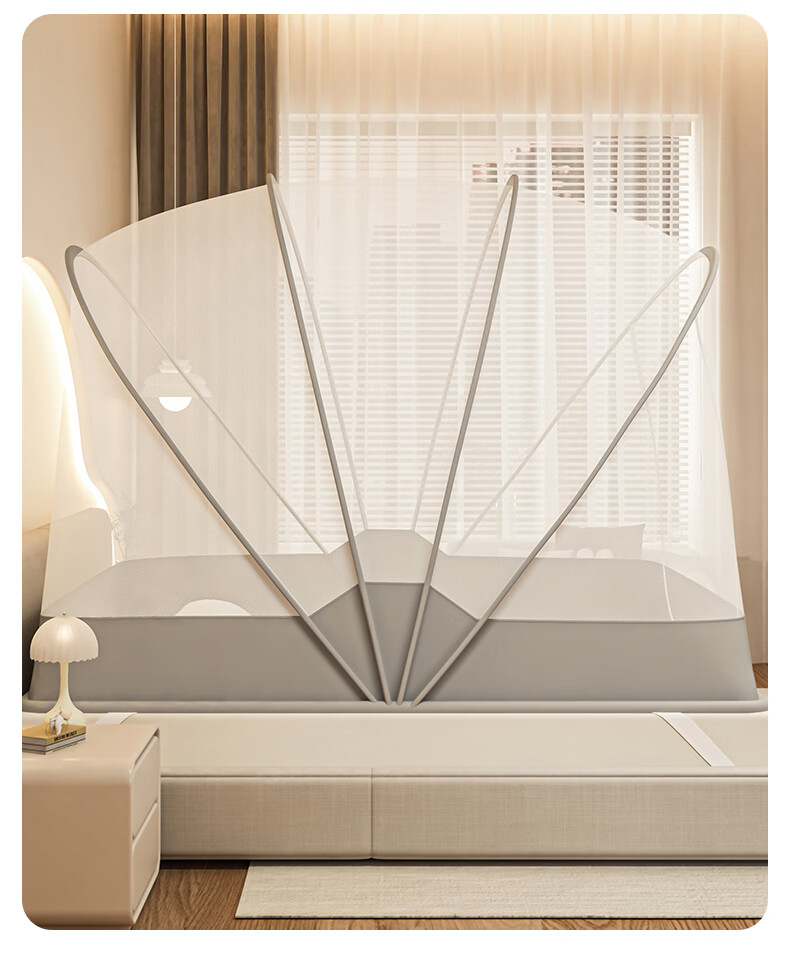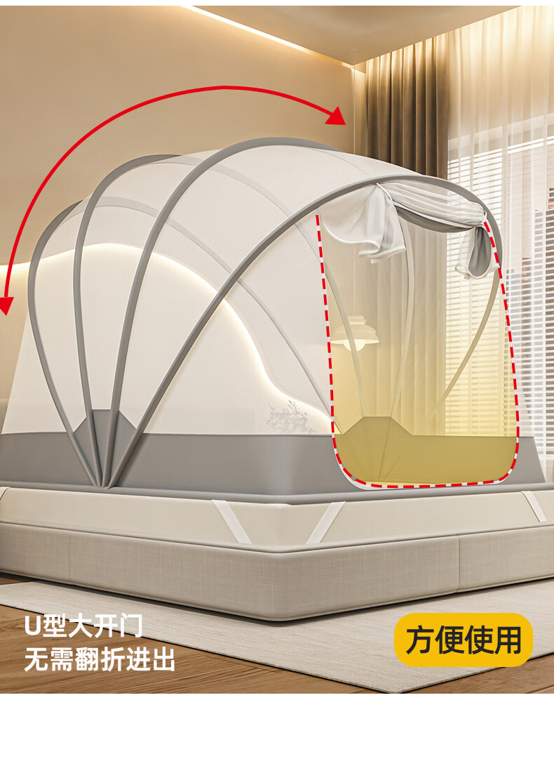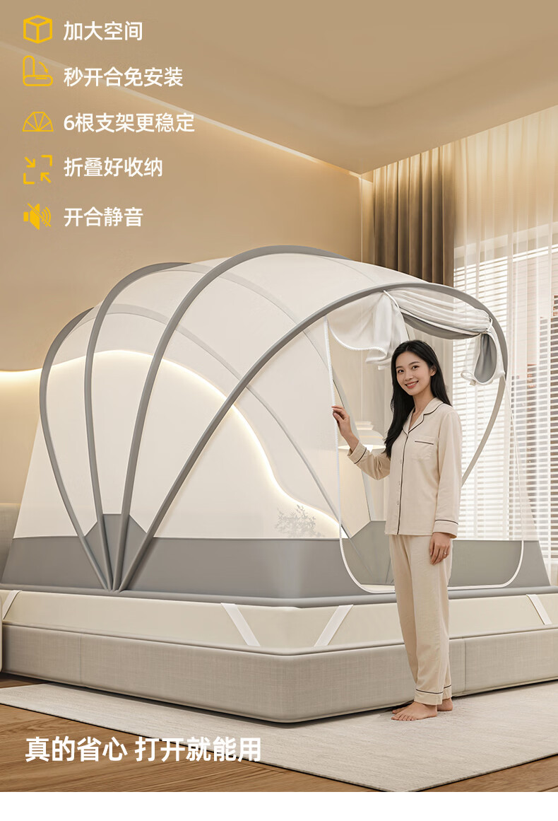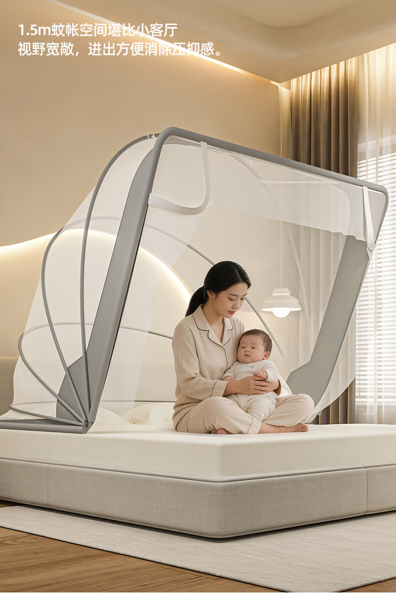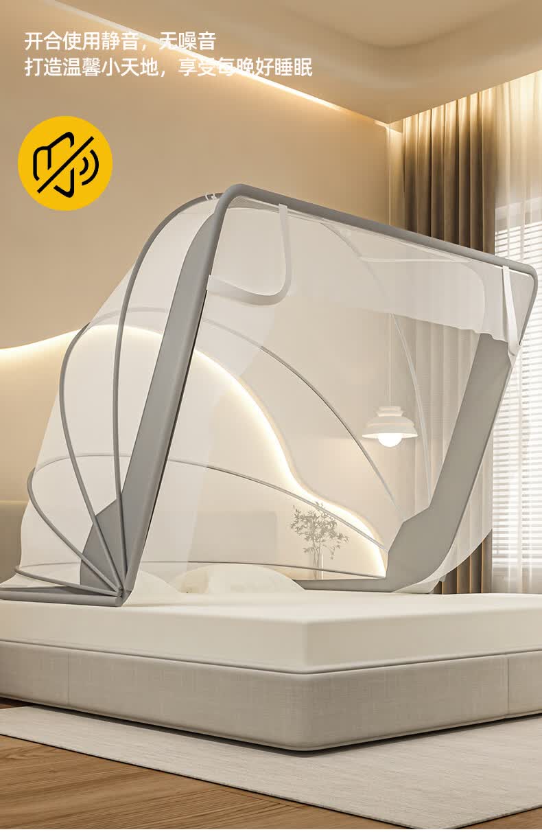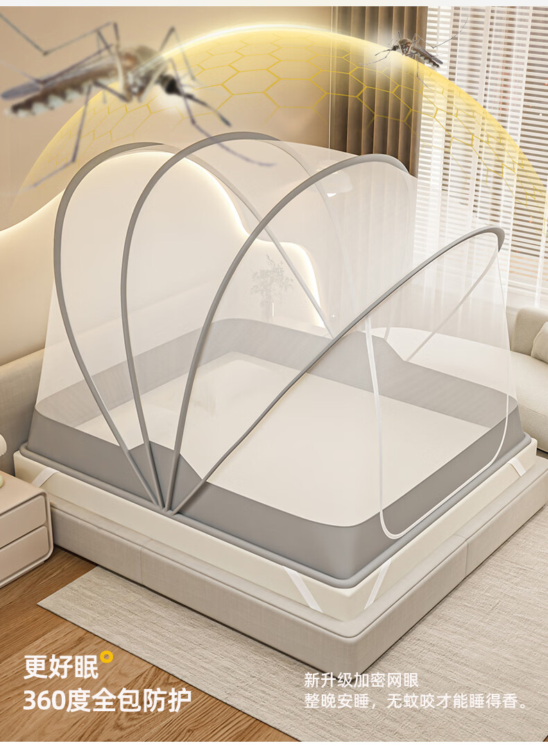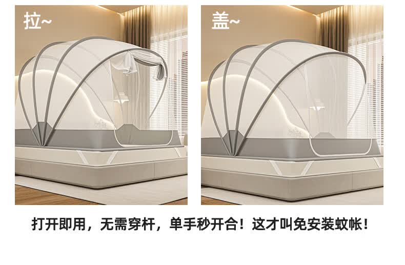 无印良品蒙古包蚊帐免安装可折叠1.5米x2米家用全包围婴儿童防摔防蚊蚊帐 浅灰色【2026升级免安装款】 135cm*190cm*150cm 适用1.5m床