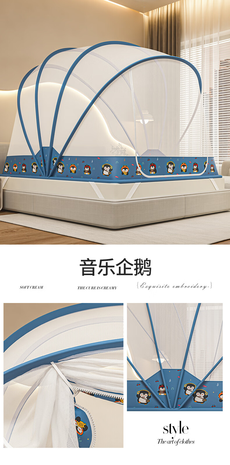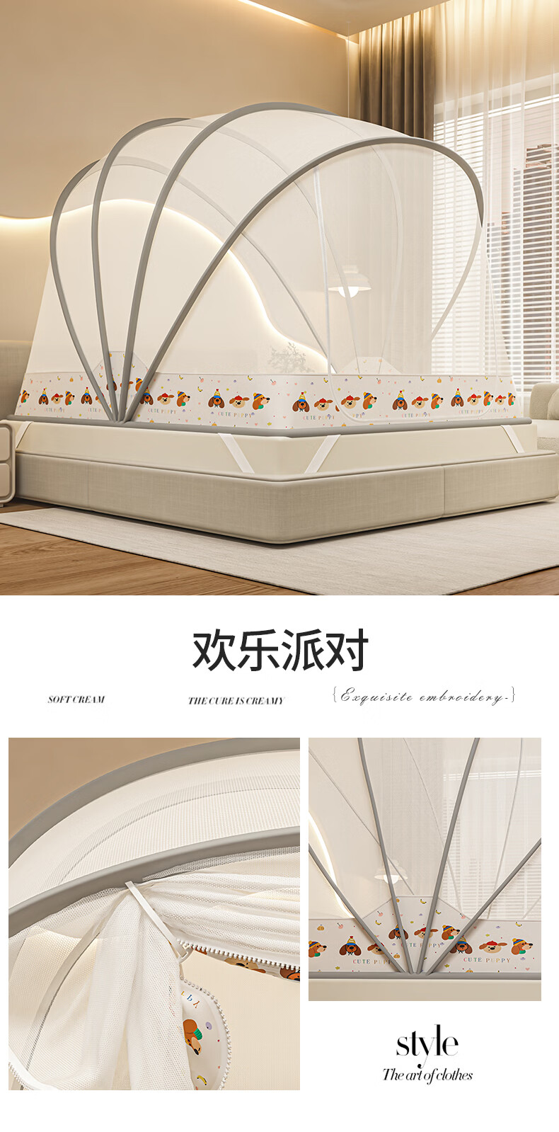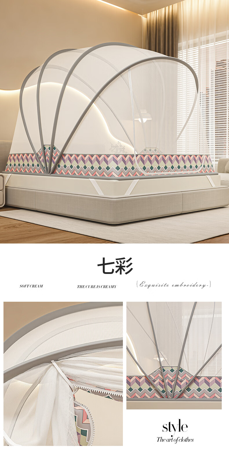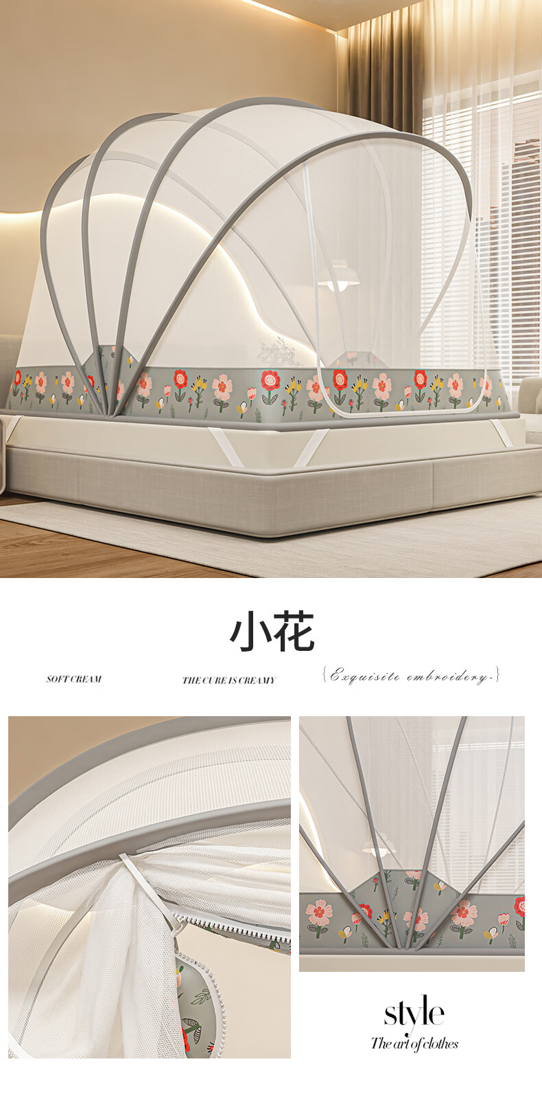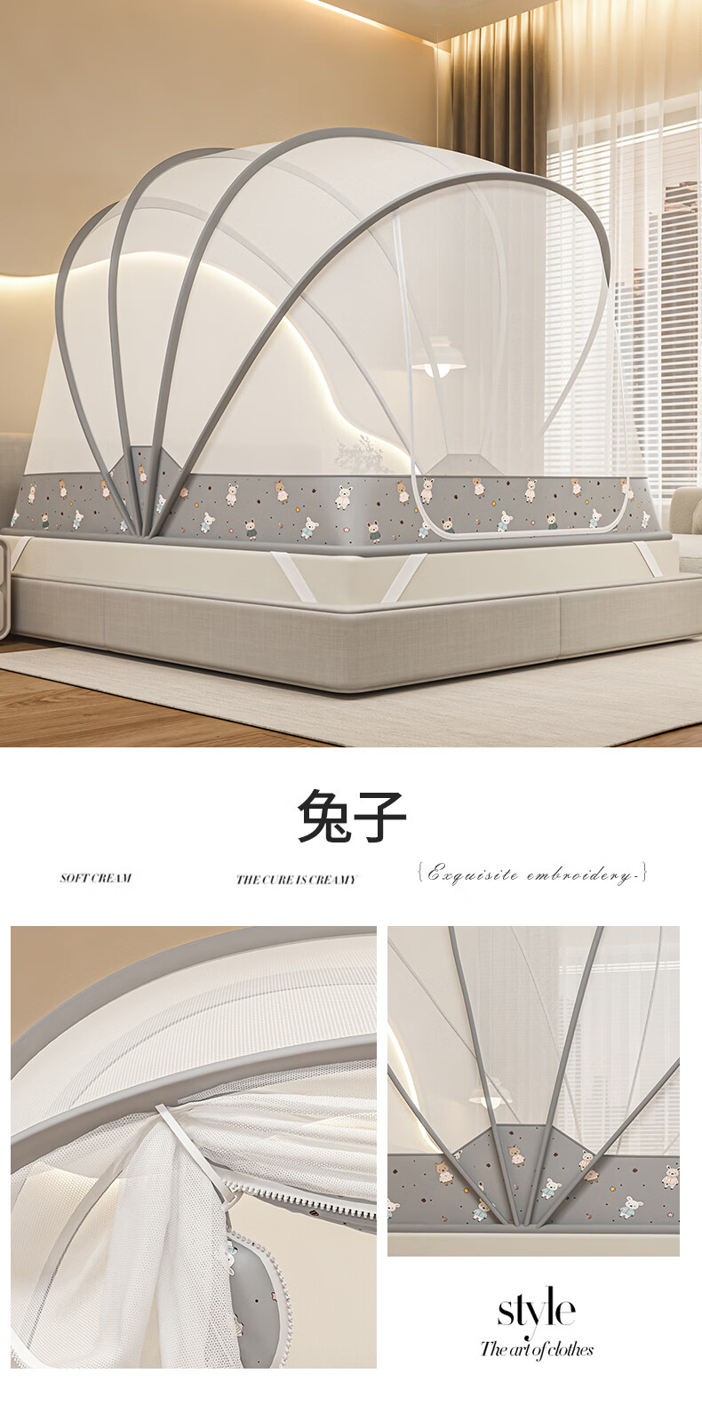 无印良品蒙古包蚊帐免安装可折叠1.5米x2米家用全包围婴儿童防摔防蚊蚊帐 浅灰色【2026升级免安装款】 135cm*190cm*150cm 适用1.5m床
