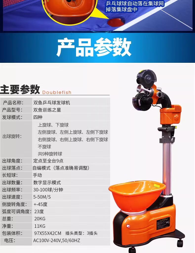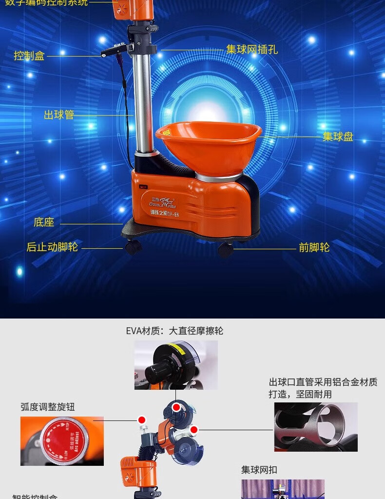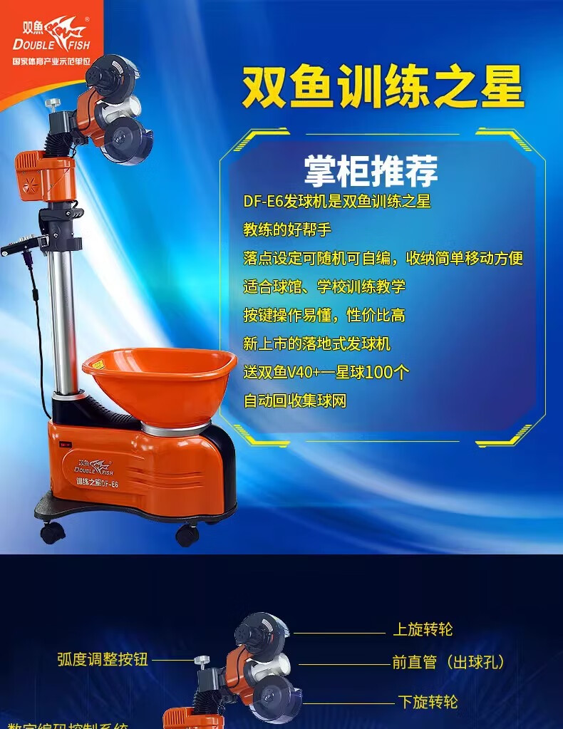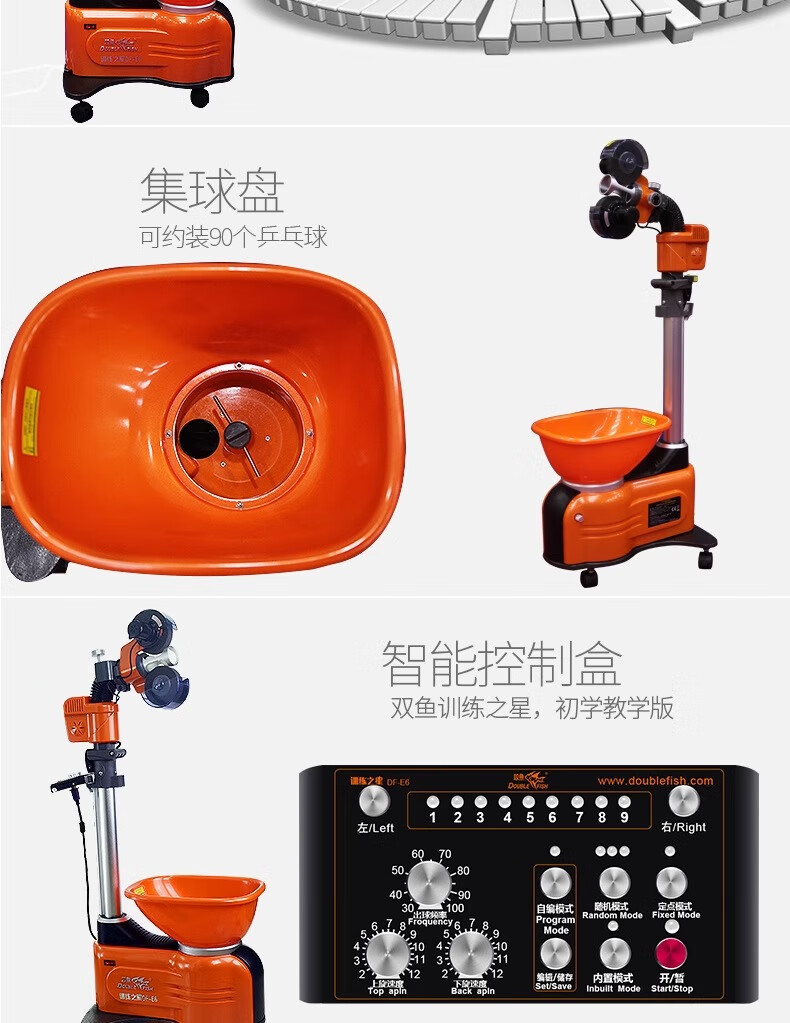 双鱼(DOUBLE FISH)E6乒乓球发球机家用自动落地式智能初学级发球器乒乓球训练器 双鱼发球机【E6训练之星落地式】送100个球+集球网