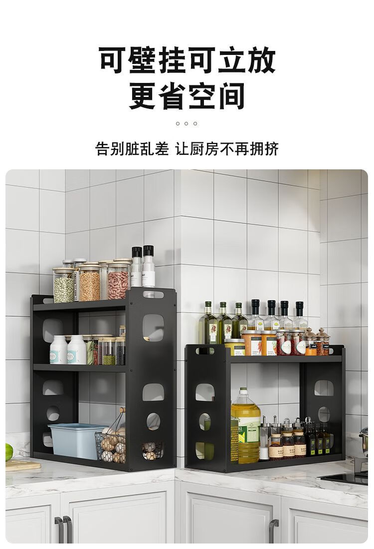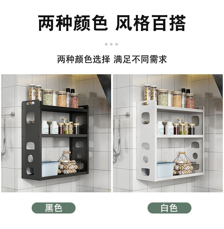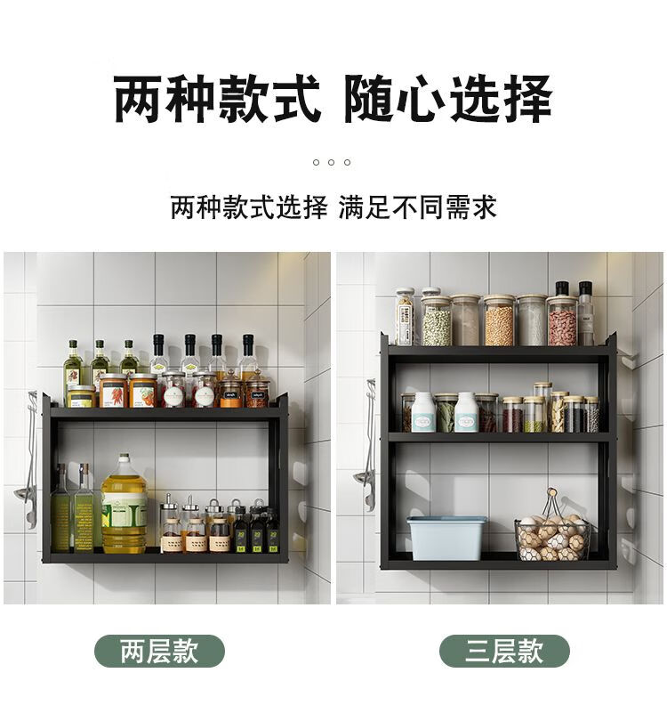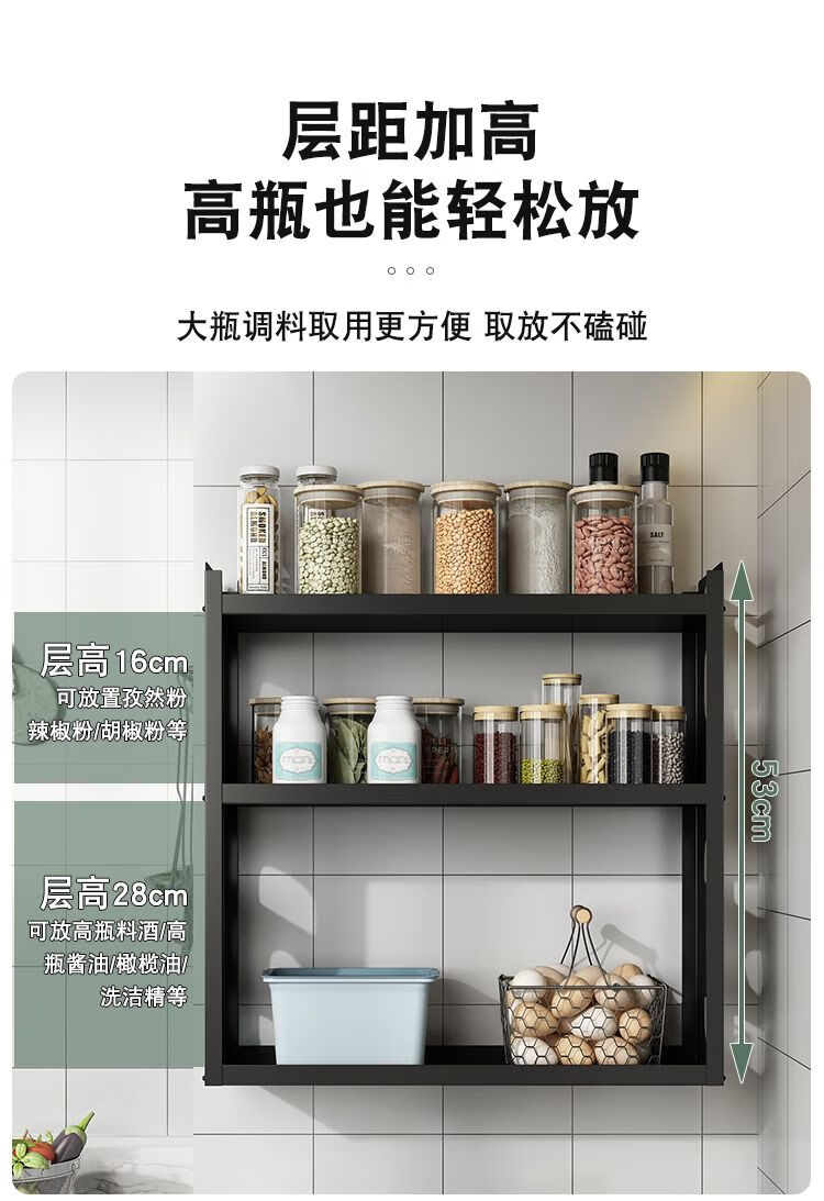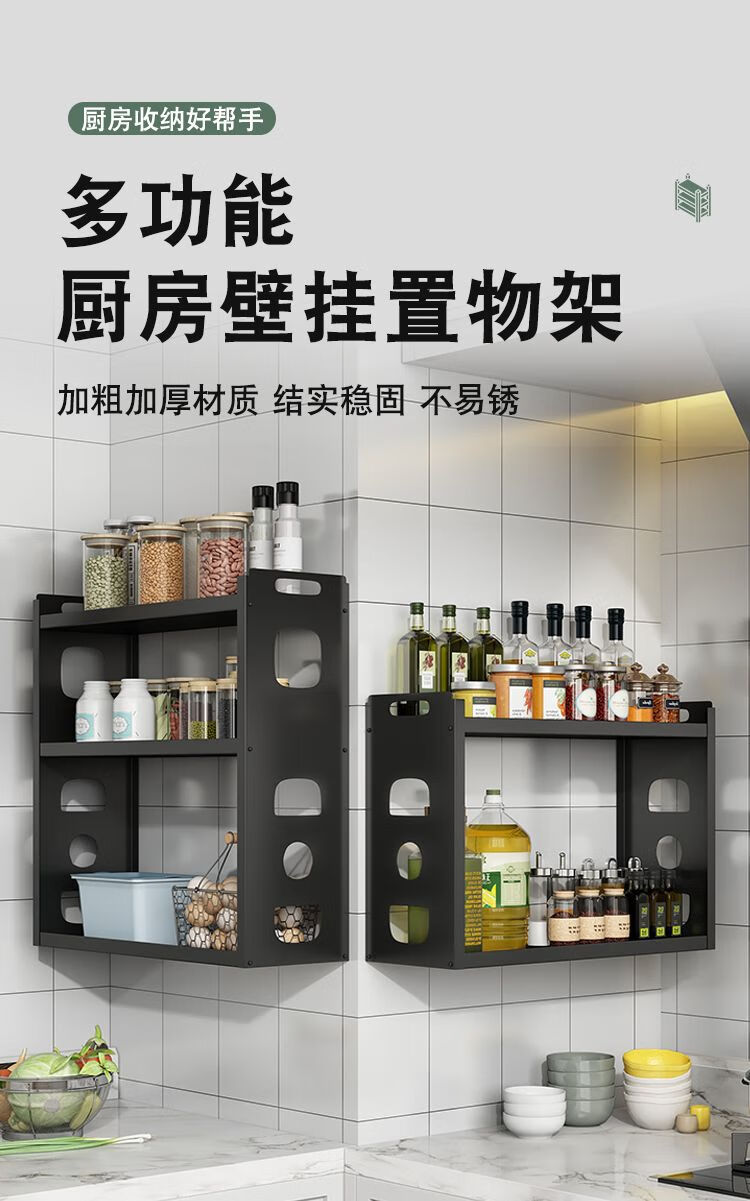 简漾家用厨房置物架壁挂壁挂式多层调料墙上油盐酱醋多功能收纳免打孔 黑色双层【免打孔】 长28【承重40斤】