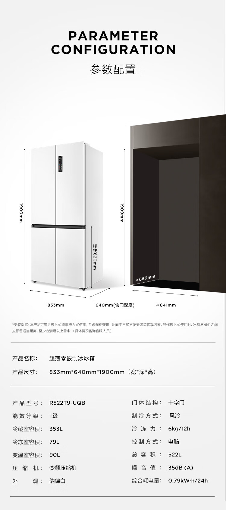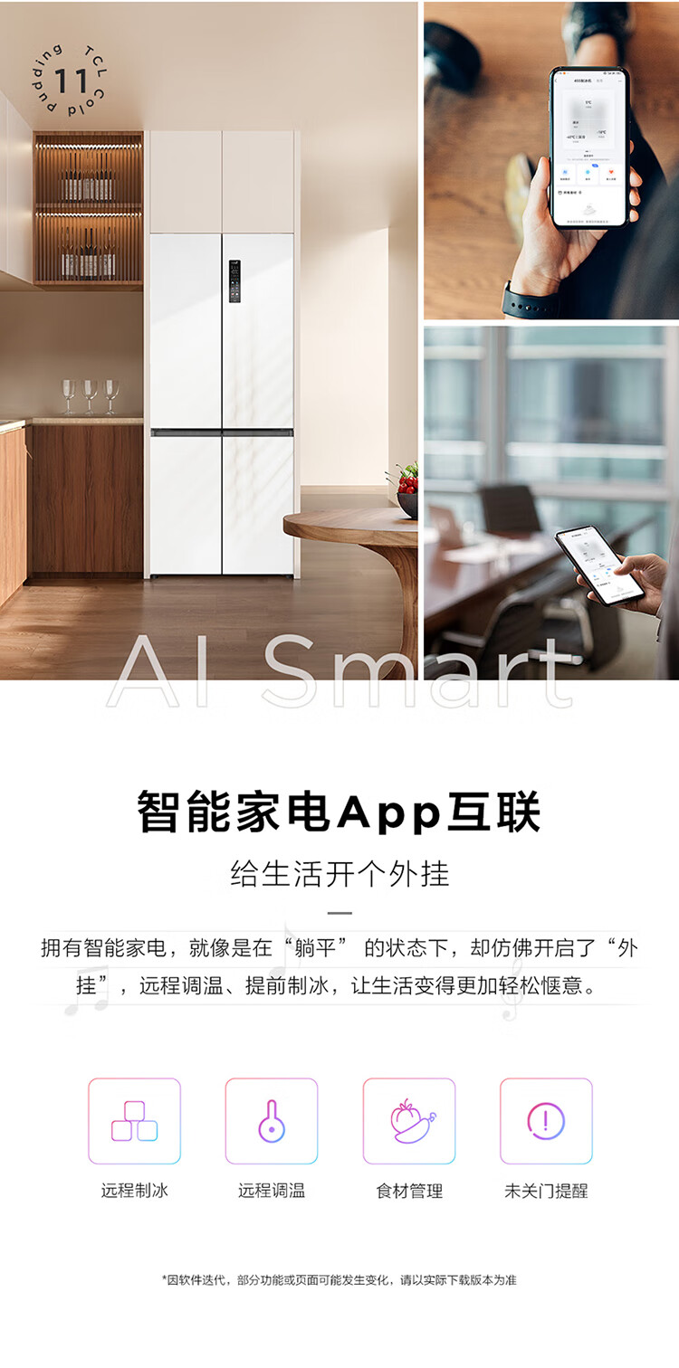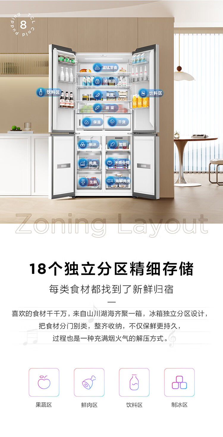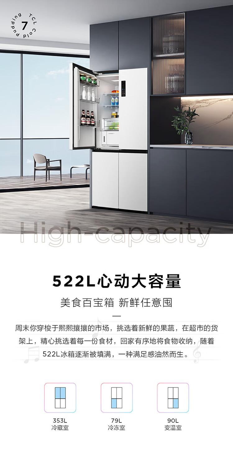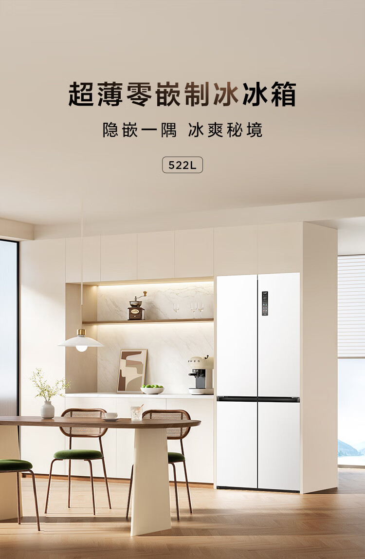 TCL522升十字对开四开门超薄零嵌大容量冰箱 全自动制冰 深冷锁鲜 家用电冰箱 以旧换新 R522T9-UQB 韵律白