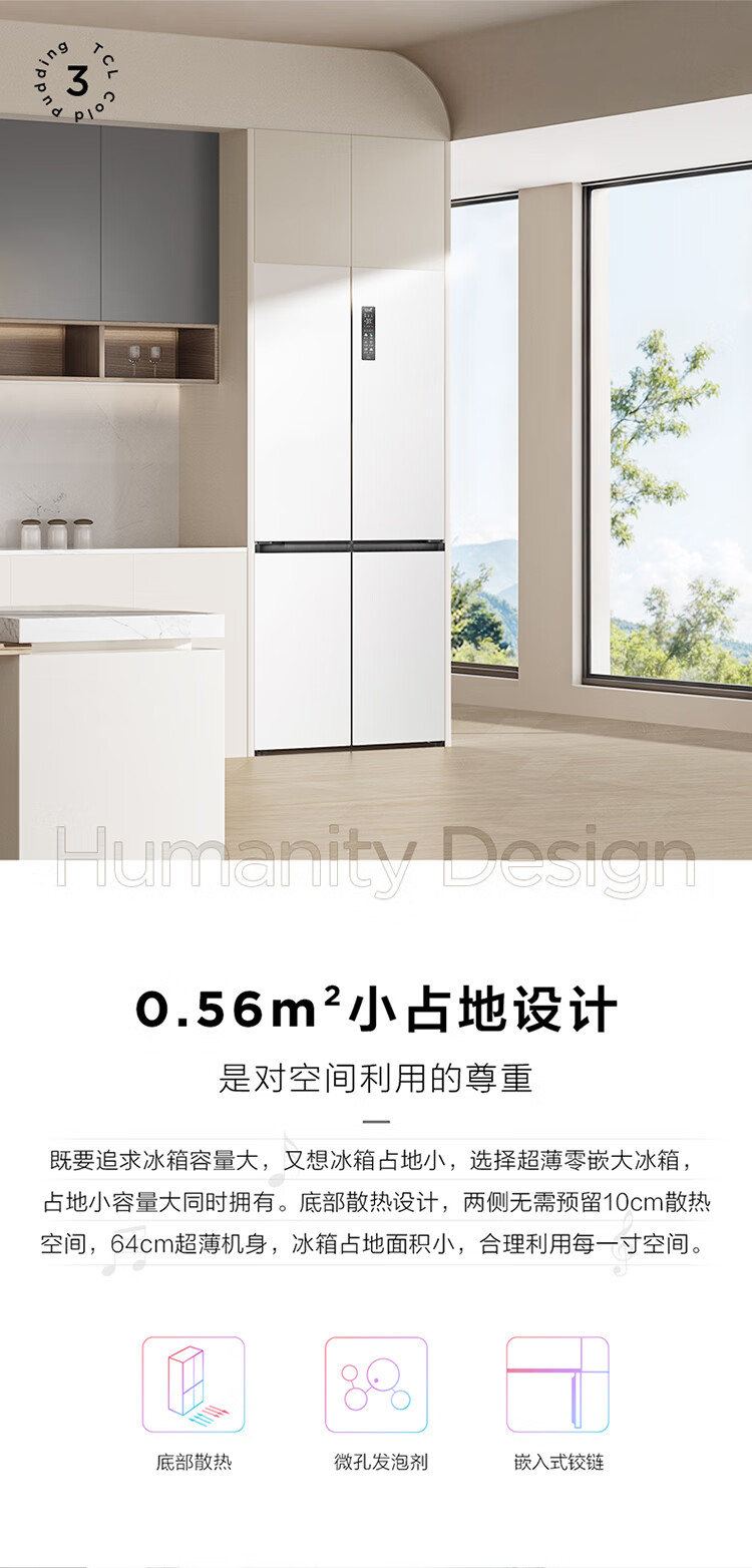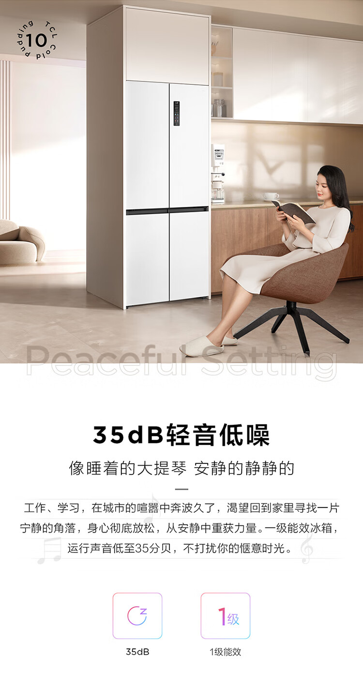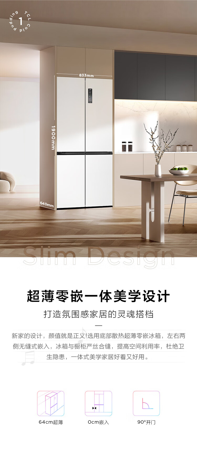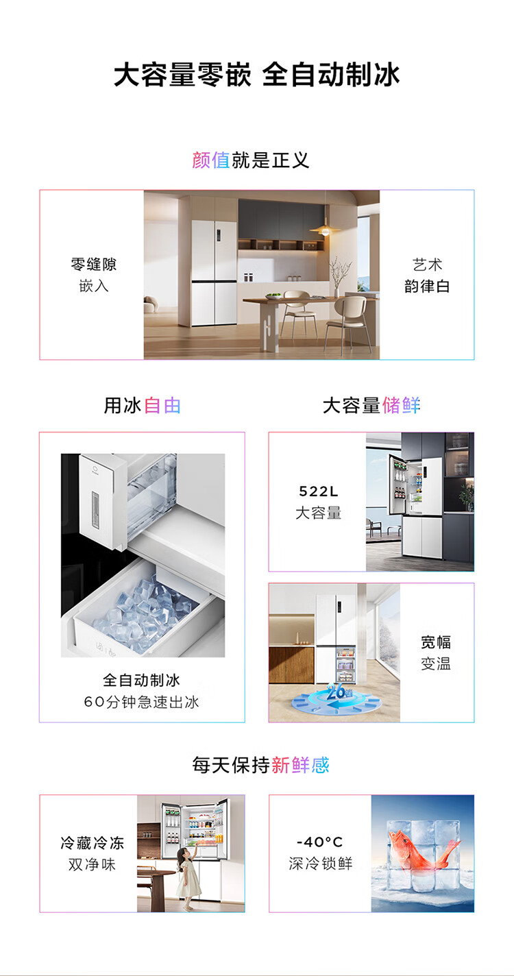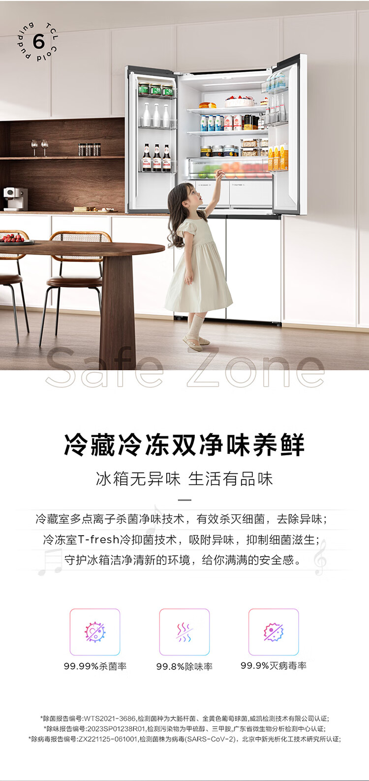 TCL522升十字对开四开门超薄零嵌大容量冰箱 全自动制冰 深冷锁鲜 家用电冰箱 以旧换新 R522T9-UQB 韵律白