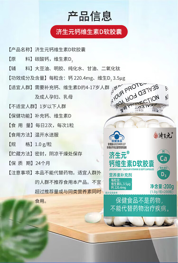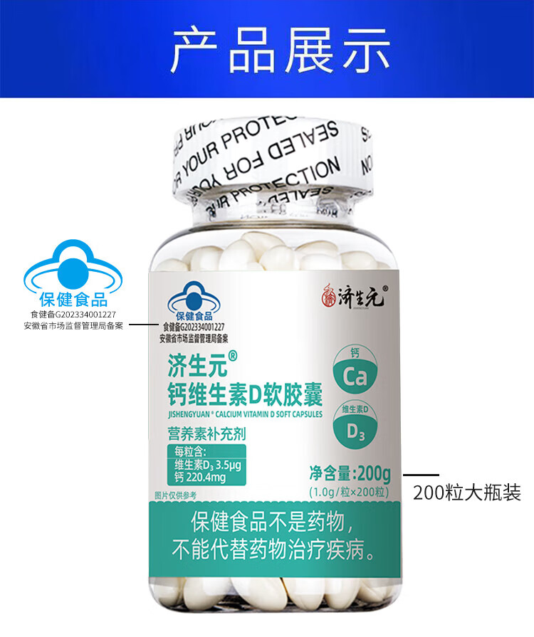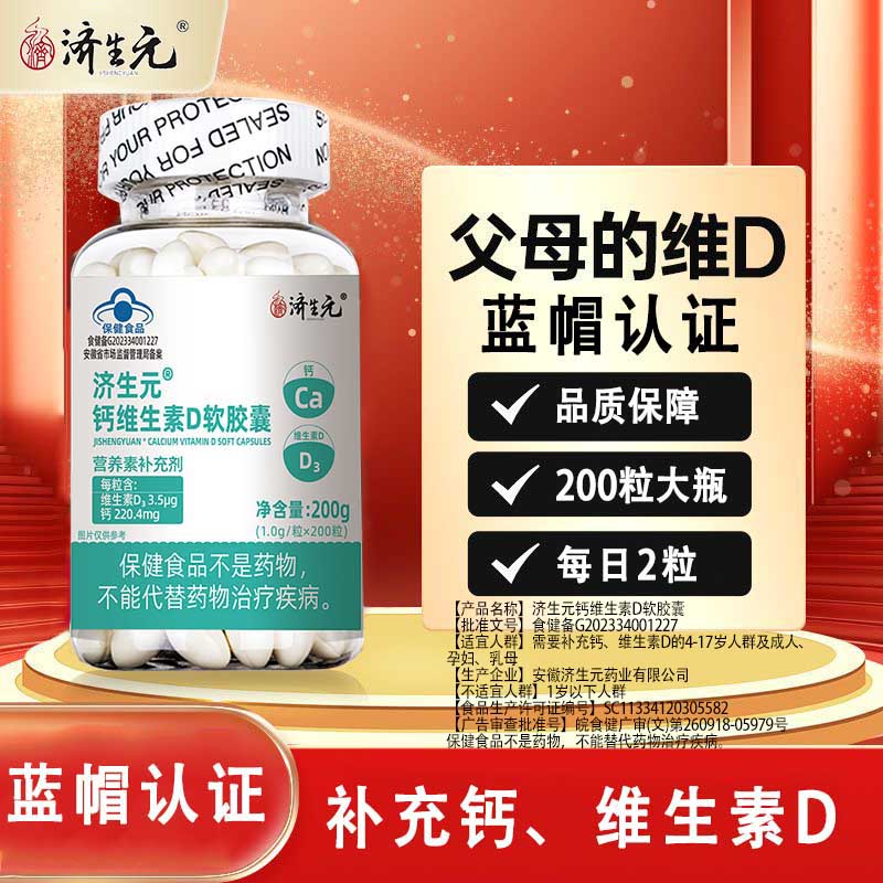 济生元钙维生素D3软胶囊200粒无糖液体钙营养素补充剂蓝帽补钙补维生素 钙维生素D3软胶囊 200粒*1瓶 三瓶:共600粒-营养素补充剂