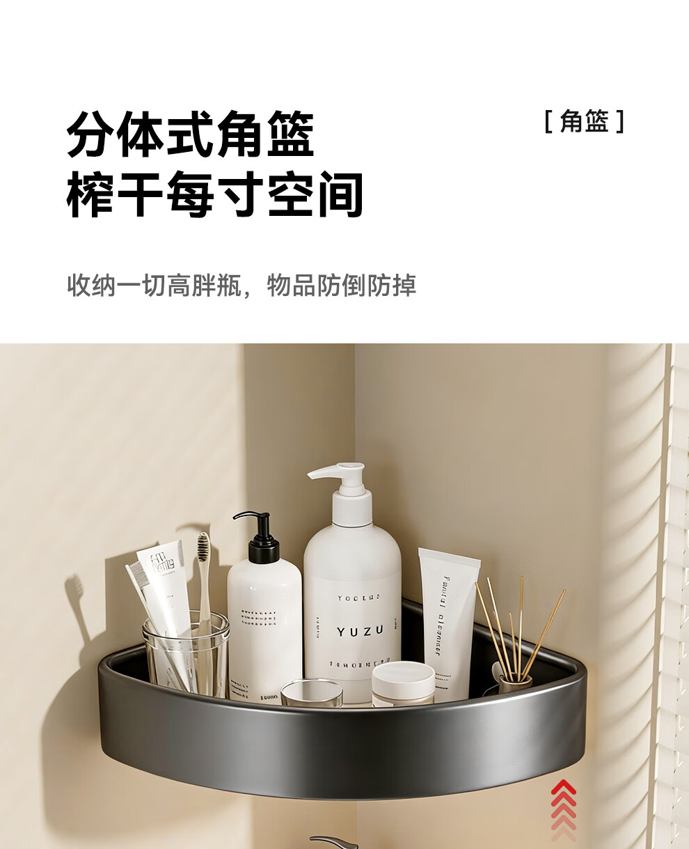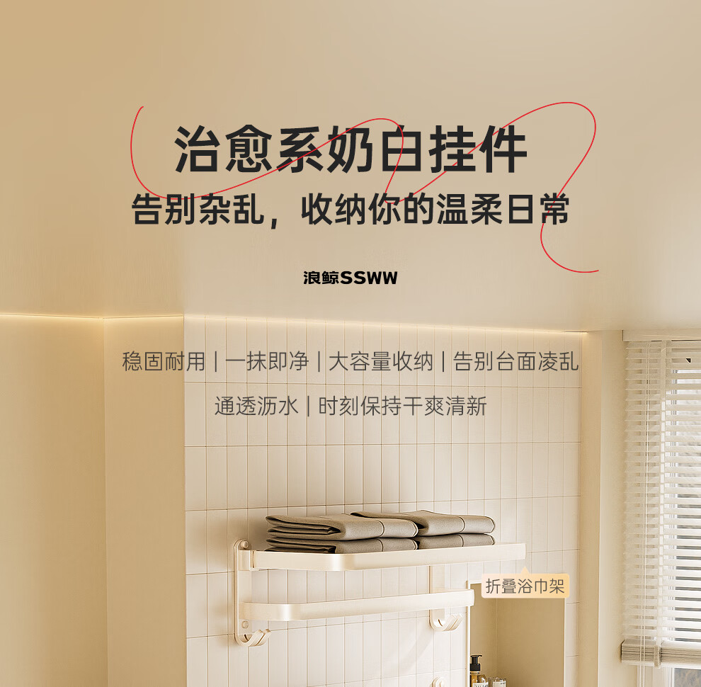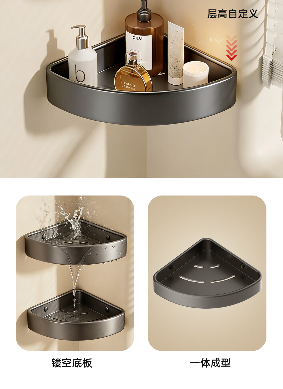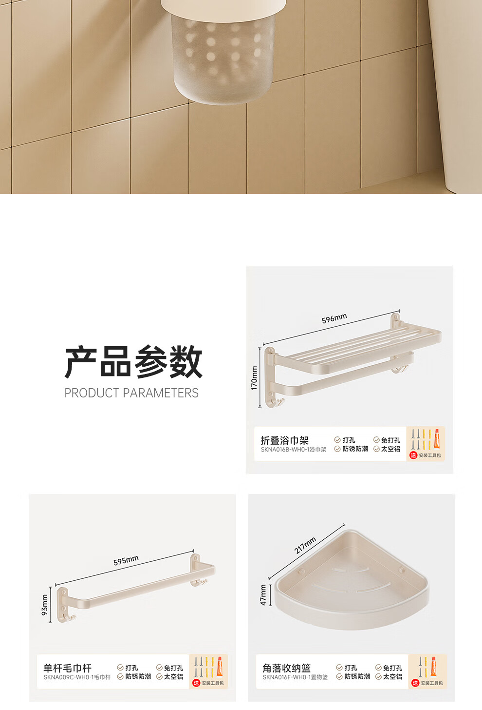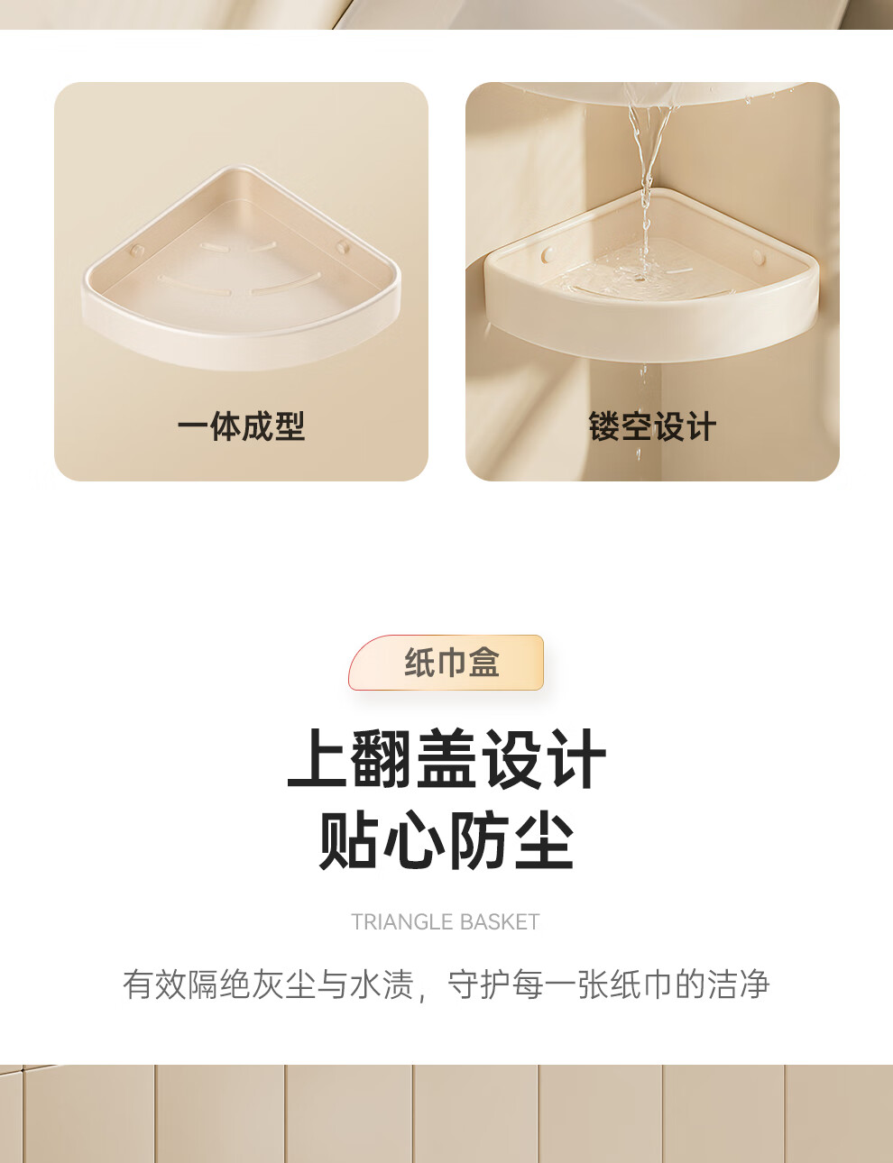 浪鲸(SSWW)卫浴免打孔太空铝吸盘毛巾架置物架折叠浴巾架浴室用品壁挂式挂件 【奶白】单层三角收纳篮