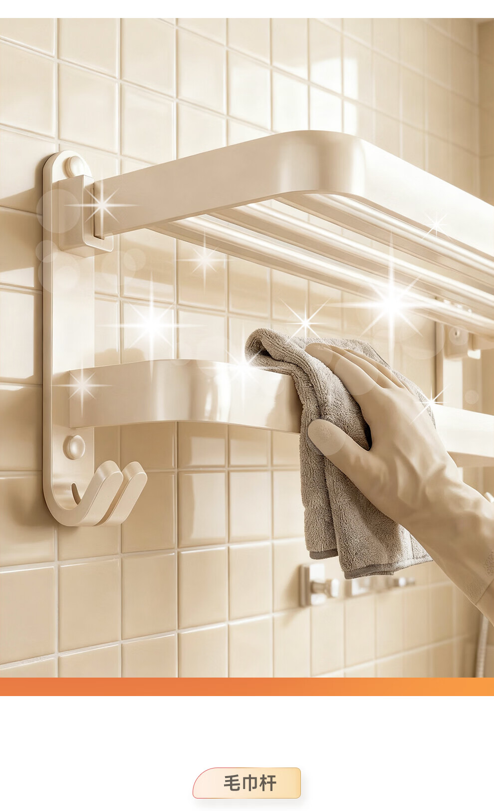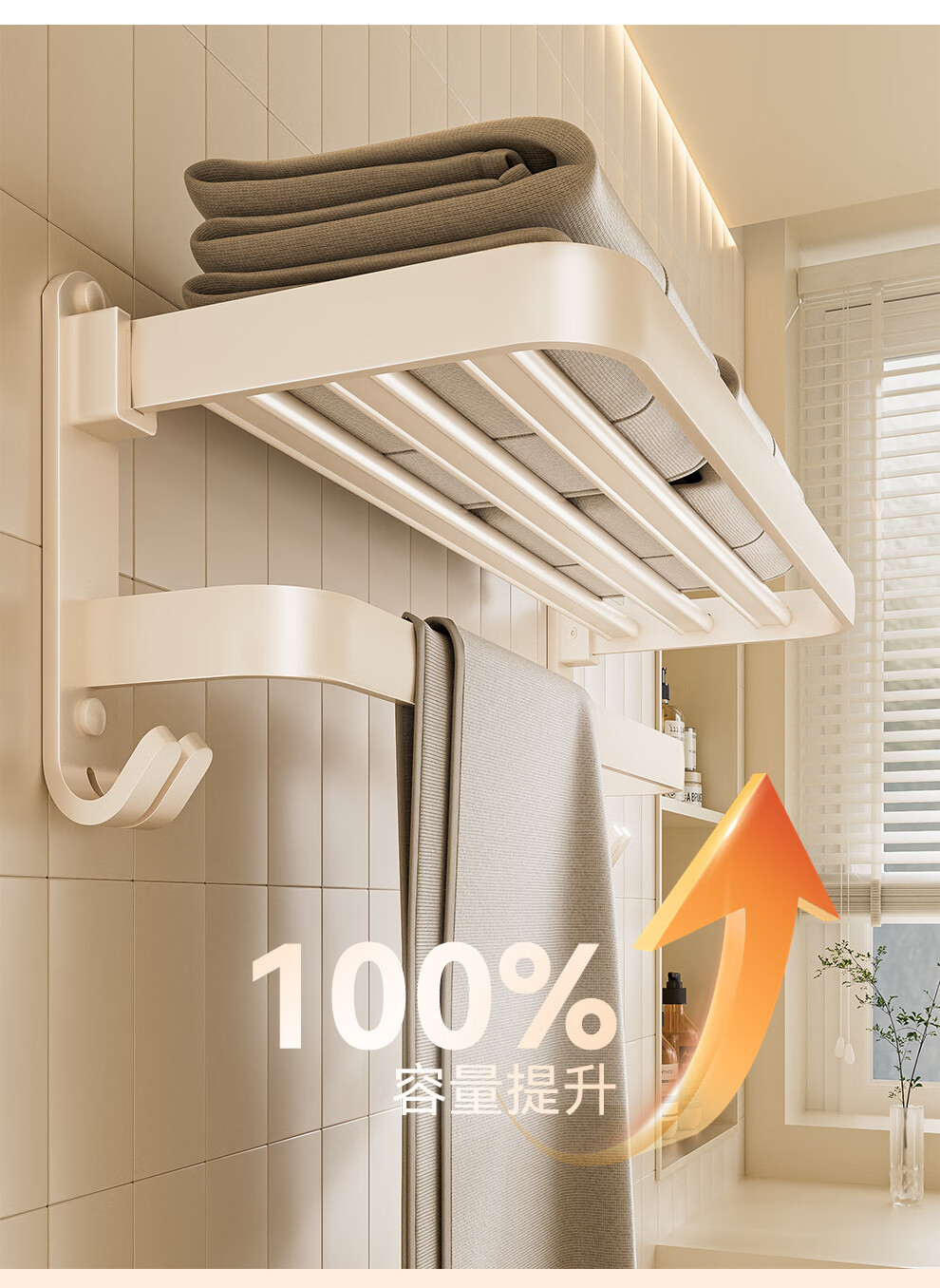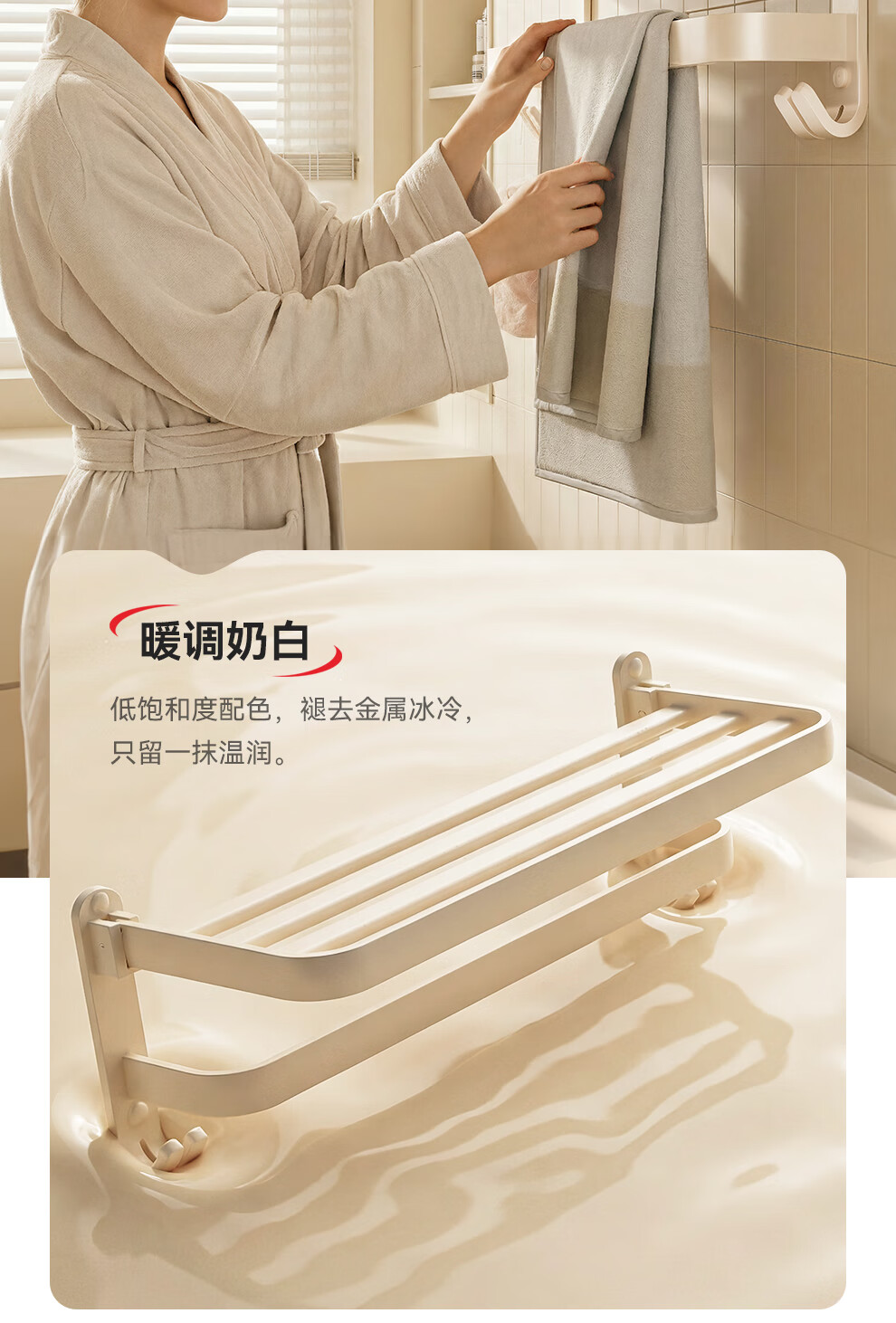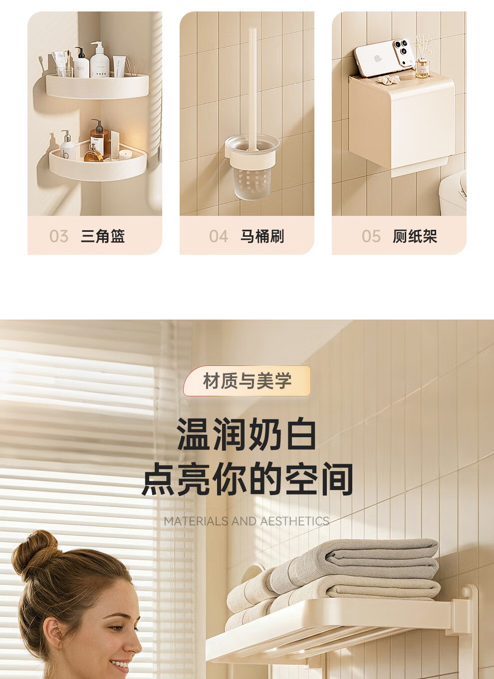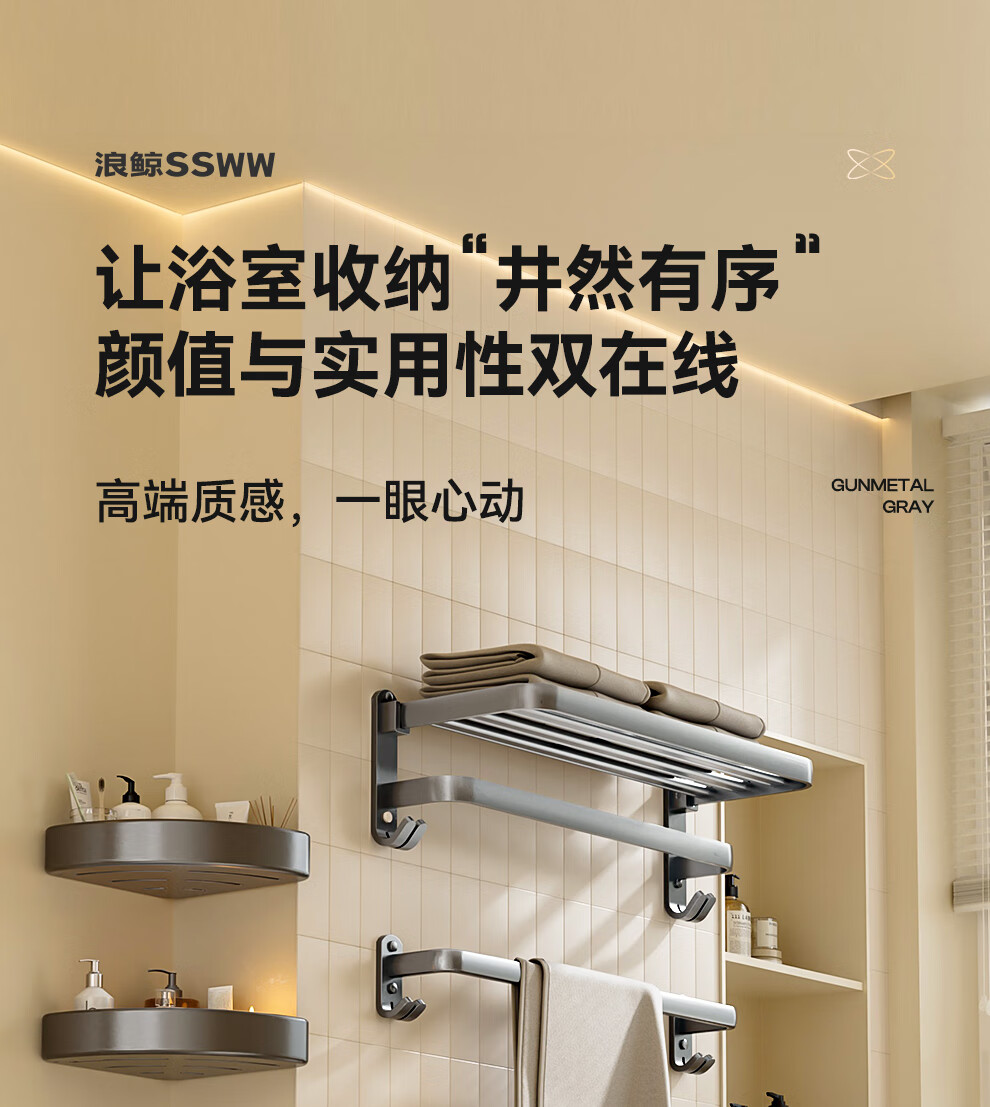 浪鲸(SSWW)卫浴免打孔太空铝吸盘毛巾架置物架折叠浴巾架浴室用品壁挂式挂件 【奶白】单层三角收纳篮