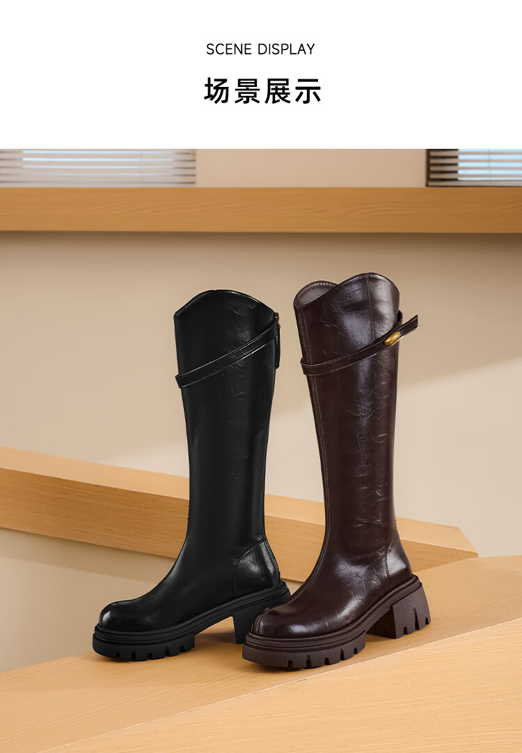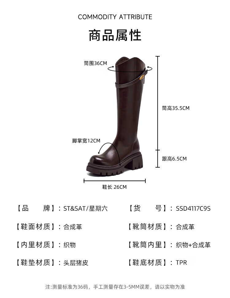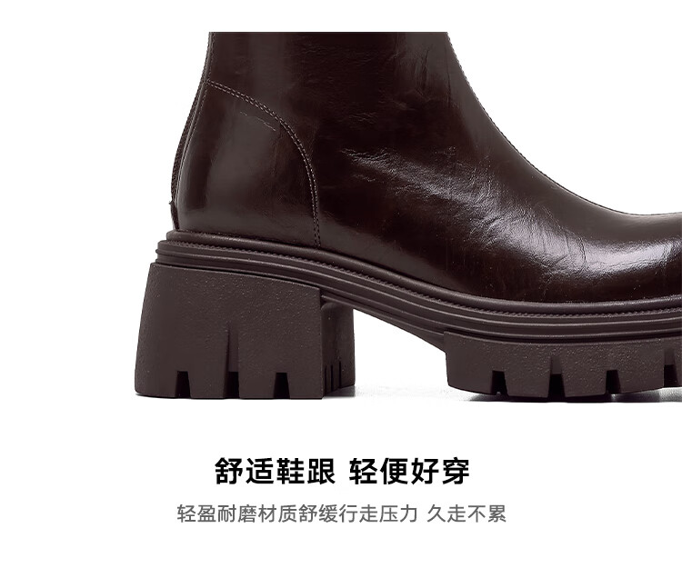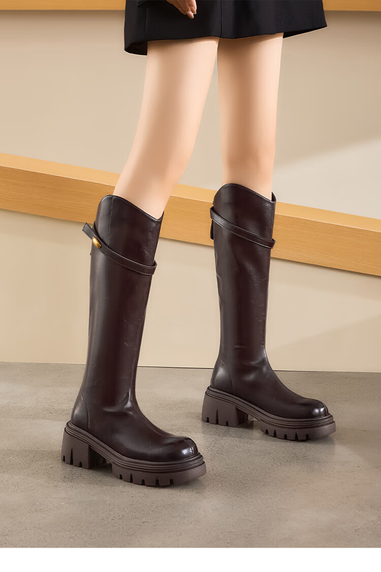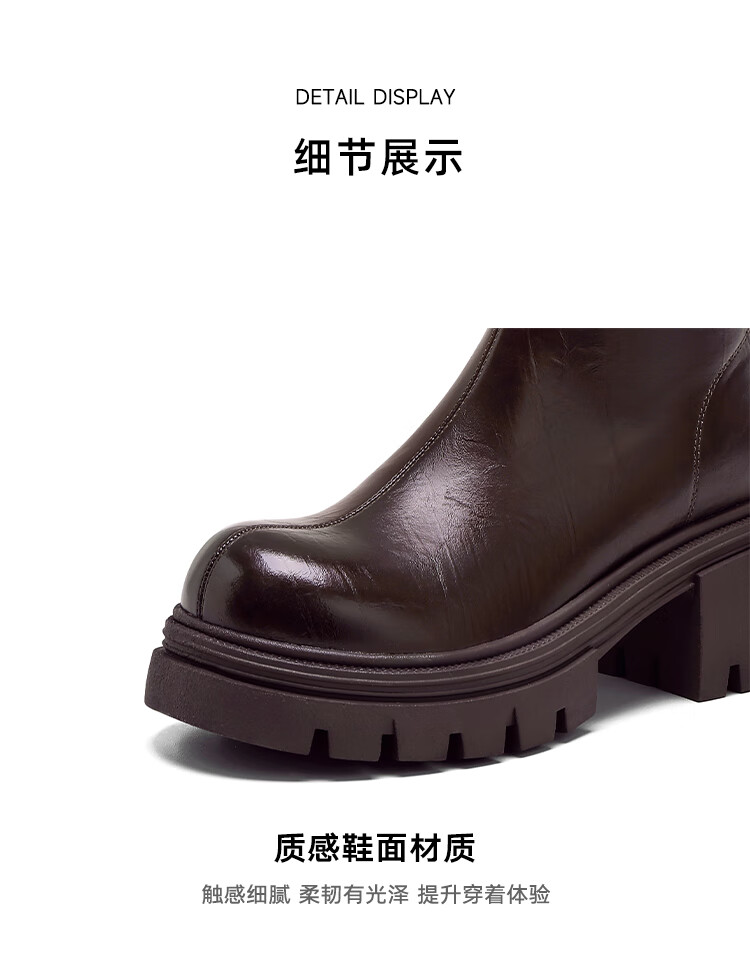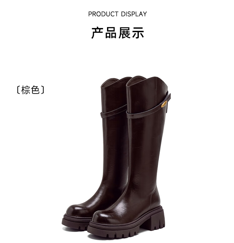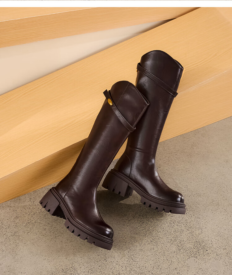 星期六长筒靴女2025新款爆款秋冬真皮女靴厚底增高黑色瘦瘦靴高筒骑士靴 棕色【短款】 36