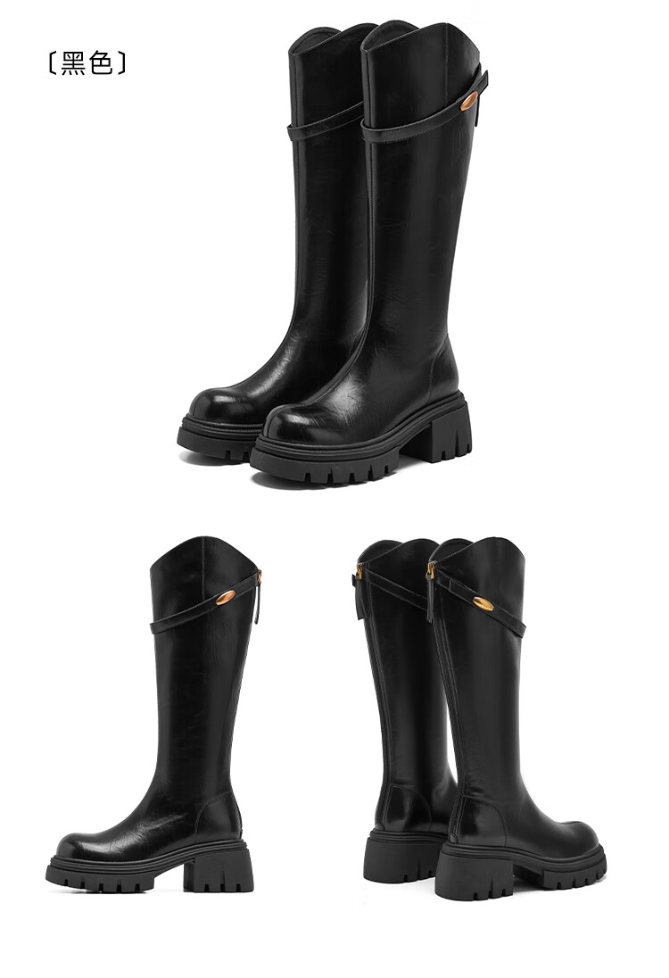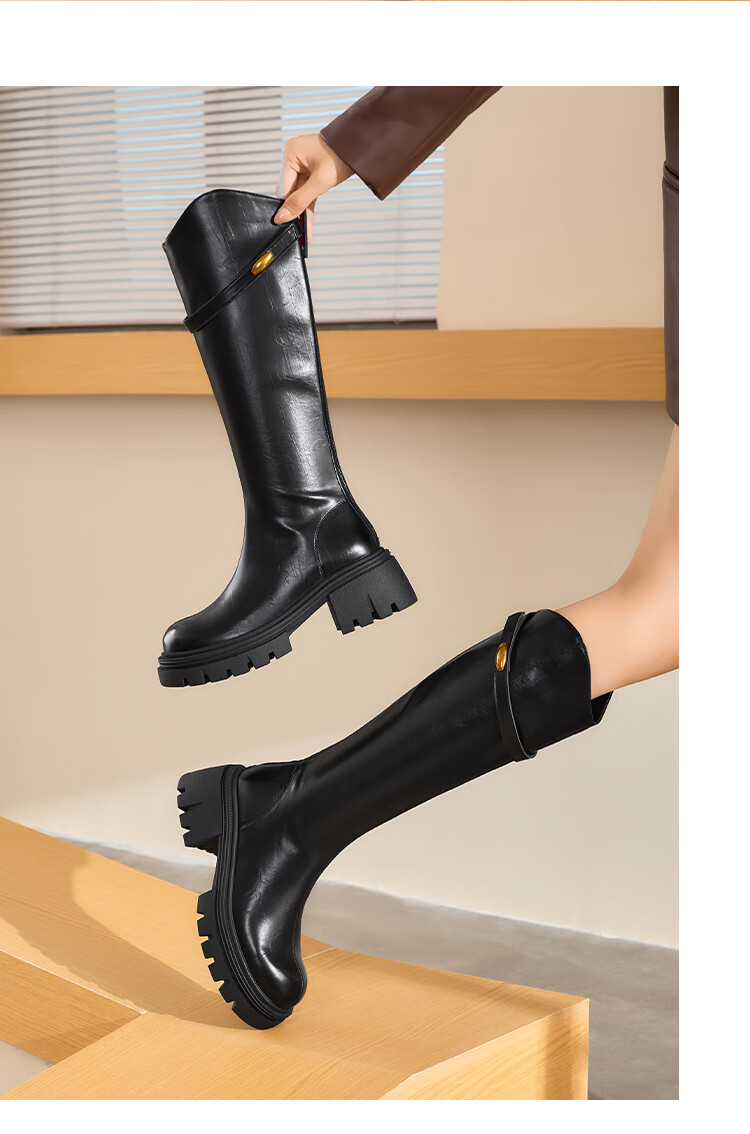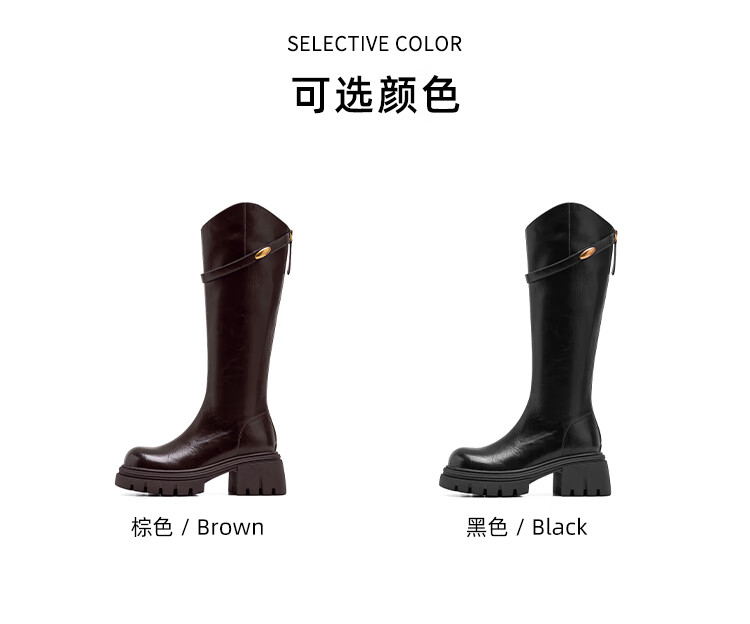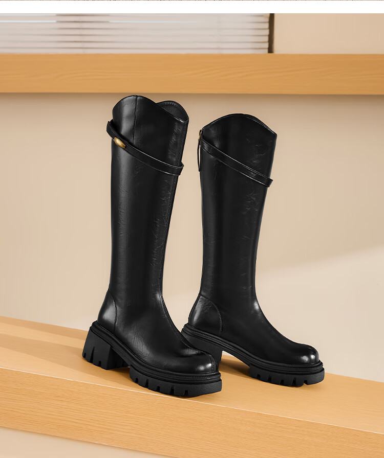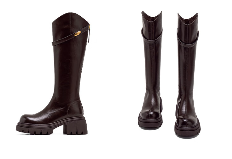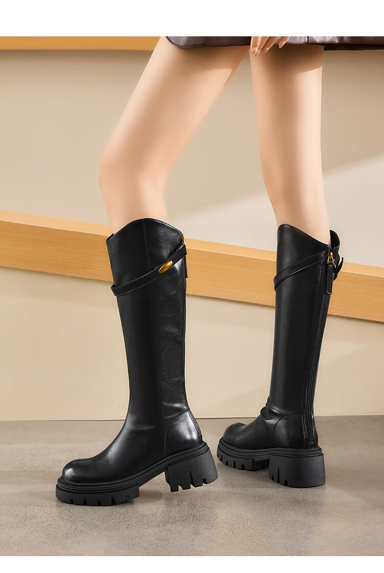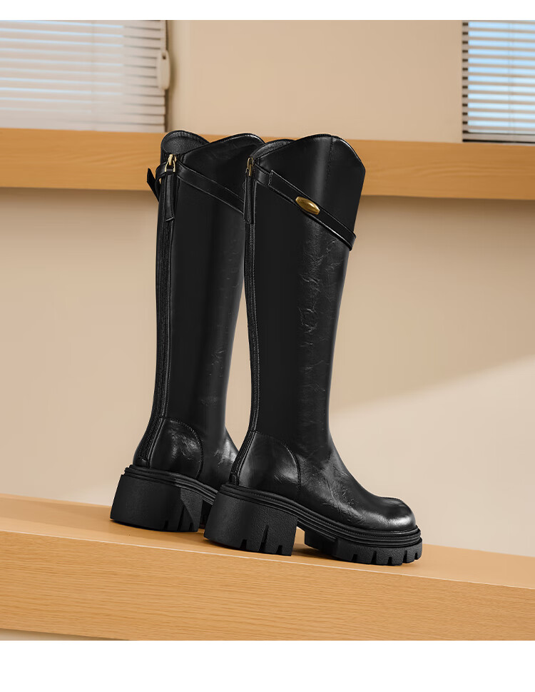 星期六长筒靴女2025新款爆款秋冬真皮女靴厚底增高黑色瘦瘦靴高筒骑士靴 棕色【短款】 36