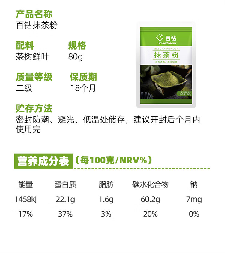 百钻抹茶粉80g 家用冲饮冲泡奶茶咖啡蛋糕烘焙原料