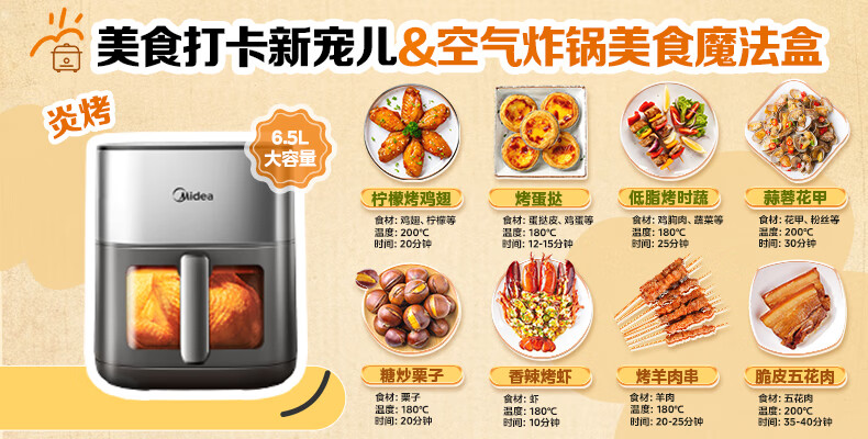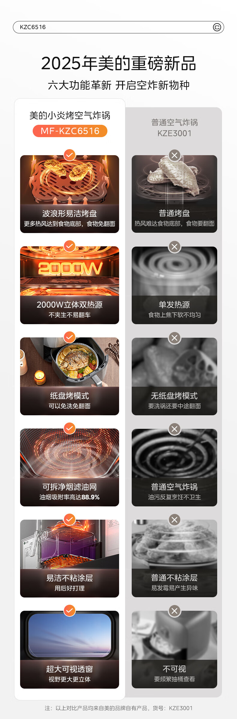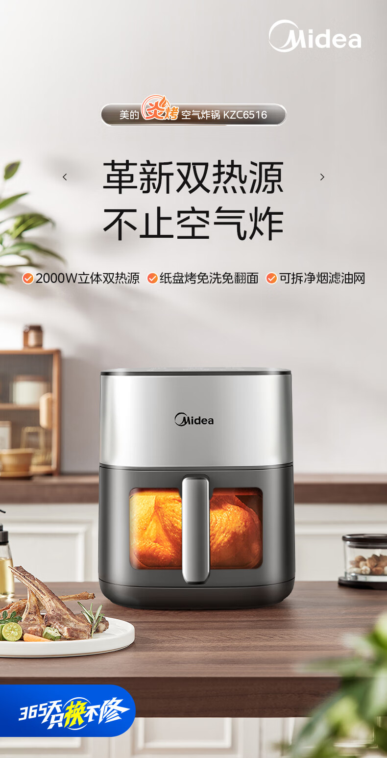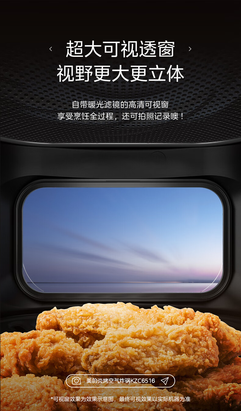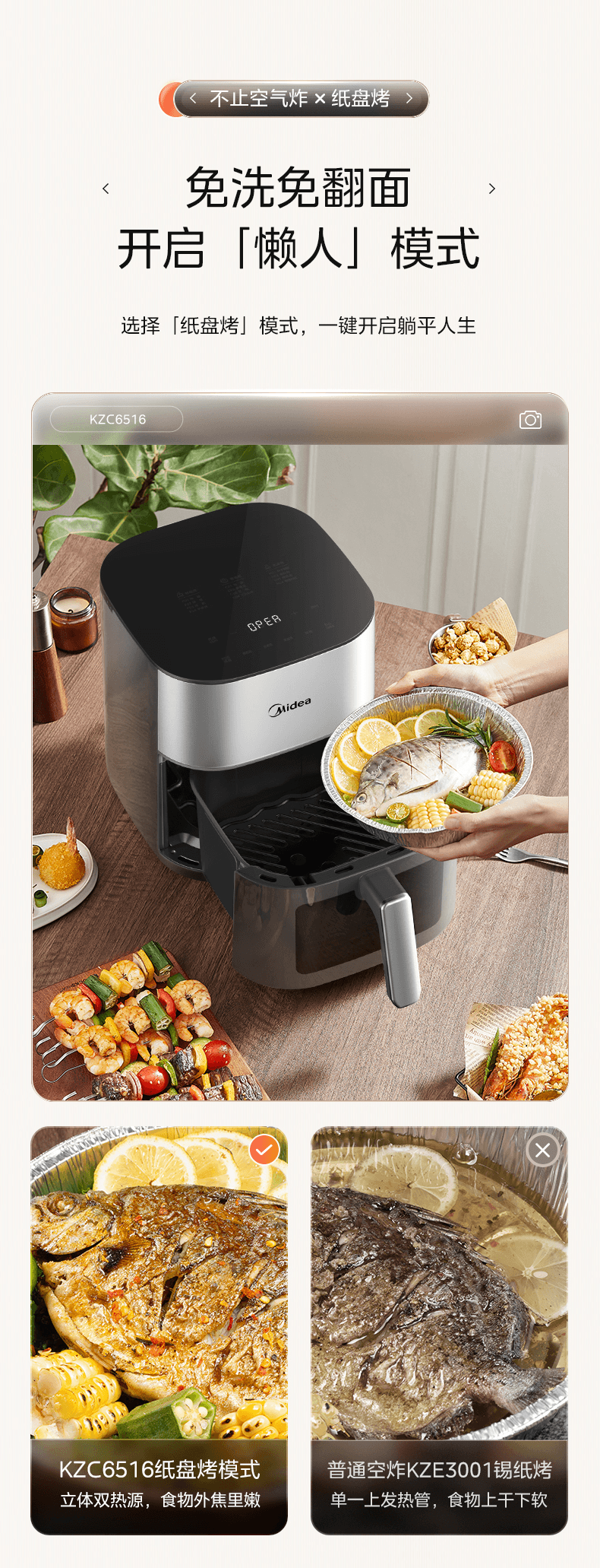 美的(Midea)炎烤免翻面家用空气炸锅蒸烤一体可视窗口上下双热源6.5L大容量金属内腔微蒸汽嫩烤 MF-KZC6516