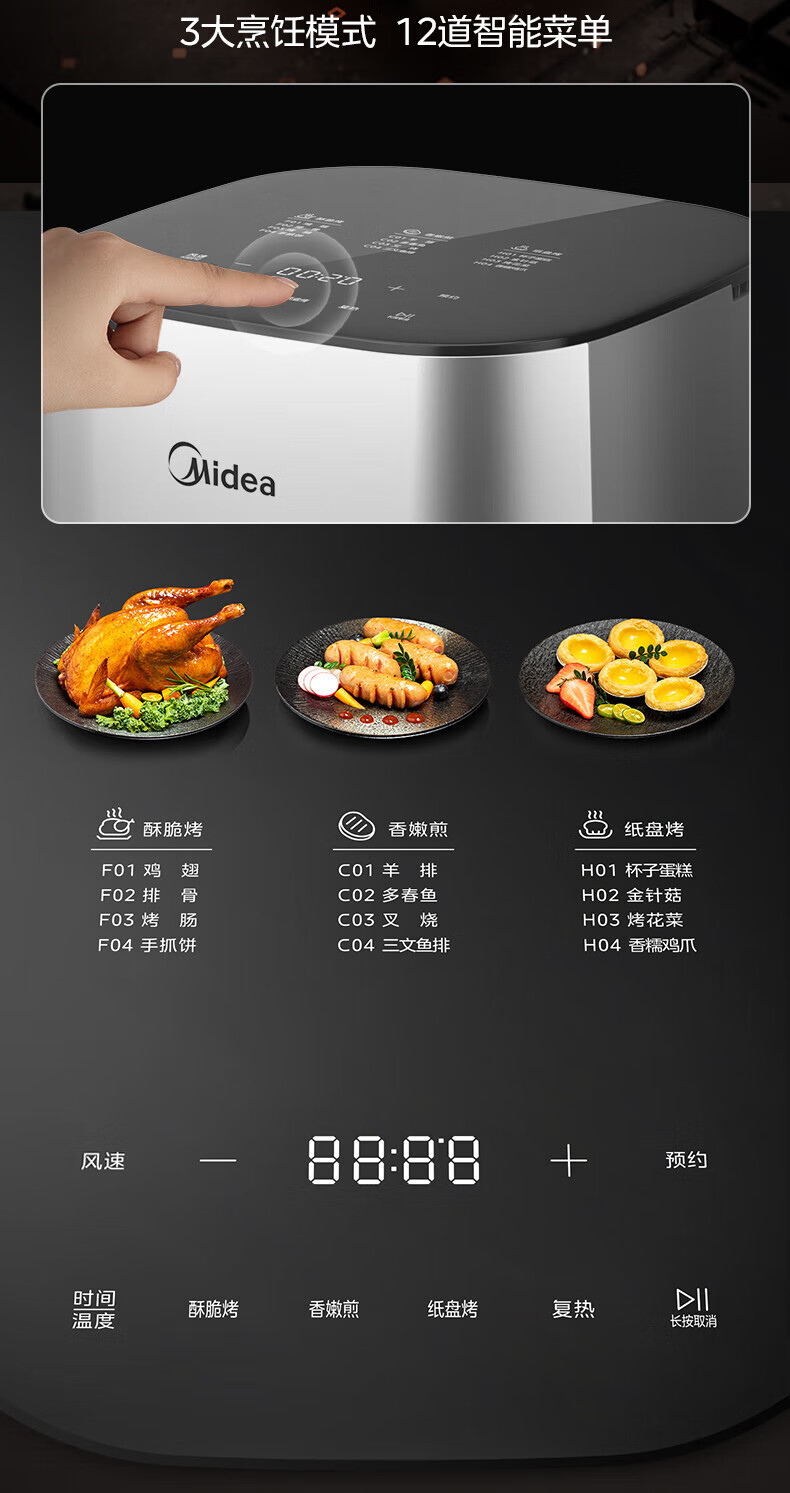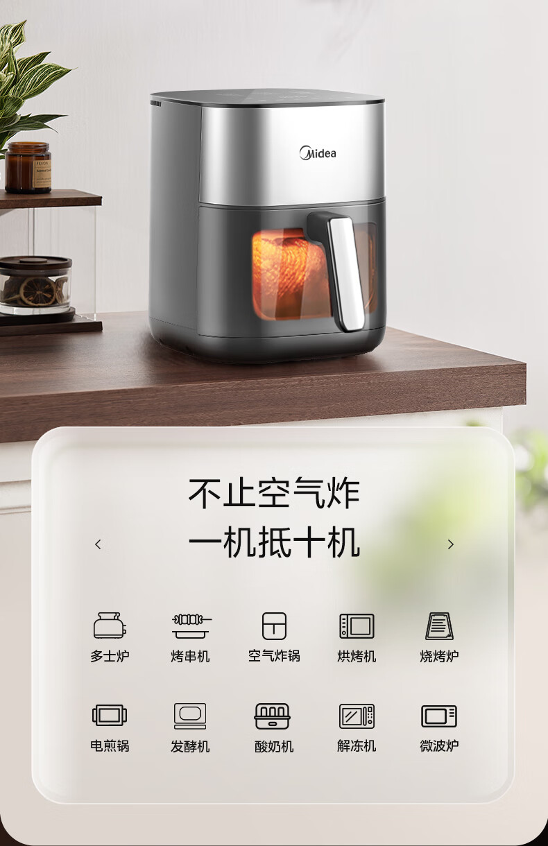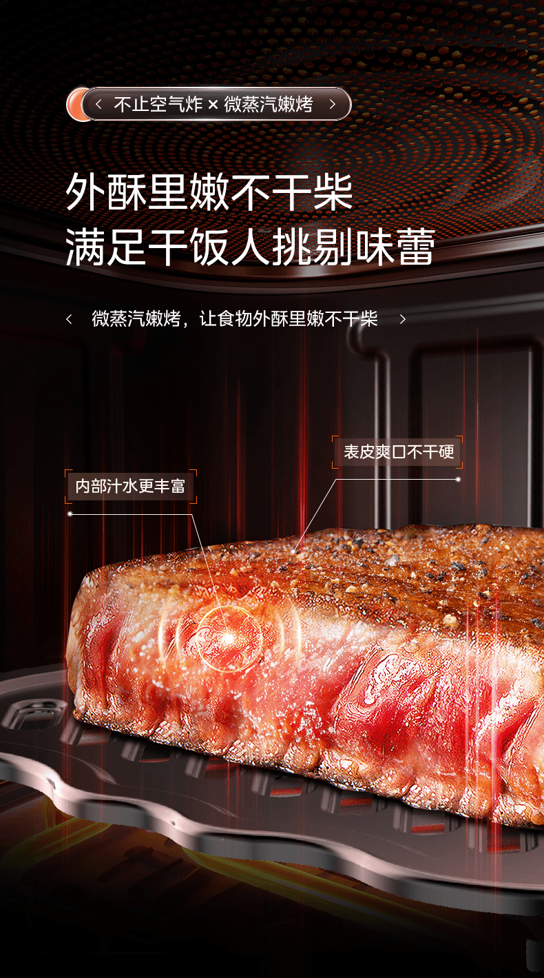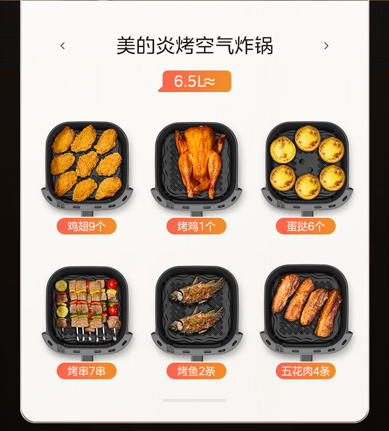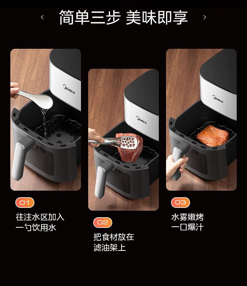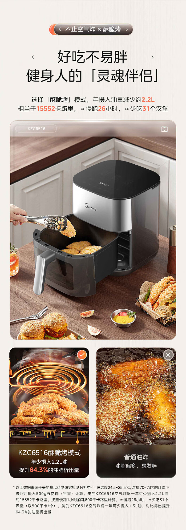 美的(Midea)炎烤免翻面家用空气炸锅蒸烤一体可视窗口上下双热源6.5L大容量金属内腔微蒸汽嫩烤 MF-KZC6516