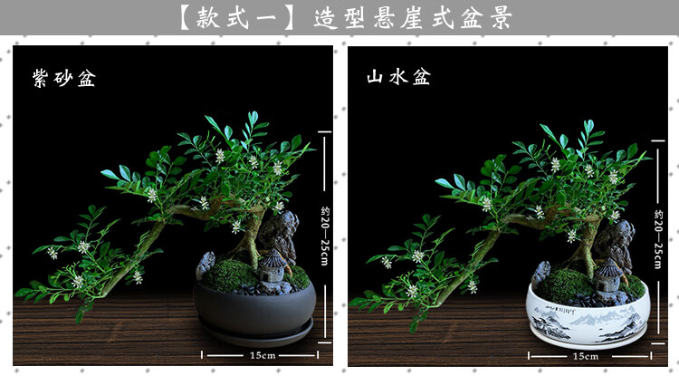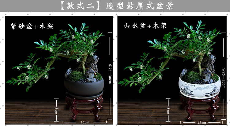 九里香盆栽中式盆景悬崖造型小老桩办公室内驱蚊绿植花卉书桌植物 悬崖式九里香(紫砂盆) +木架 整套成品(山石苔藓,带盆种好)