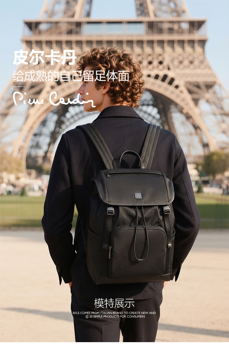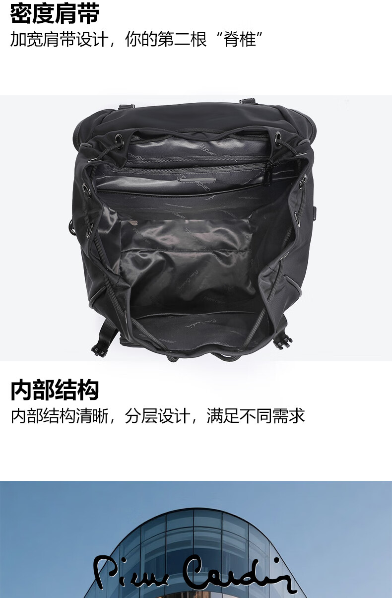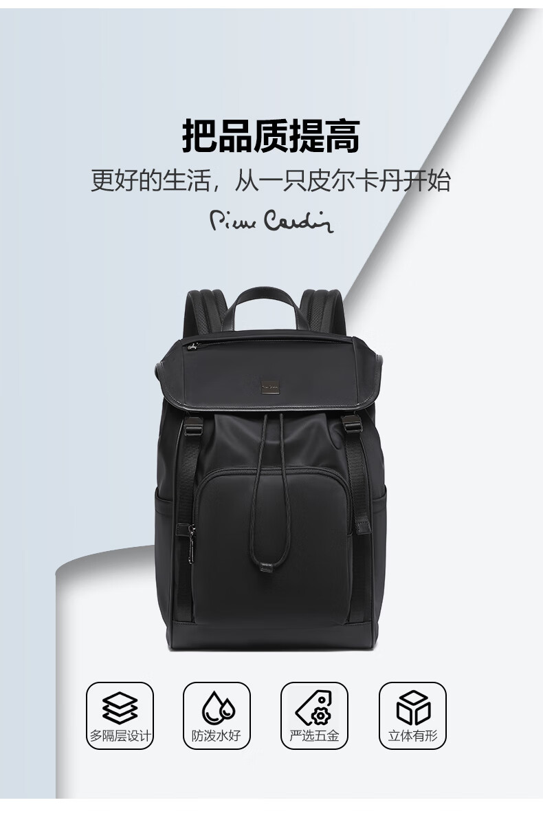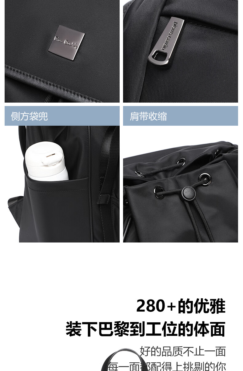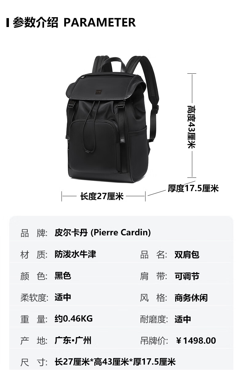 皮尔卡丹(pierre cardin)双肩包男背包大容量休闲书包电脑包旅行出差商务男士包包翻盖包 黑色【可放下15寸电脑】 长27高43厚度17.5厘米