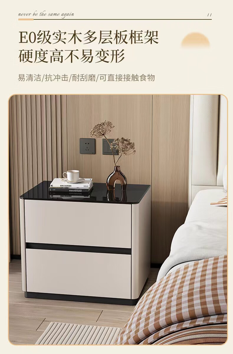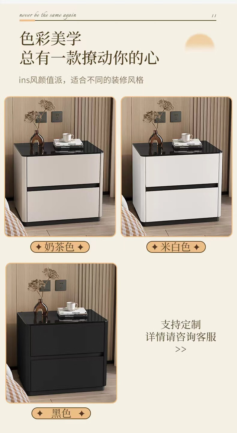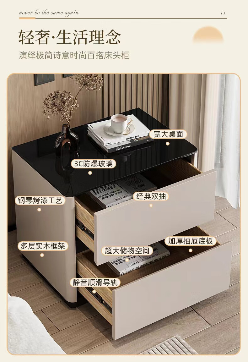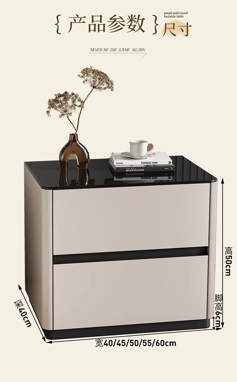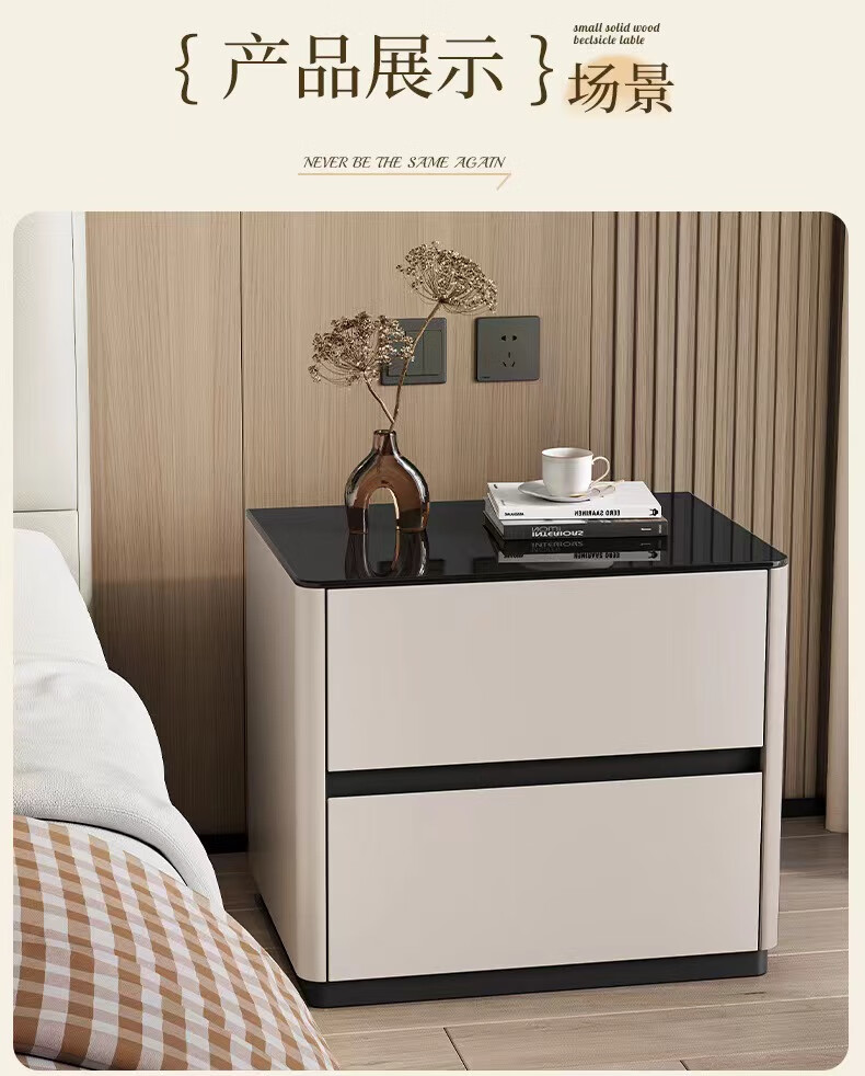 实木烤漆床头柜简约现代轻奢高级感卧室床边柜收纳柜钢化玻璃桌面 米白色【实木烤漆】 50x40x50cm