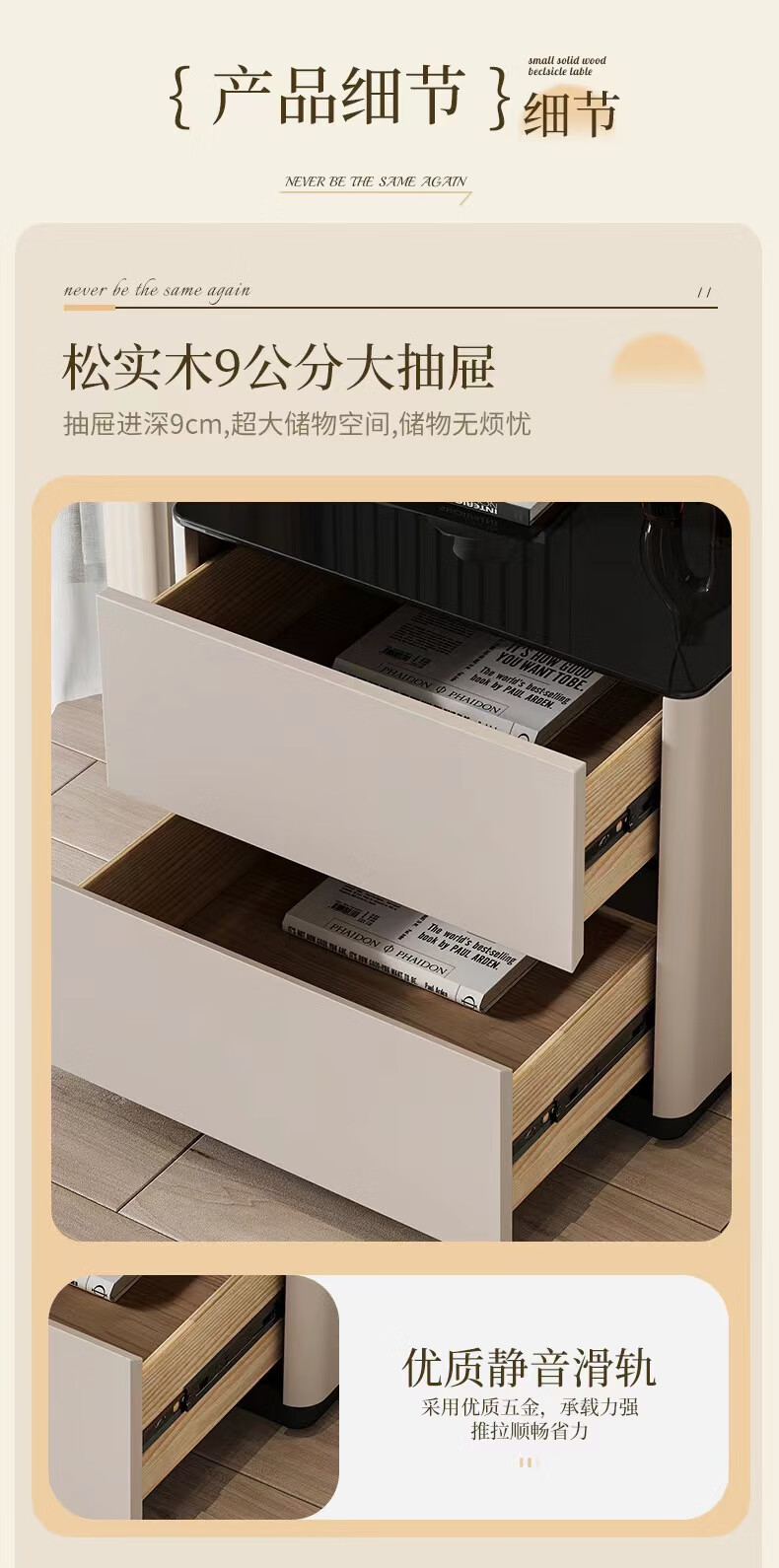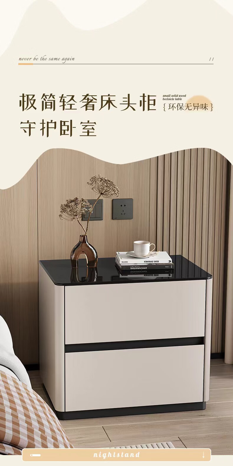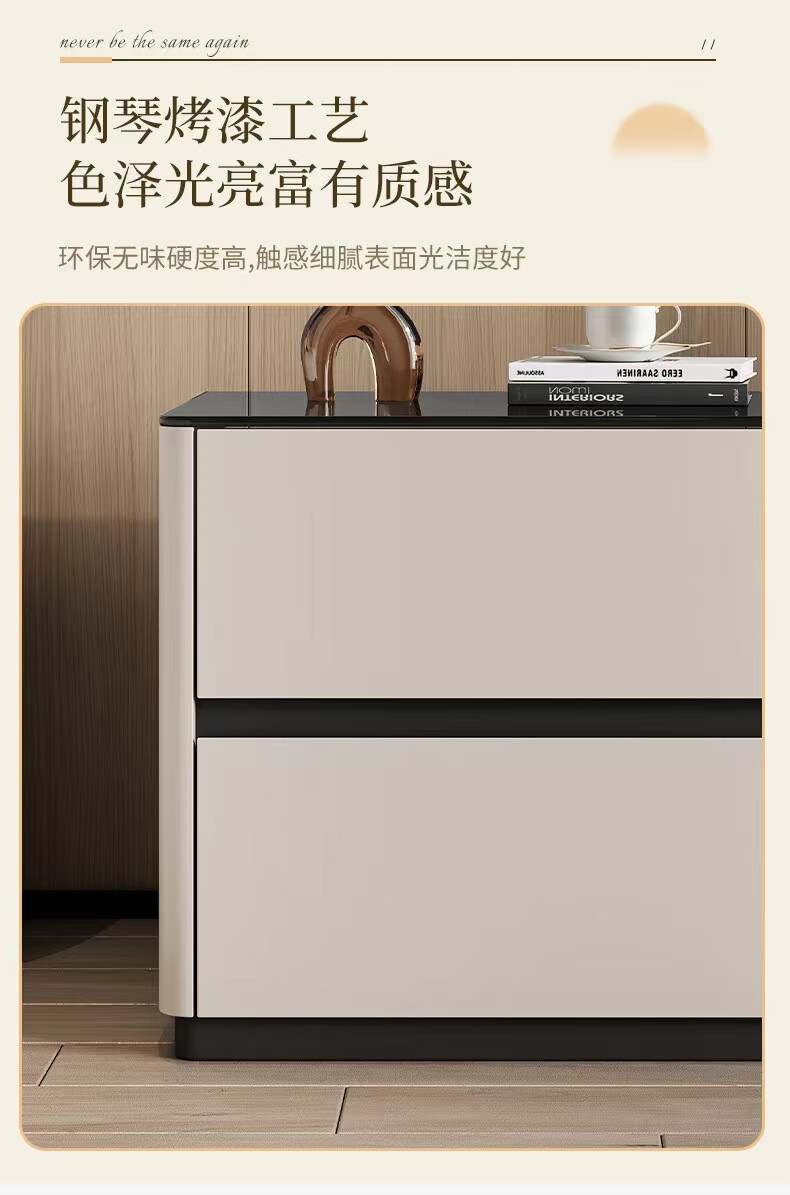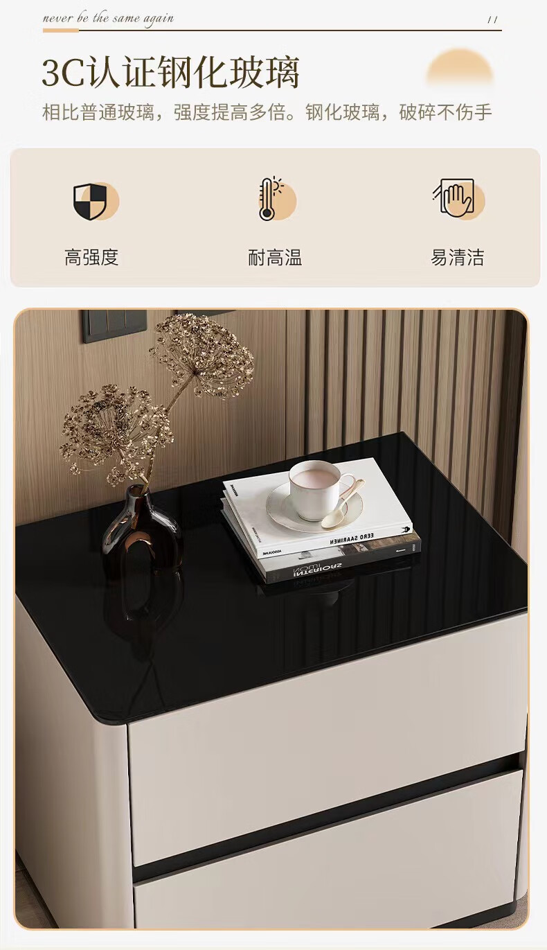 实木烤漆床头柜简约现代轻奢高级感卧室床边柜收纳柜钢化玻璃桌面 米白色【实木烤漆】 50x40x50cm