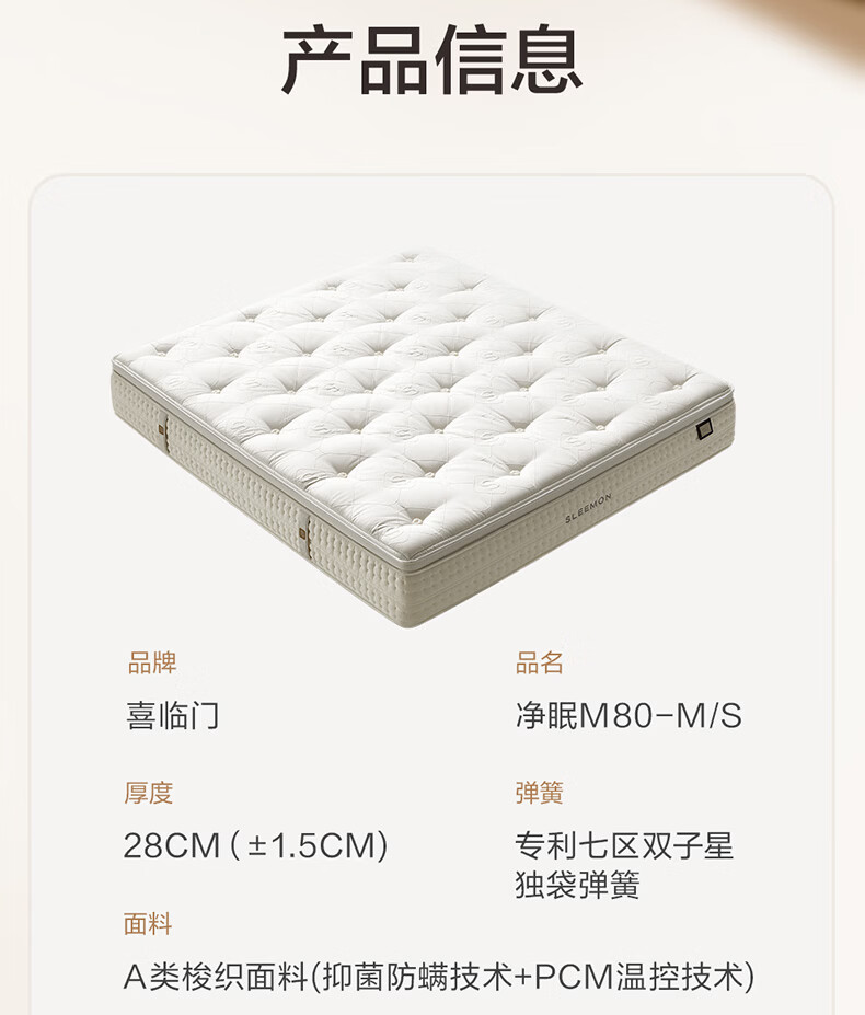 喜临门净眠乳胶床垫轻音独袋弹簧羊毛除甲醛床垫 电动床垫温控 净眠系列 M60【除甲醛/整垫0胶/软硬可调】 1.8*2米(指定款式闪送)