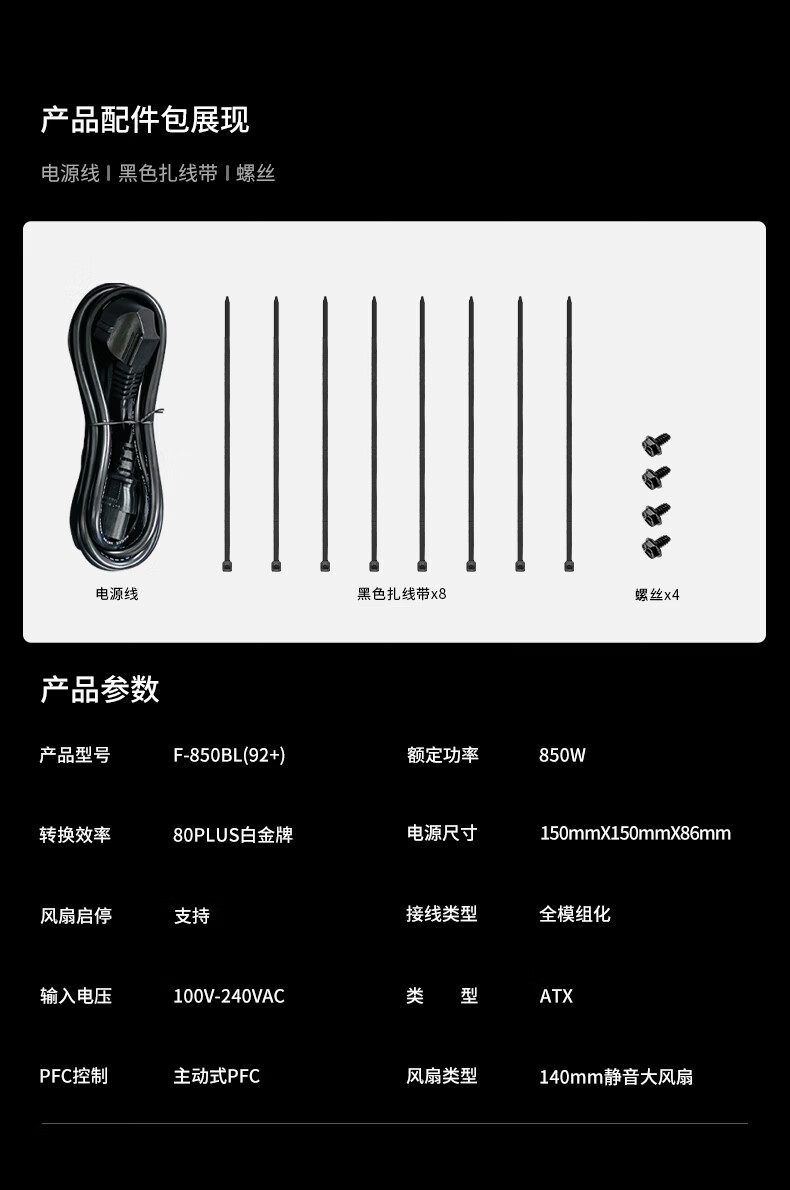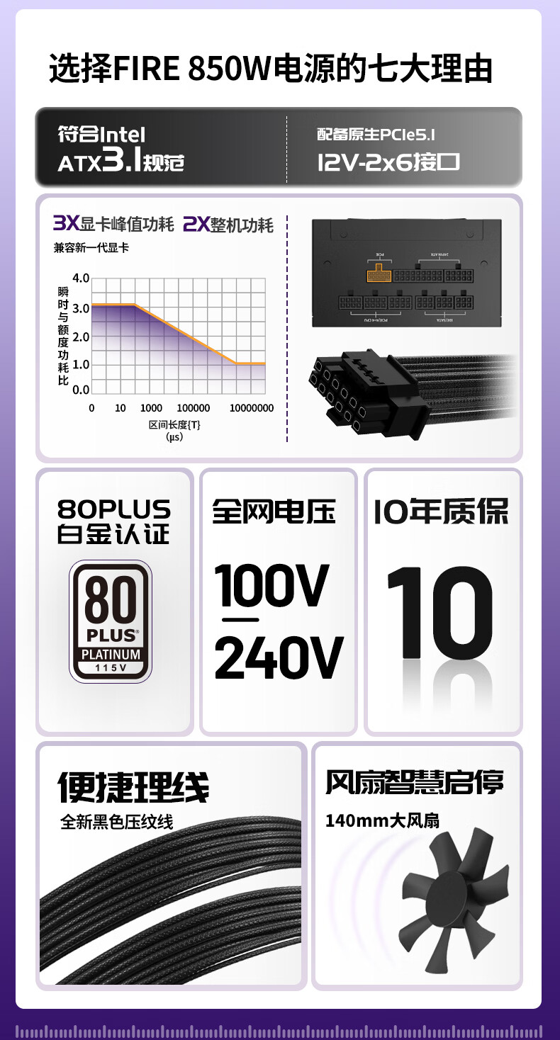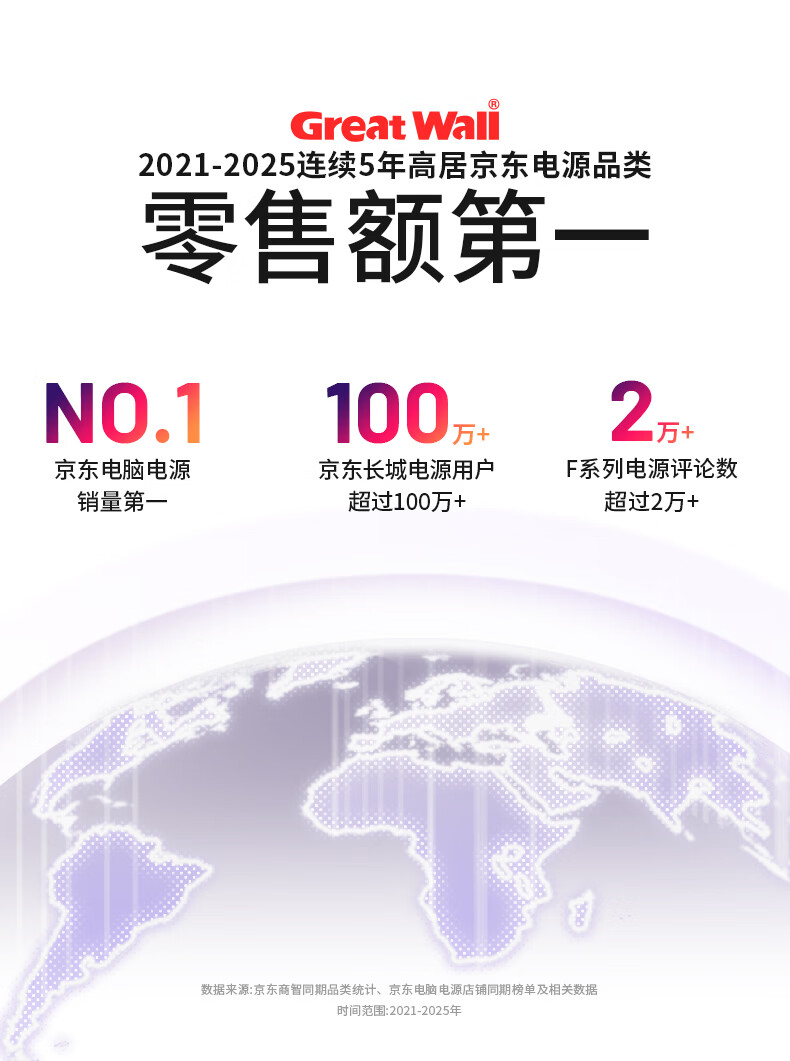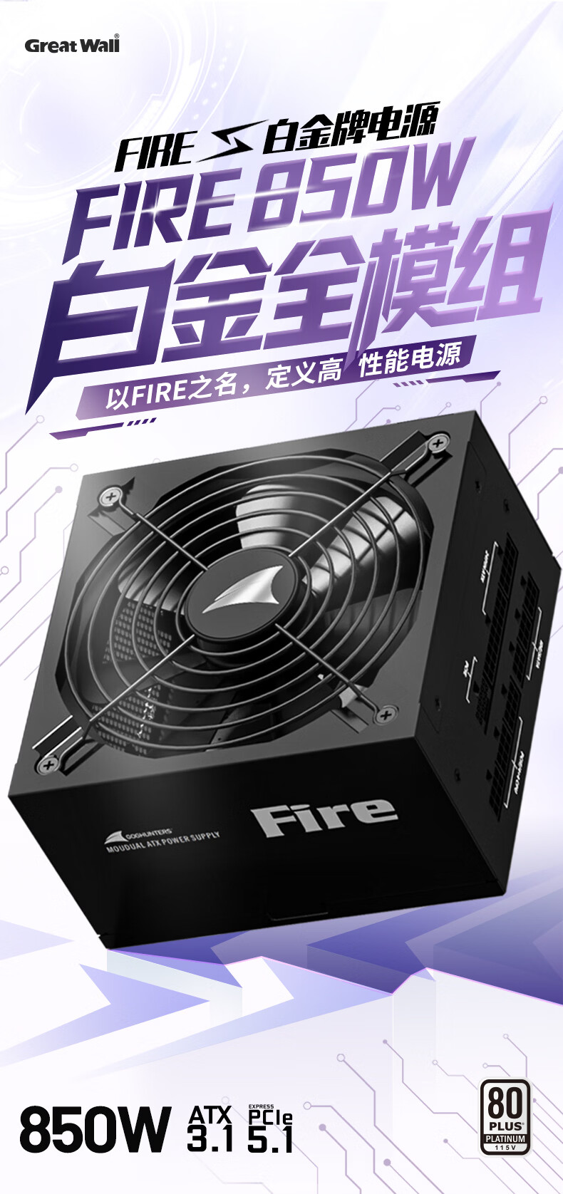 长城(Great Wall)额定850W F8白金牌全模组电脑电源(ATX3.1标准/原生PCIe5.1/自动启停/全电压/闪电加速)