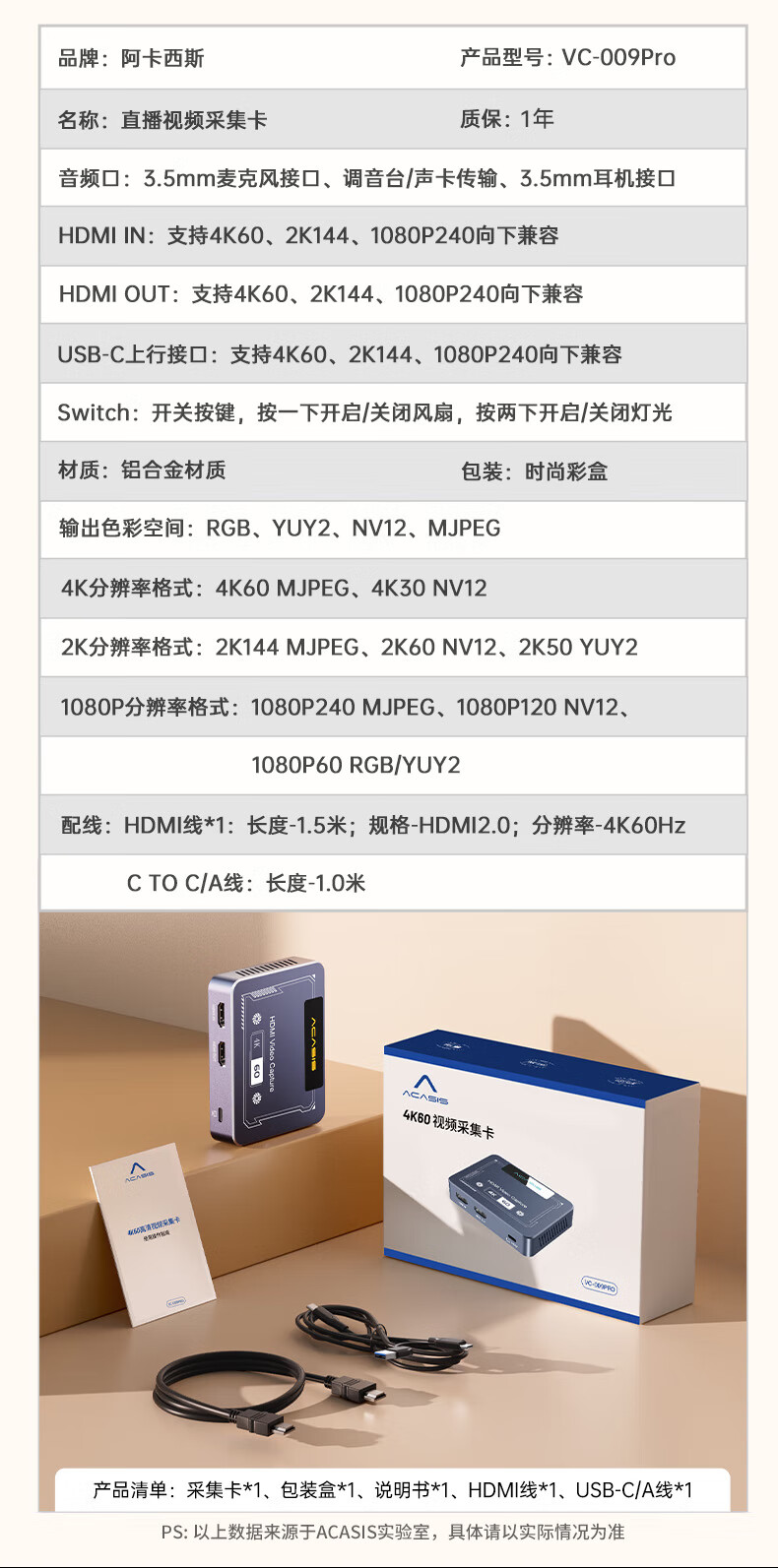 阿卡西斯(acasis)HDMI视频采集卡4K60Hz高清RGB24适用索尼佳能相机直播Switch2/PS5手机平板iPad电脑游戏VC-009Pro