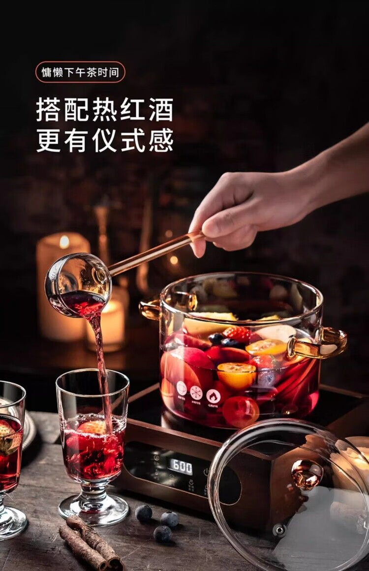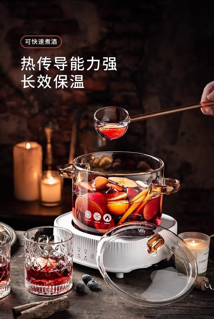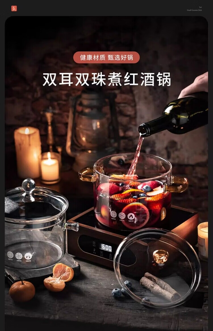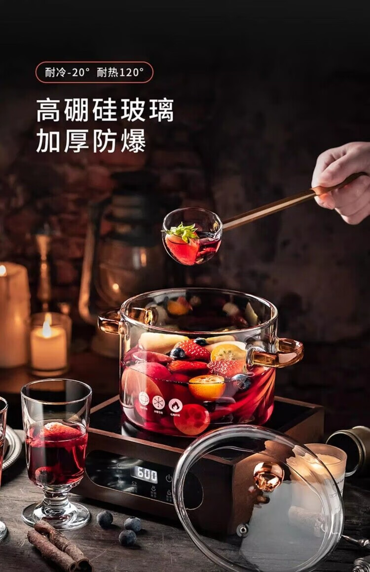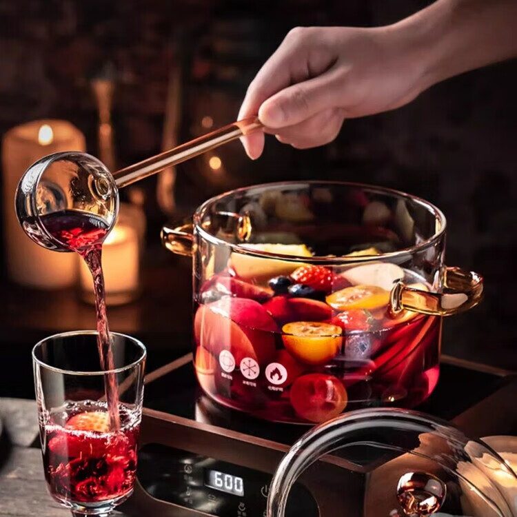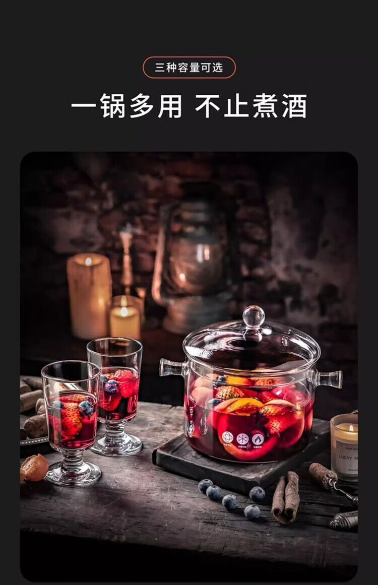 简漾煮红酒专用锅具套装冬天明火电陶炉耐高温玻璃器皿围炉热红酒汤锅 高硼硅玻璃煲(双耳大号款)2L 1cm 红酒锅+玻璃勺+导磁片【电磁炉专拍】
