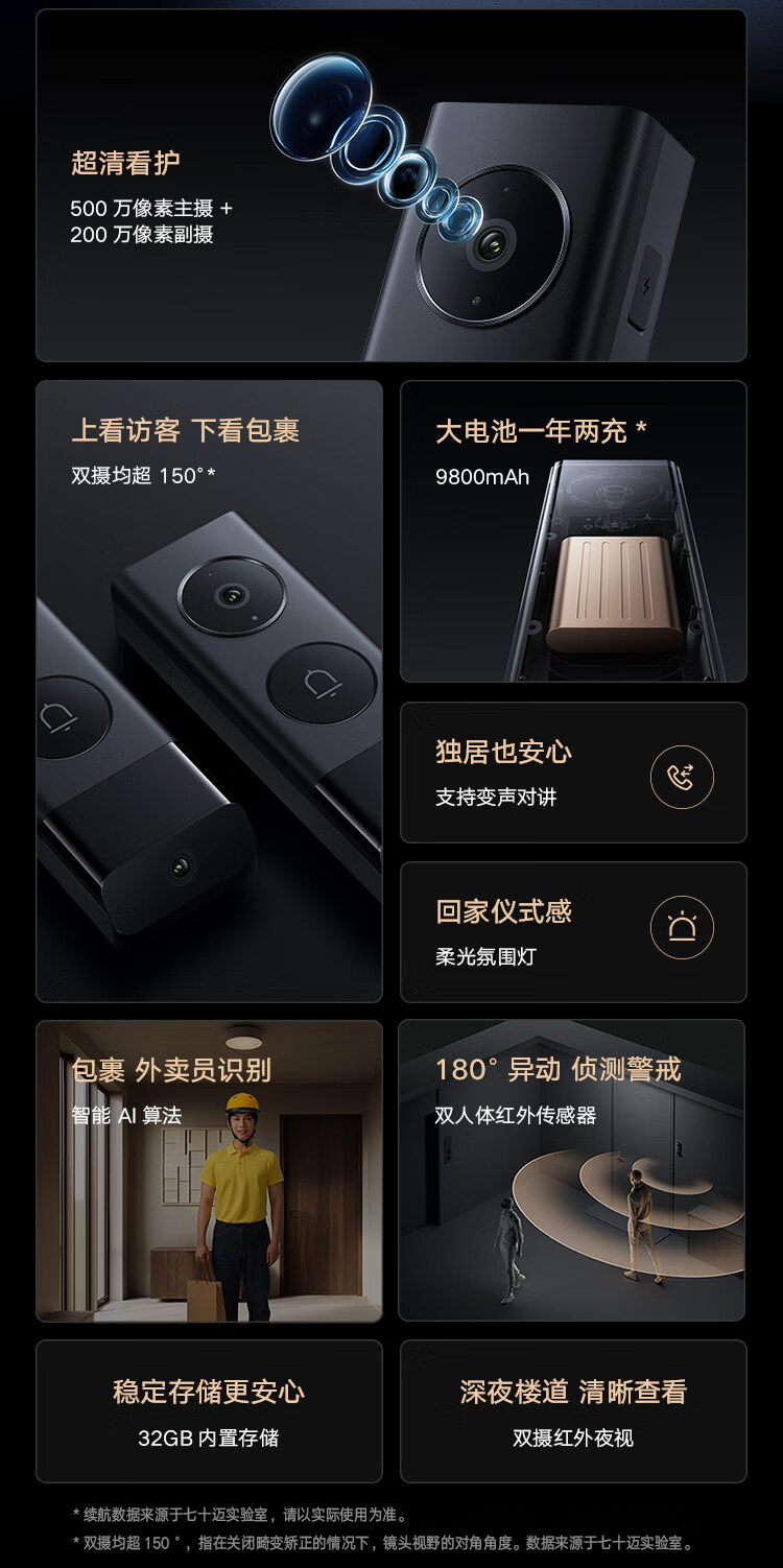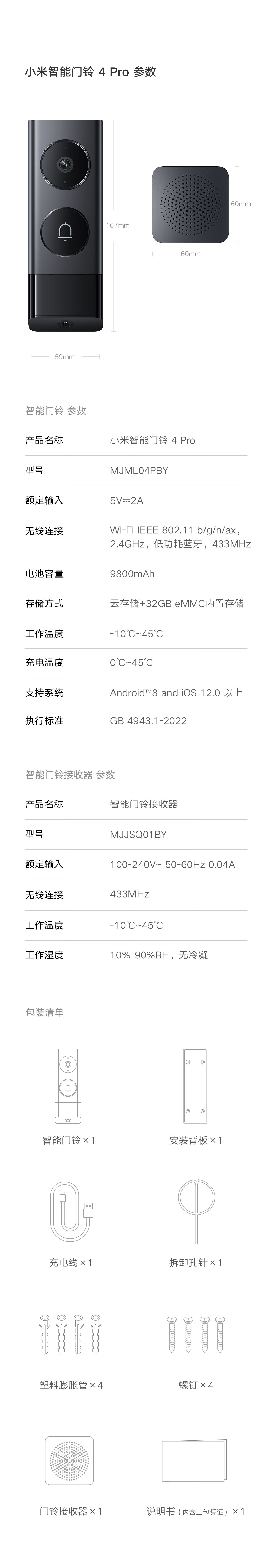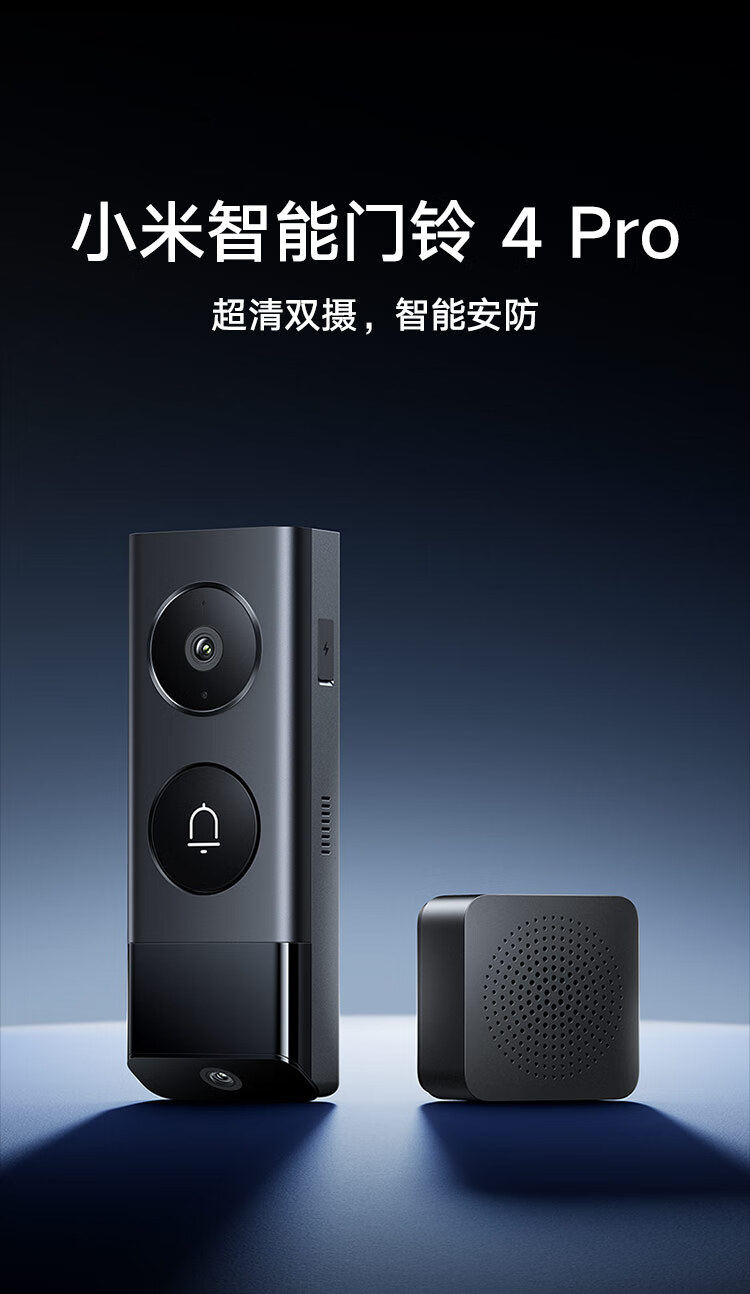 小米智能门铃4Pro可视门铃500万+200万双摄家用监控摄像头红外夜视远程双向通话包裹快递识别电子猫眼
