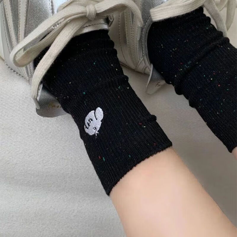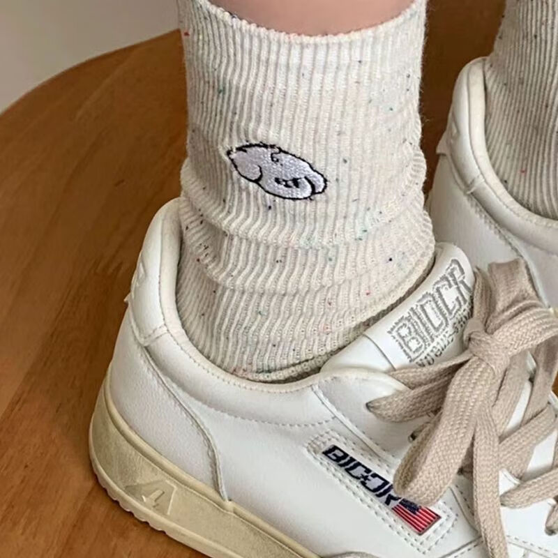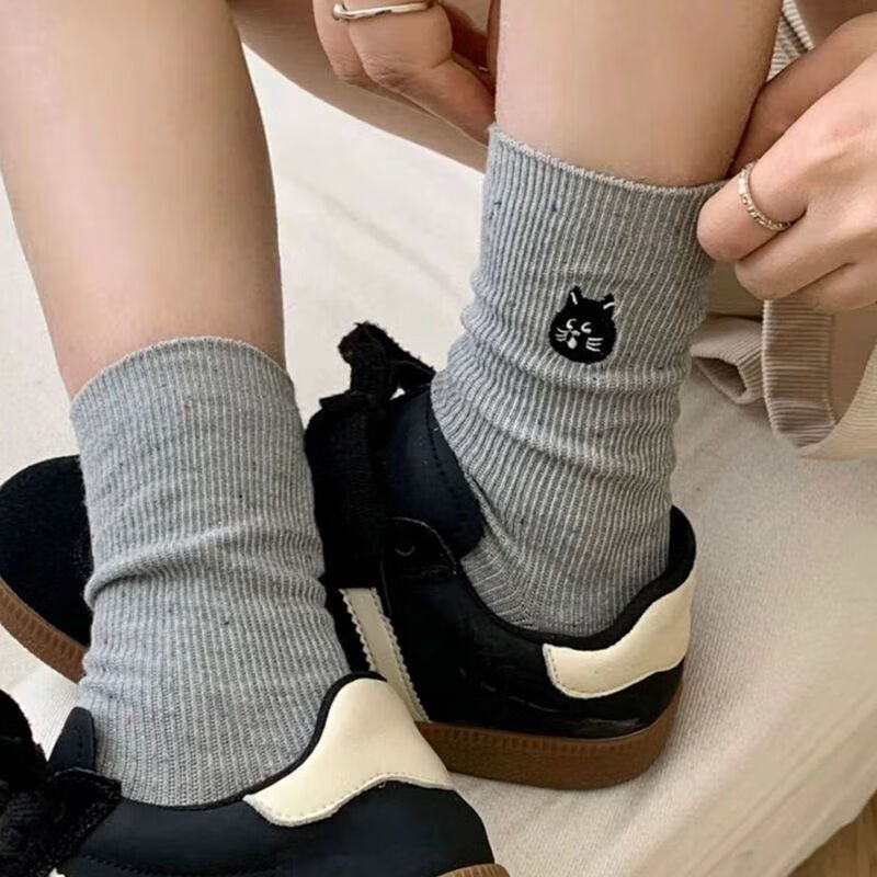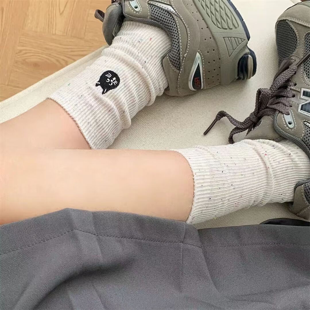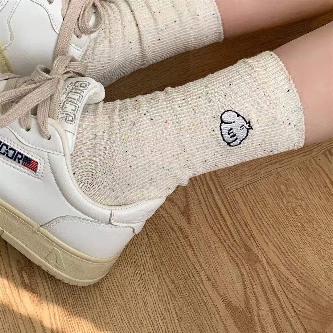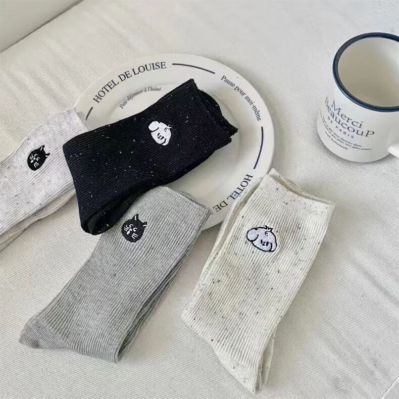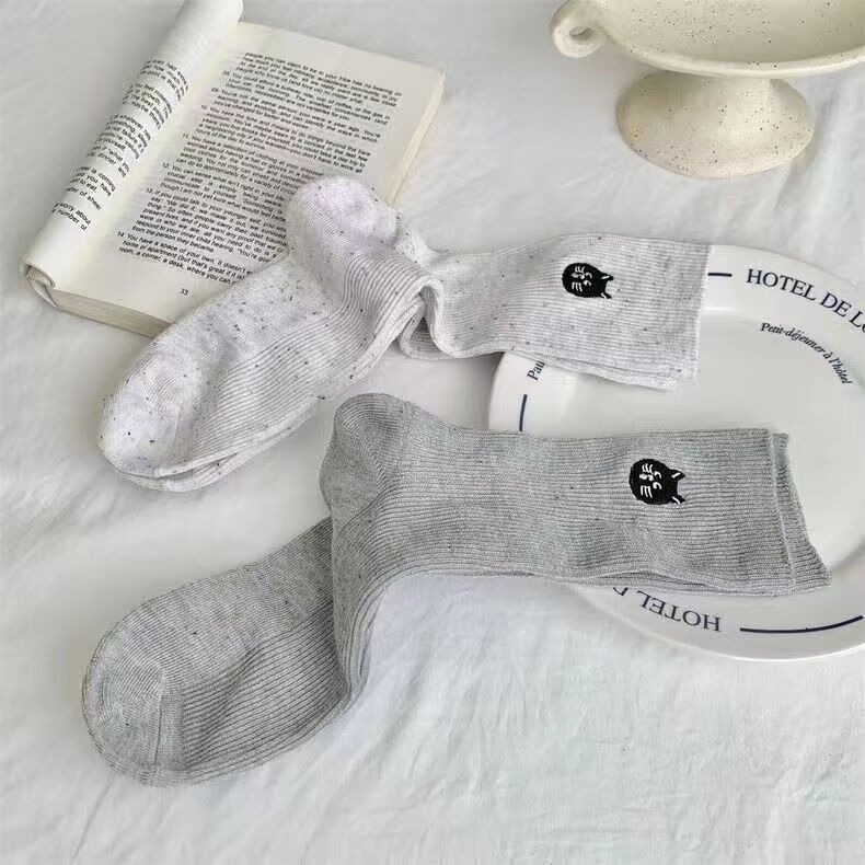 朋意网红春夏季点子纱可爱提花小狗猫袜子女中筒袜透气白色日系ins潮 米+灰【共两双】2双 均码 袜子