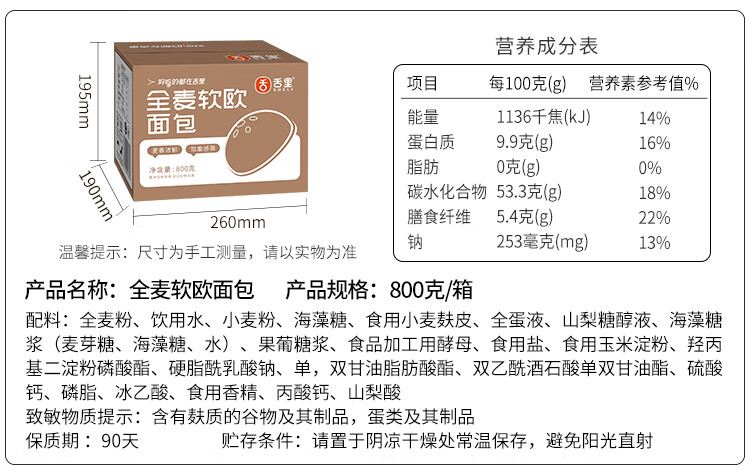 舌里 全麦面包欧包800g0脂高饱腹轻食早餐吐司休闲零食粗粮代餐