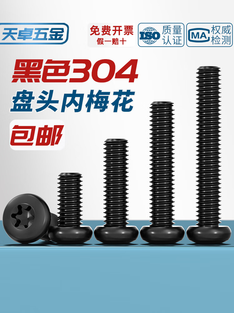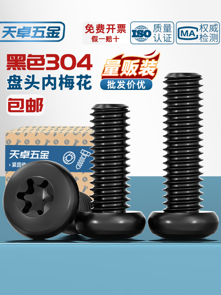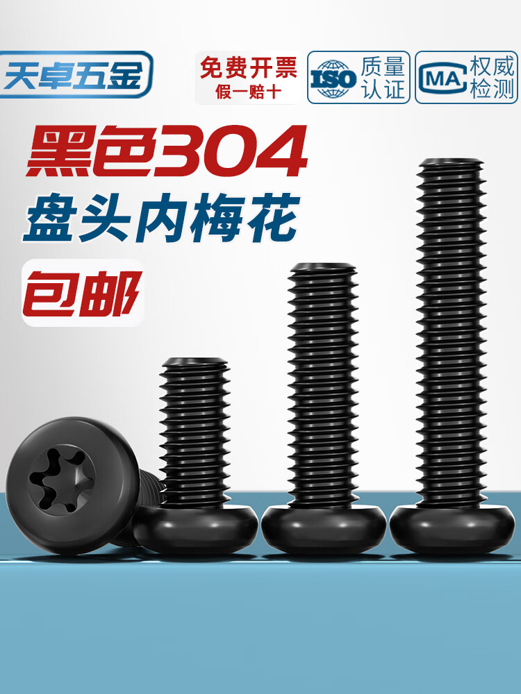 天卓五金黑色304不锈钢圆头盘头内梅花防盗螺丝钉镀黑锌发黑M2M3M4M5M6mm M3配套扳手T10X8