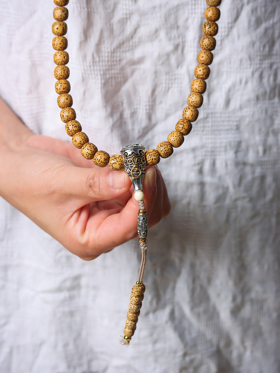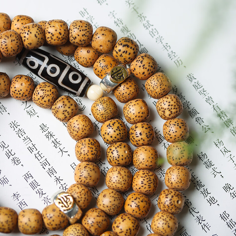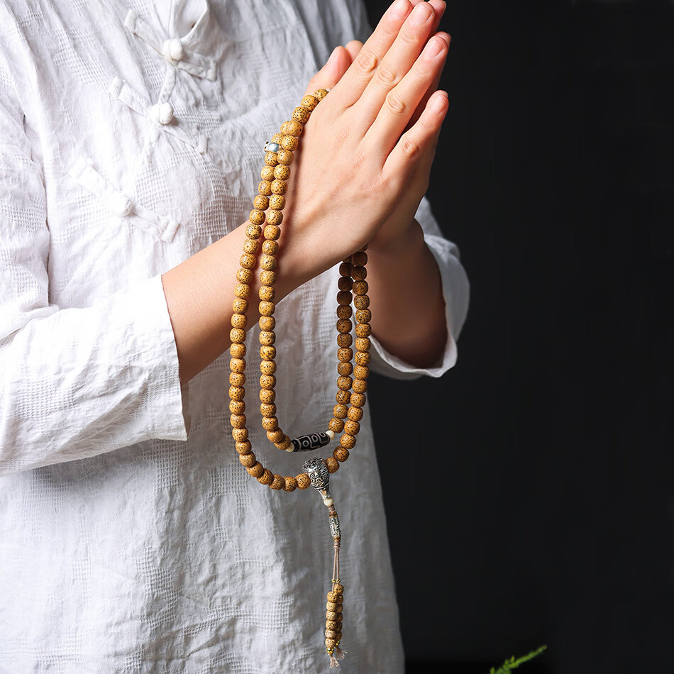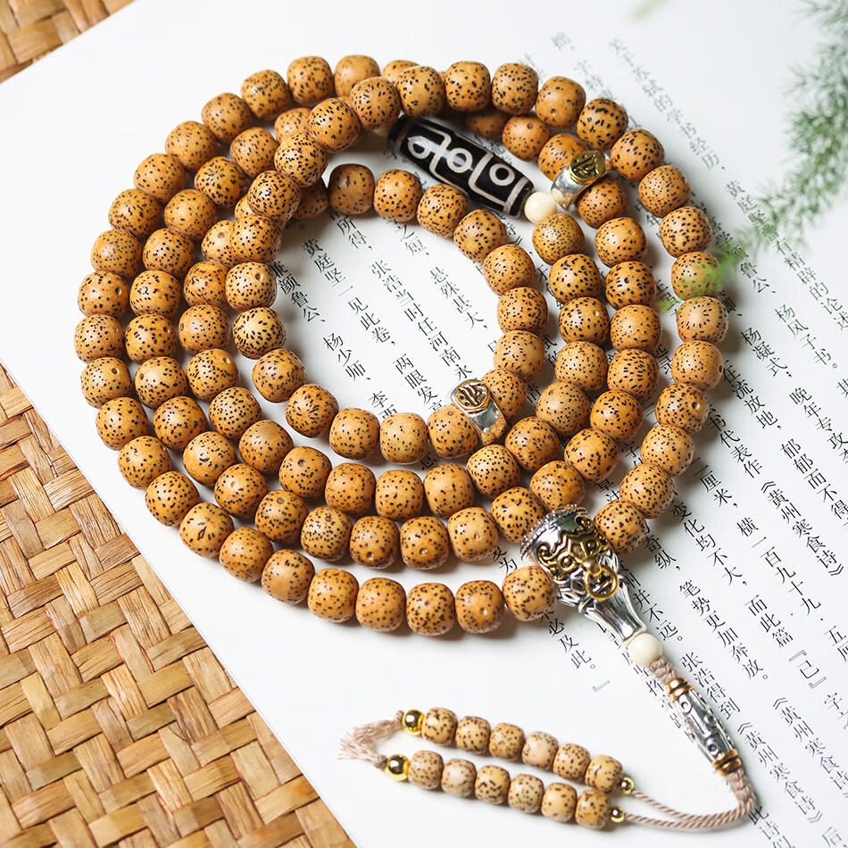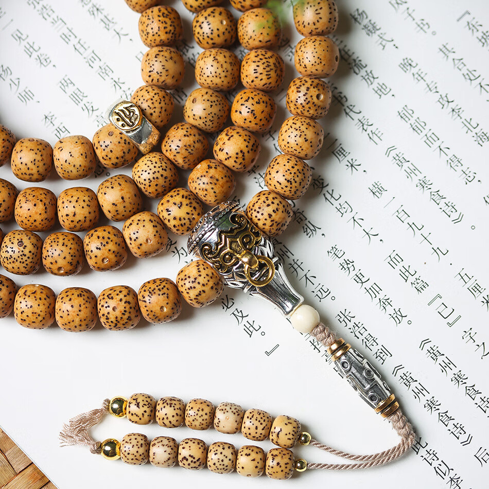 海南星月菩提黄金陈籽老料鸡油黄老型桶108颗藏银三通天珠款手串 鸡油黄藏银天珠款(910mm)