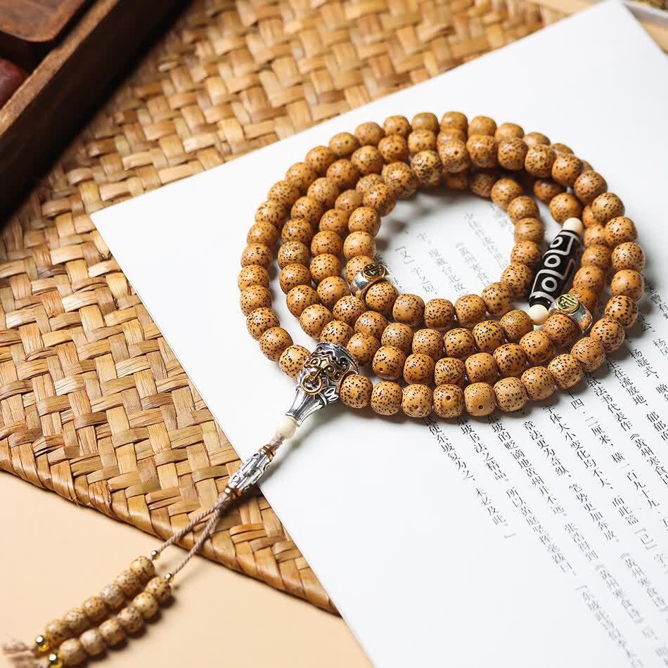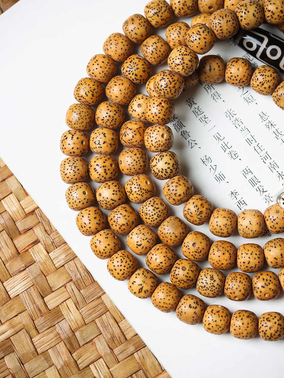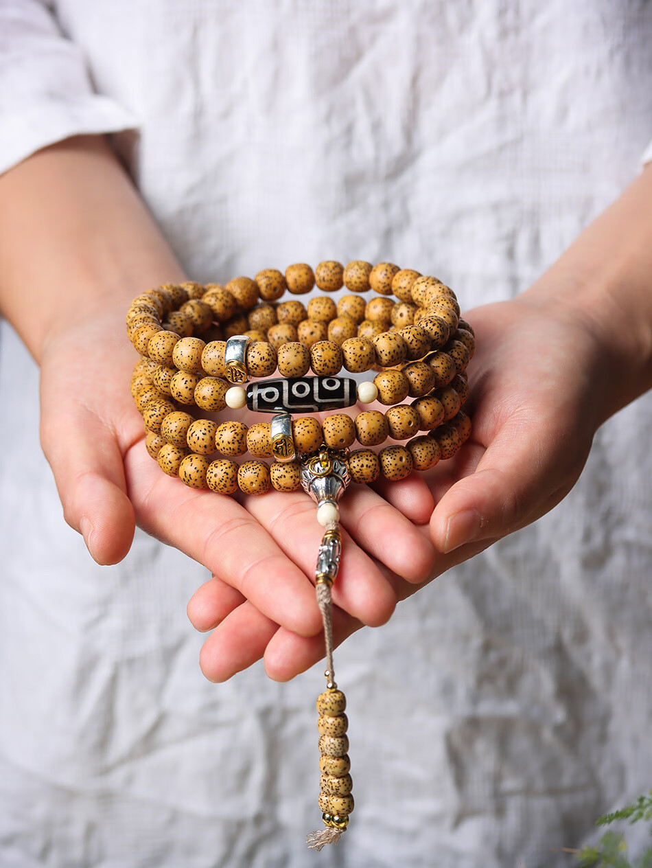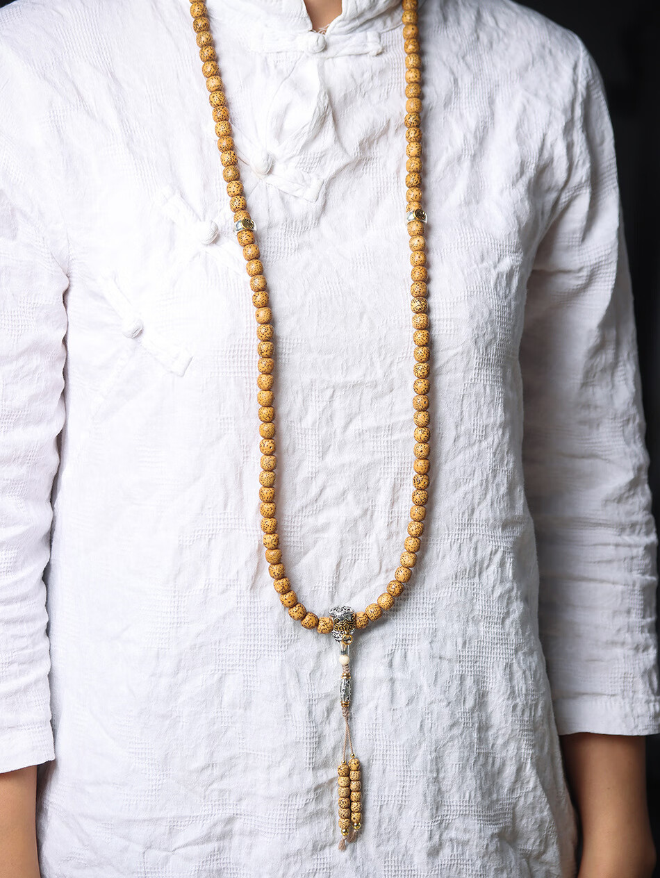 海南星月菩提黄金陈籽老料鸡油黄老型桶108颗藏银三通天珠款手串 鸡油黄藏银天珠款(910mm)