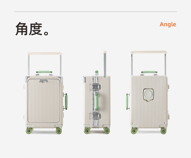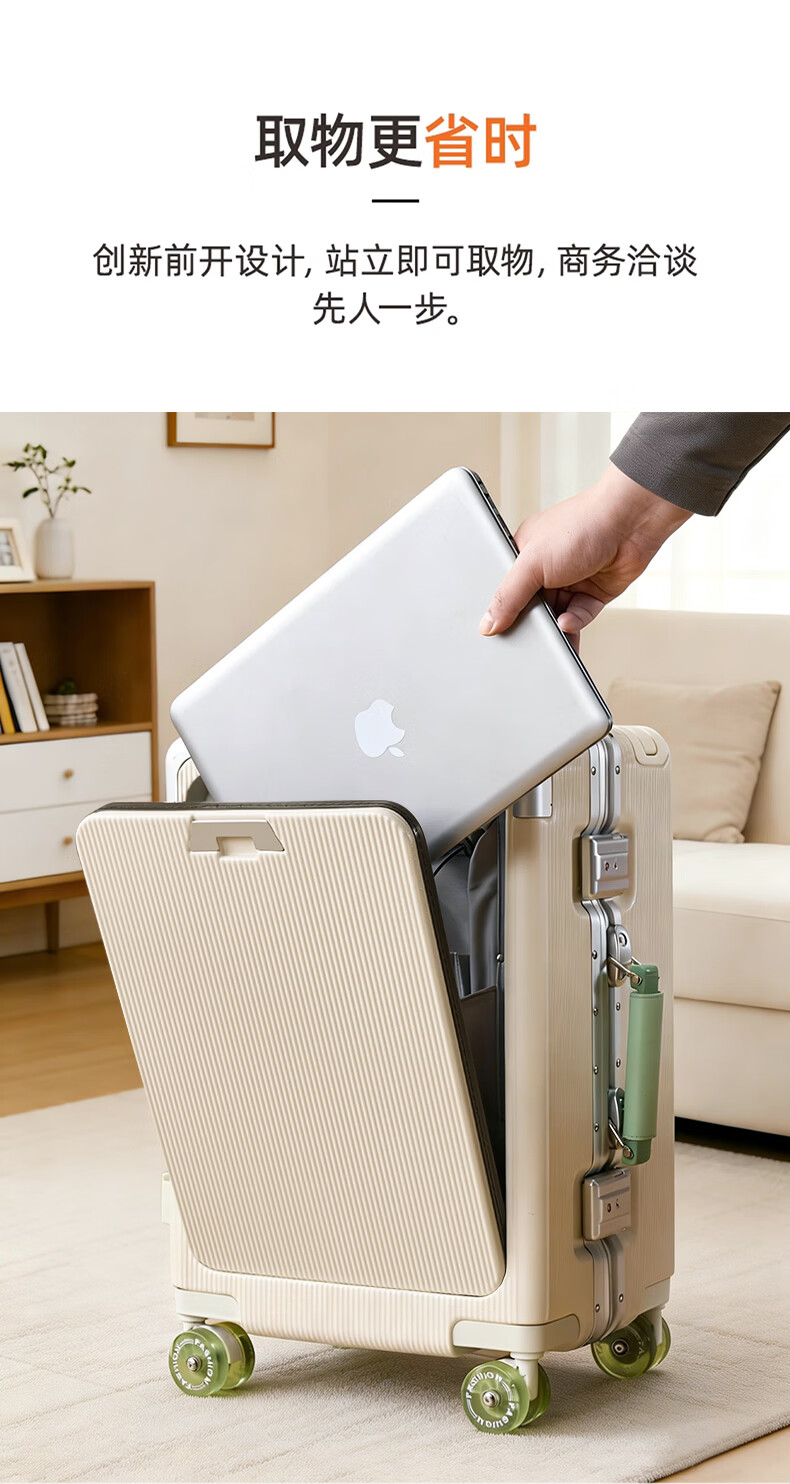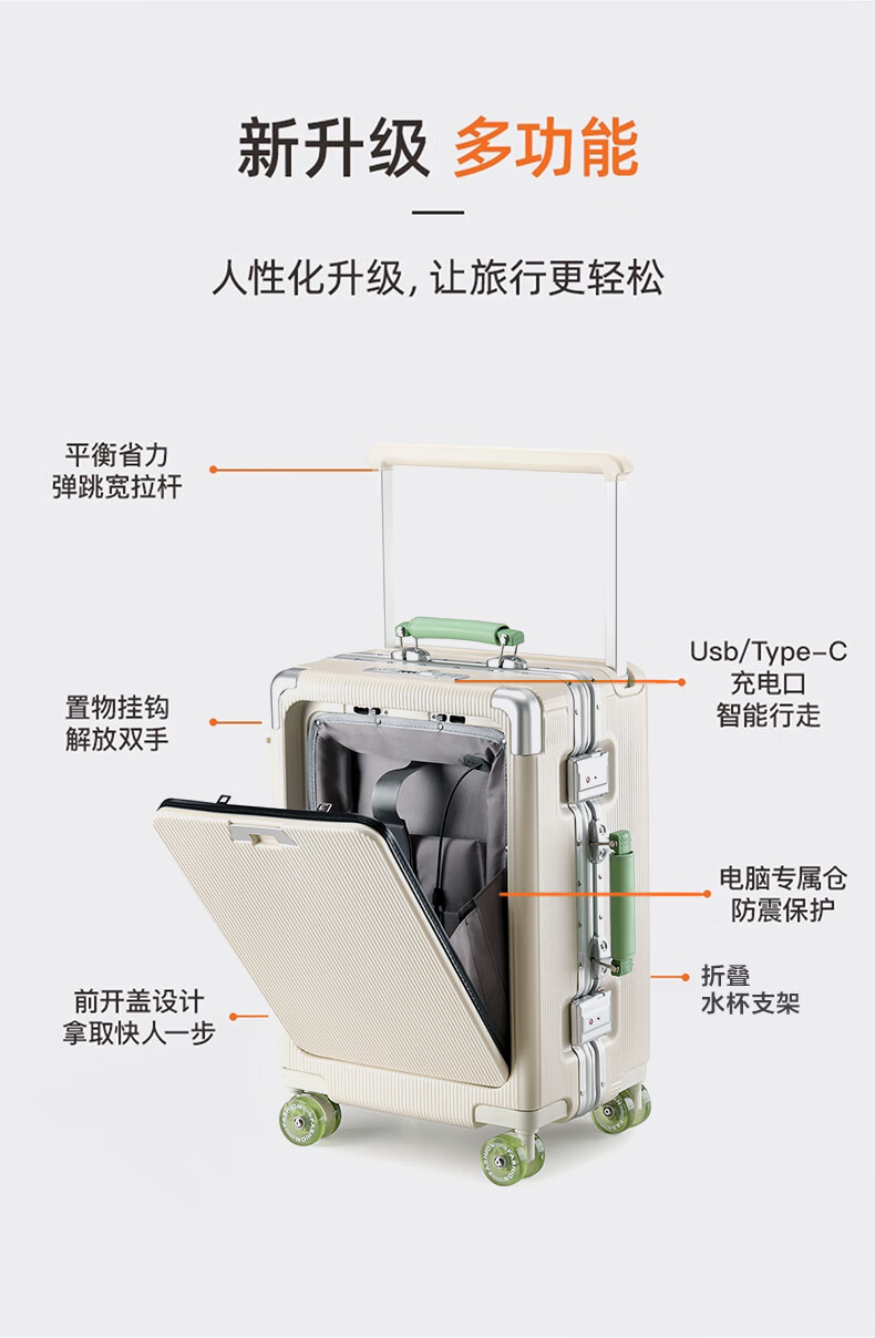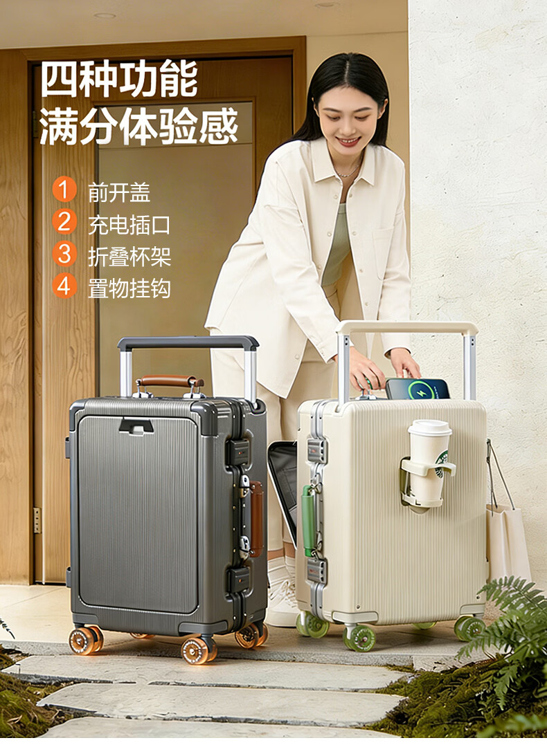 广璐迪前开盖小行李箱拉杆箱可上飞机登机箱18密码旅行箱子皮箱结实耐用 奢华银 【USB/Type-c 双充电口】 18英寸 登机箱+干湿分离+杯架