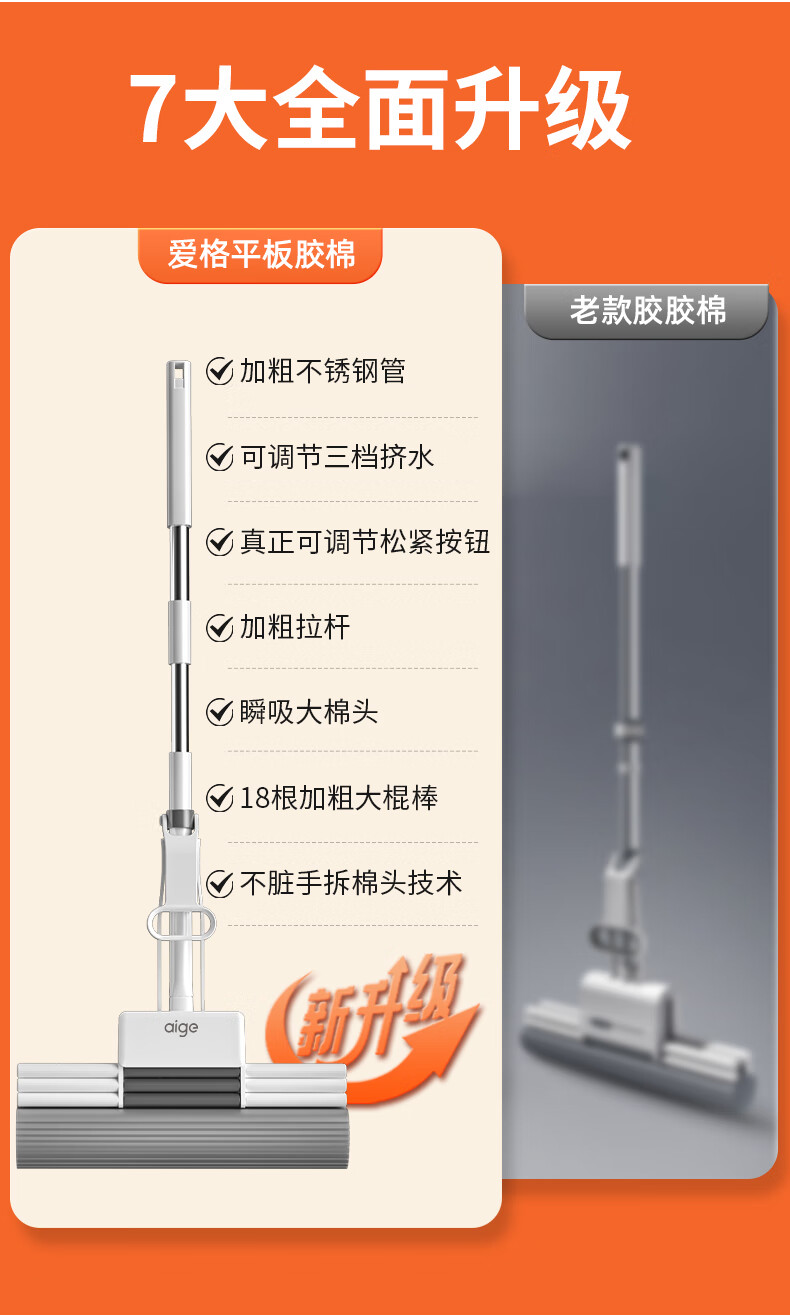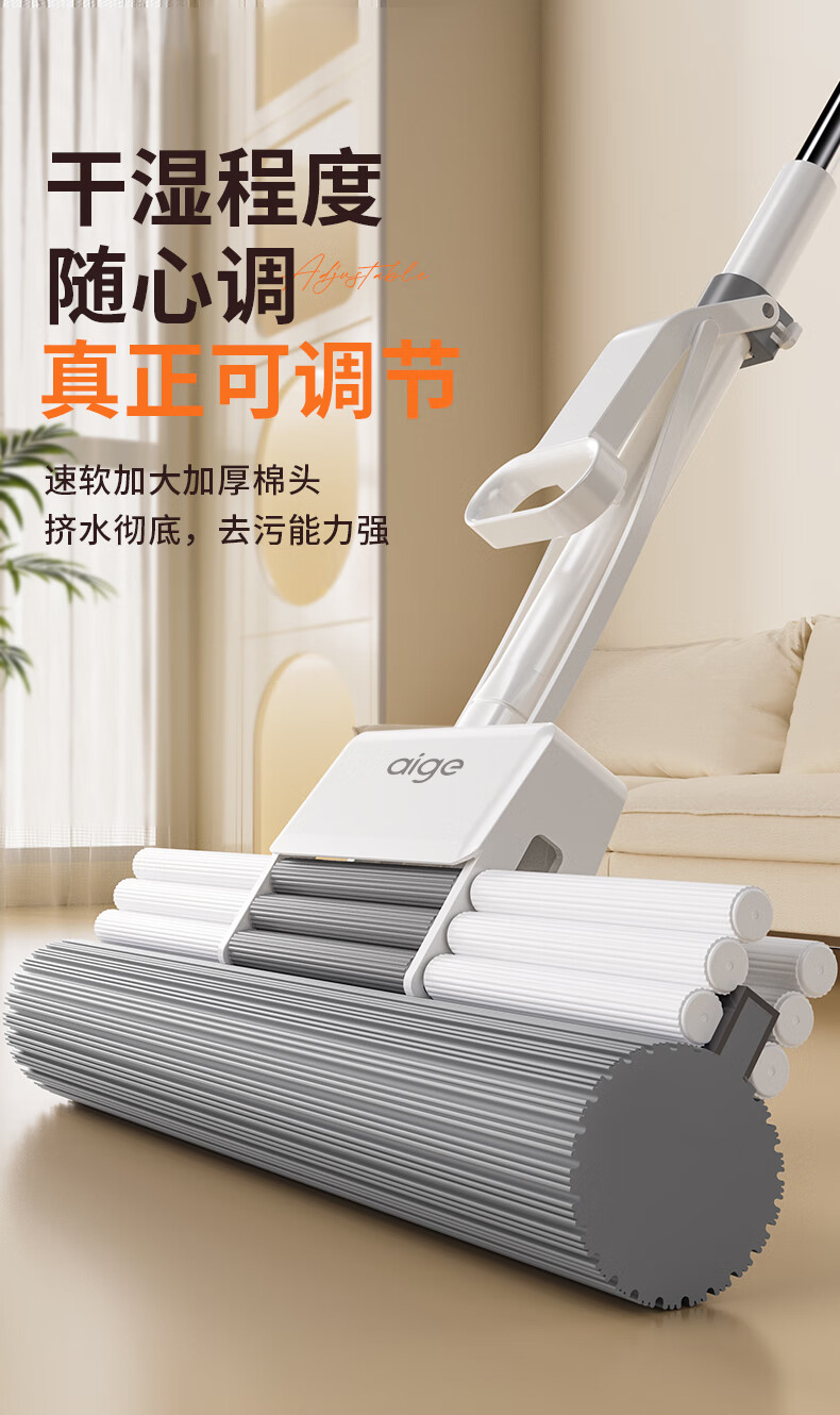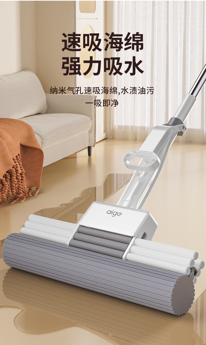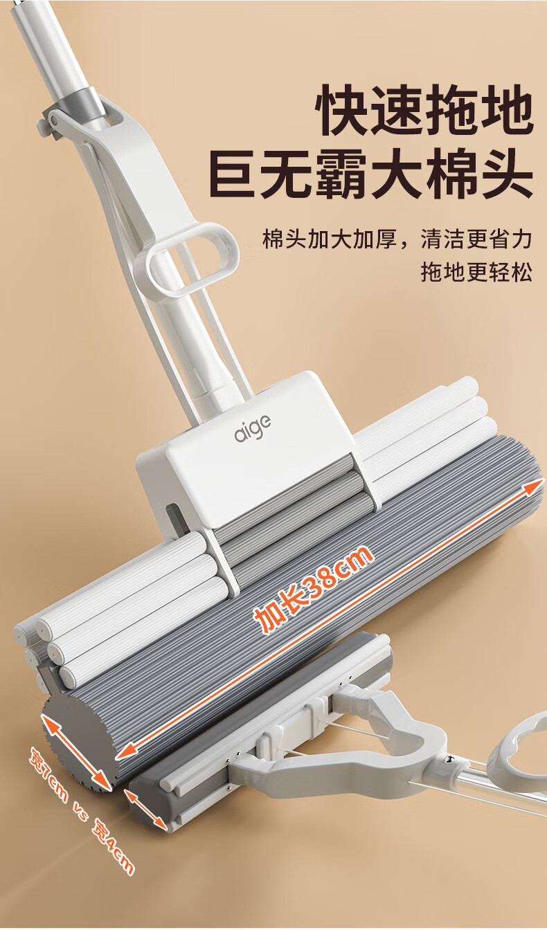 爱格(aige)拖把2025新款吸水海绵卫生间一拖懒人家用胶棉式拖头神器地拖布净 38cm大尺寸巨省力胶棉拖+2个头