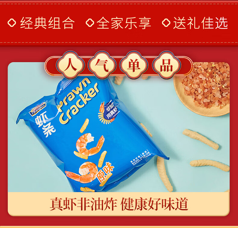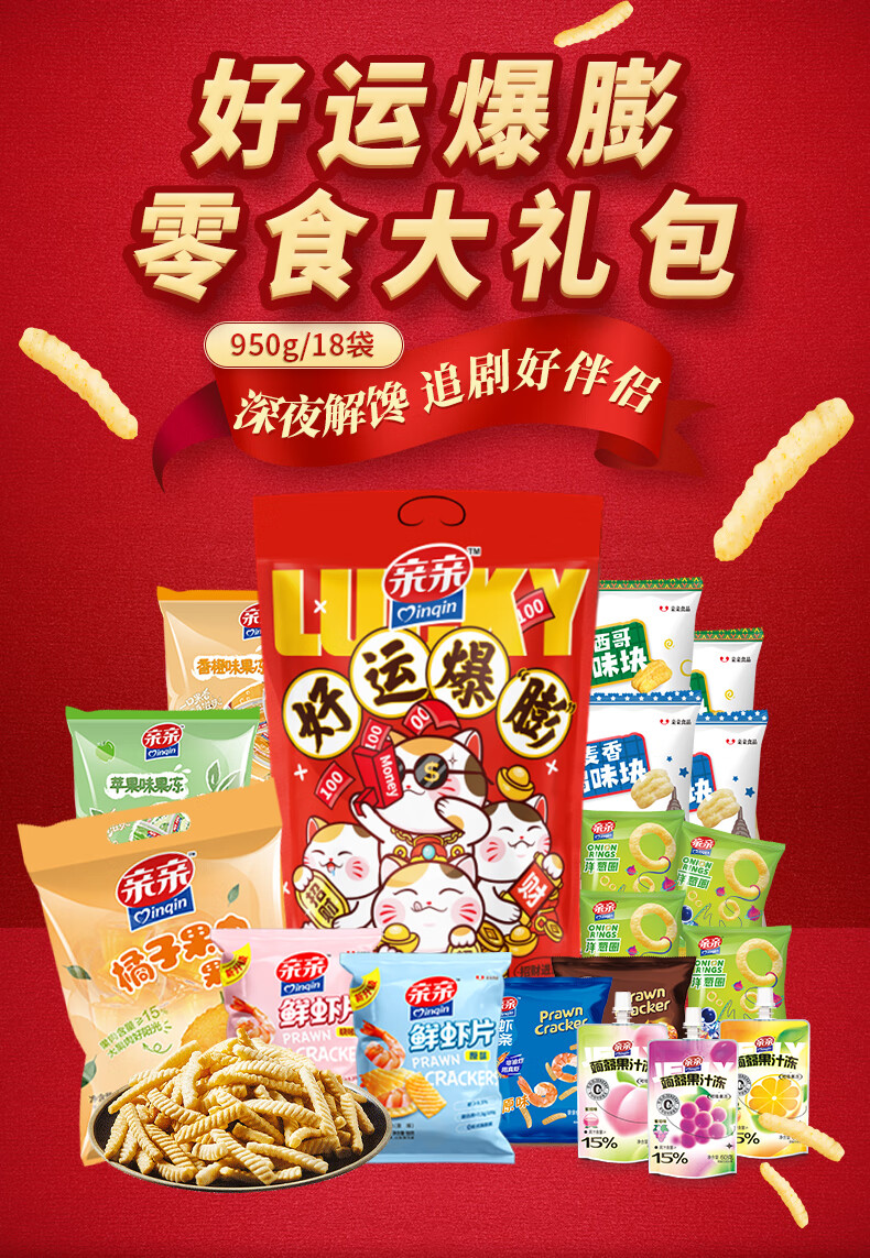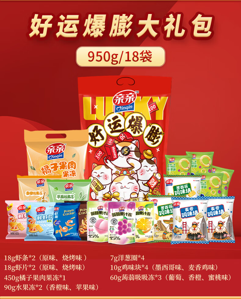 亲亲(Qinqin)休闲零食大礼包膨化虾条虾片洋葱圈鸡味块果冻食品送礼送女友 666g福至当虾大礼包