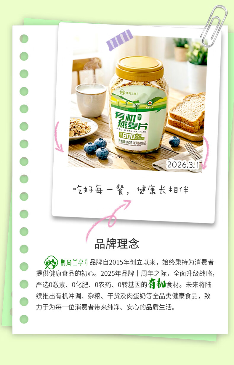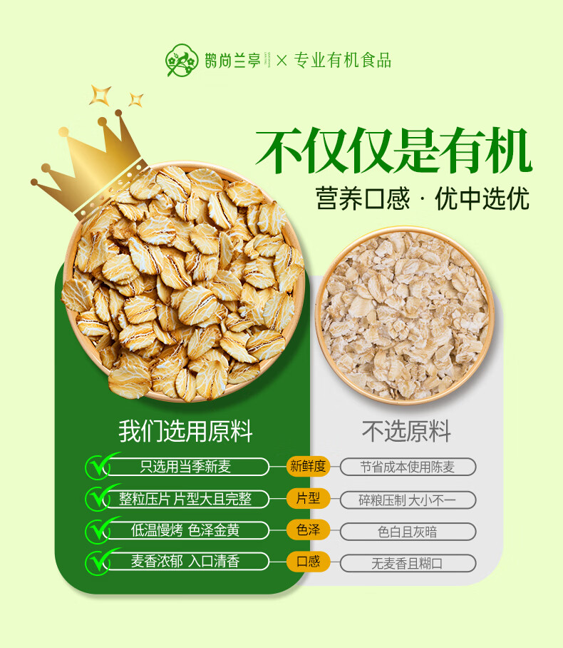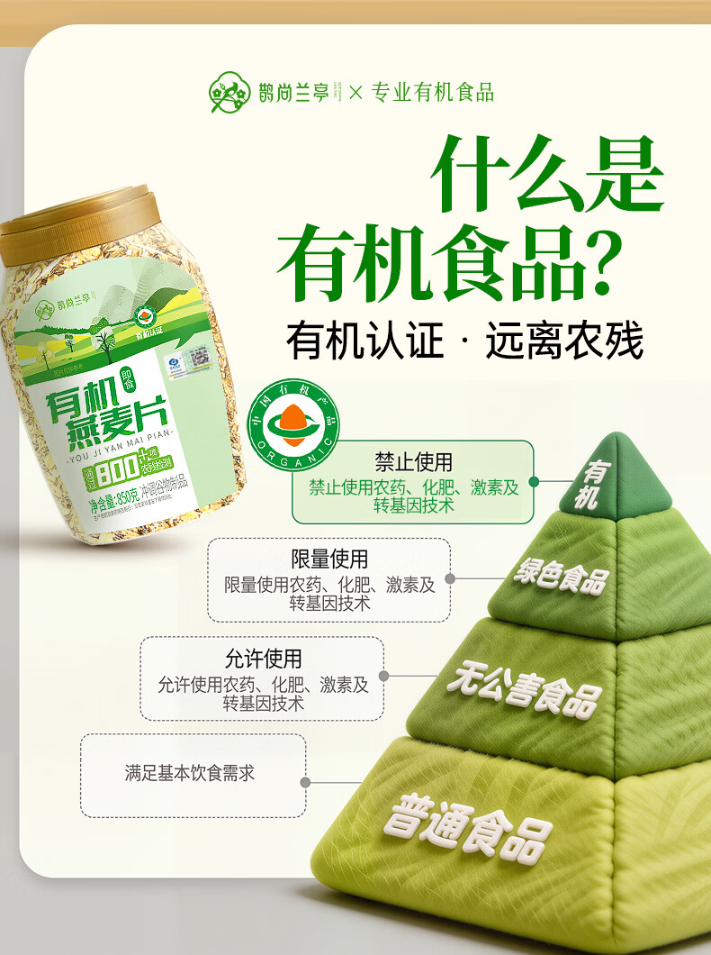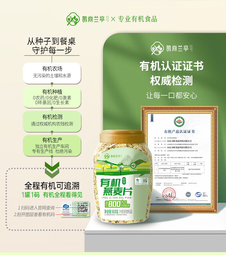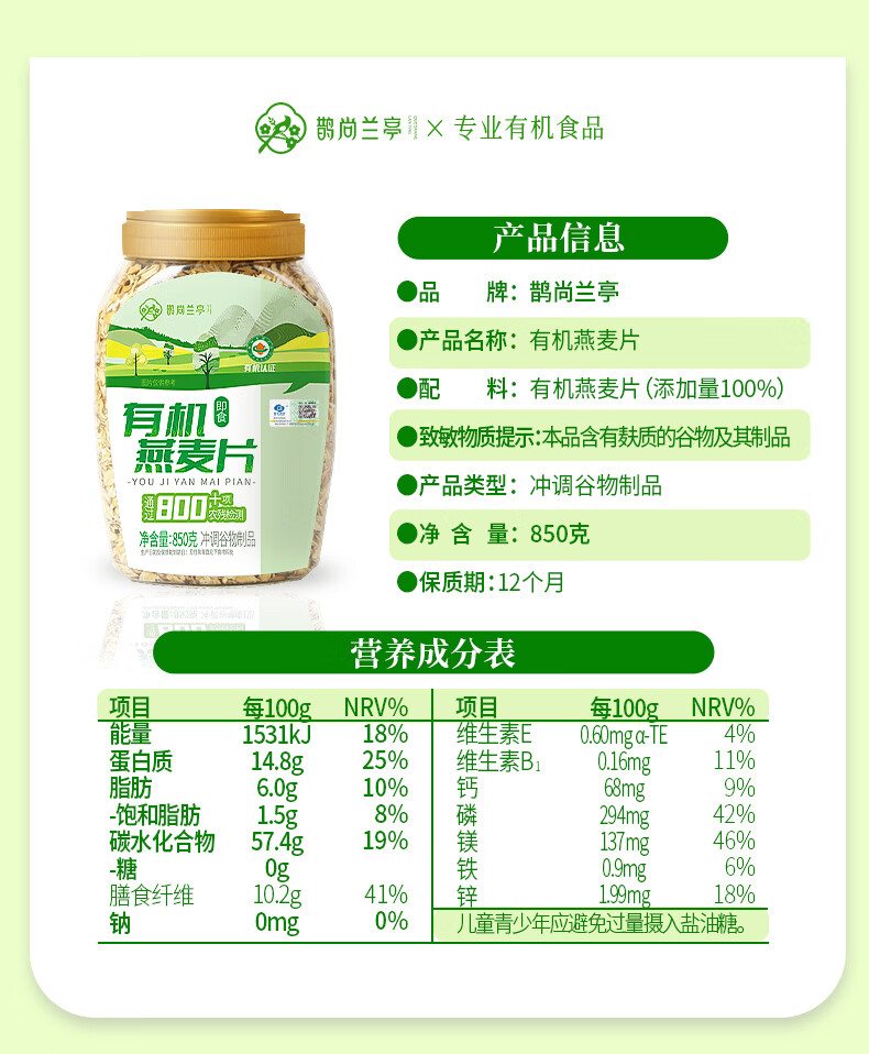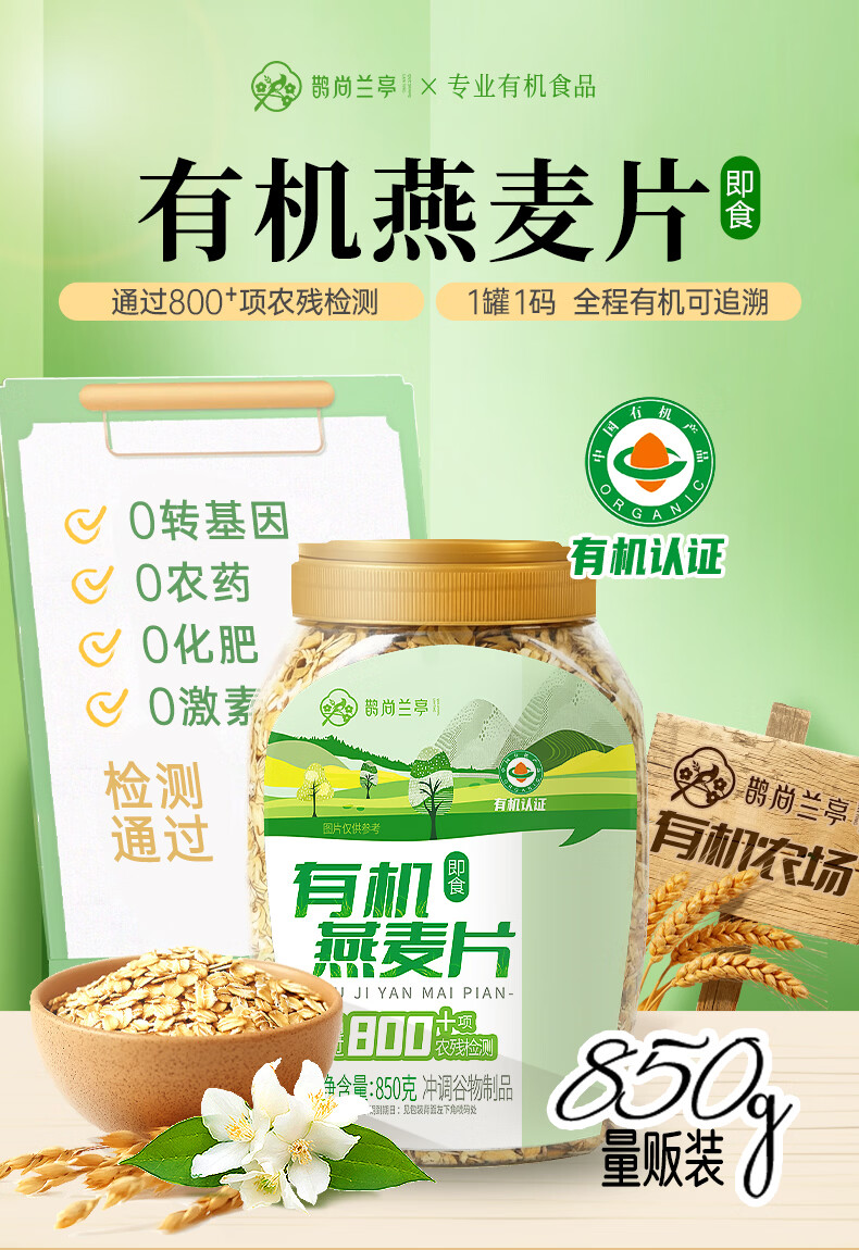 鹊尚兰亭有机纯燕麦片850g桶即食高蛋白营养早餐冲饮谷物代餐