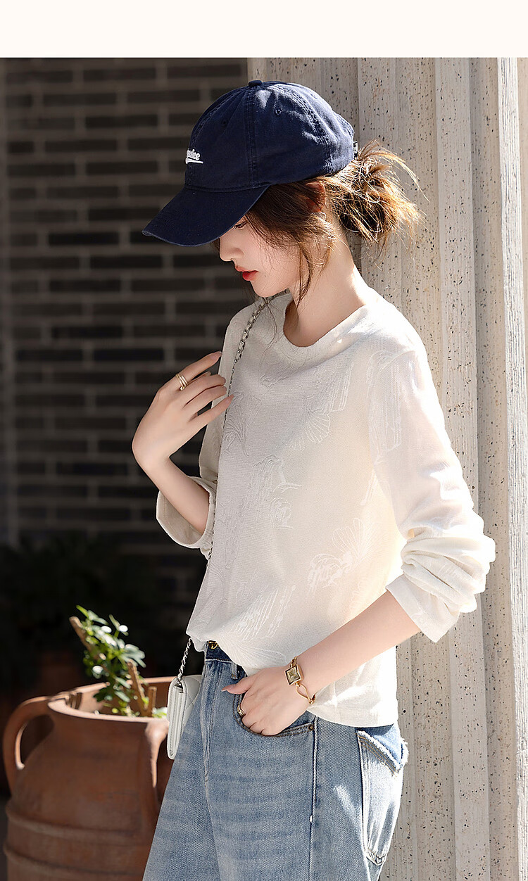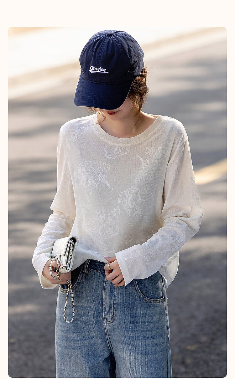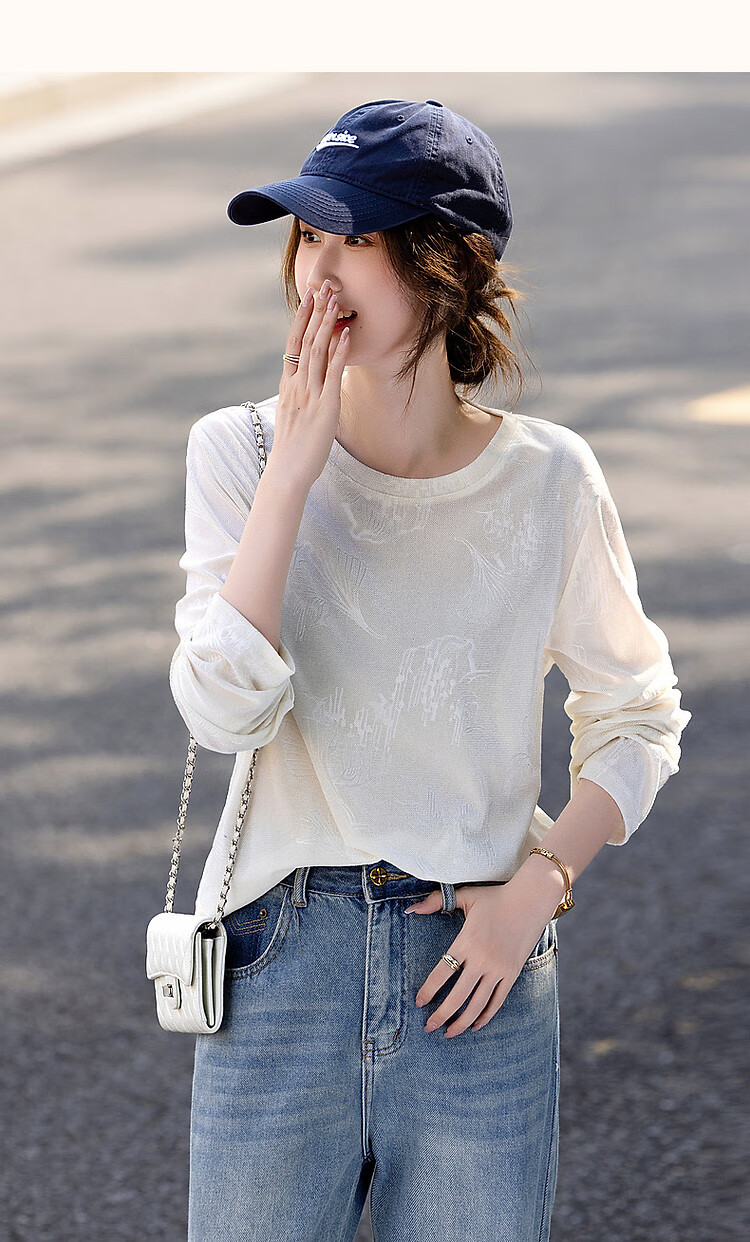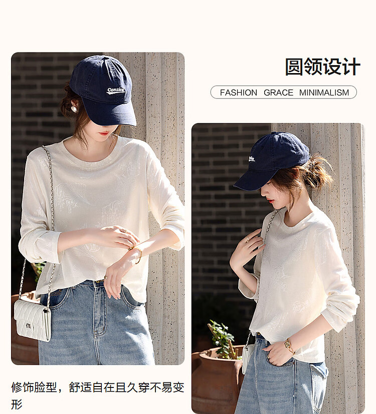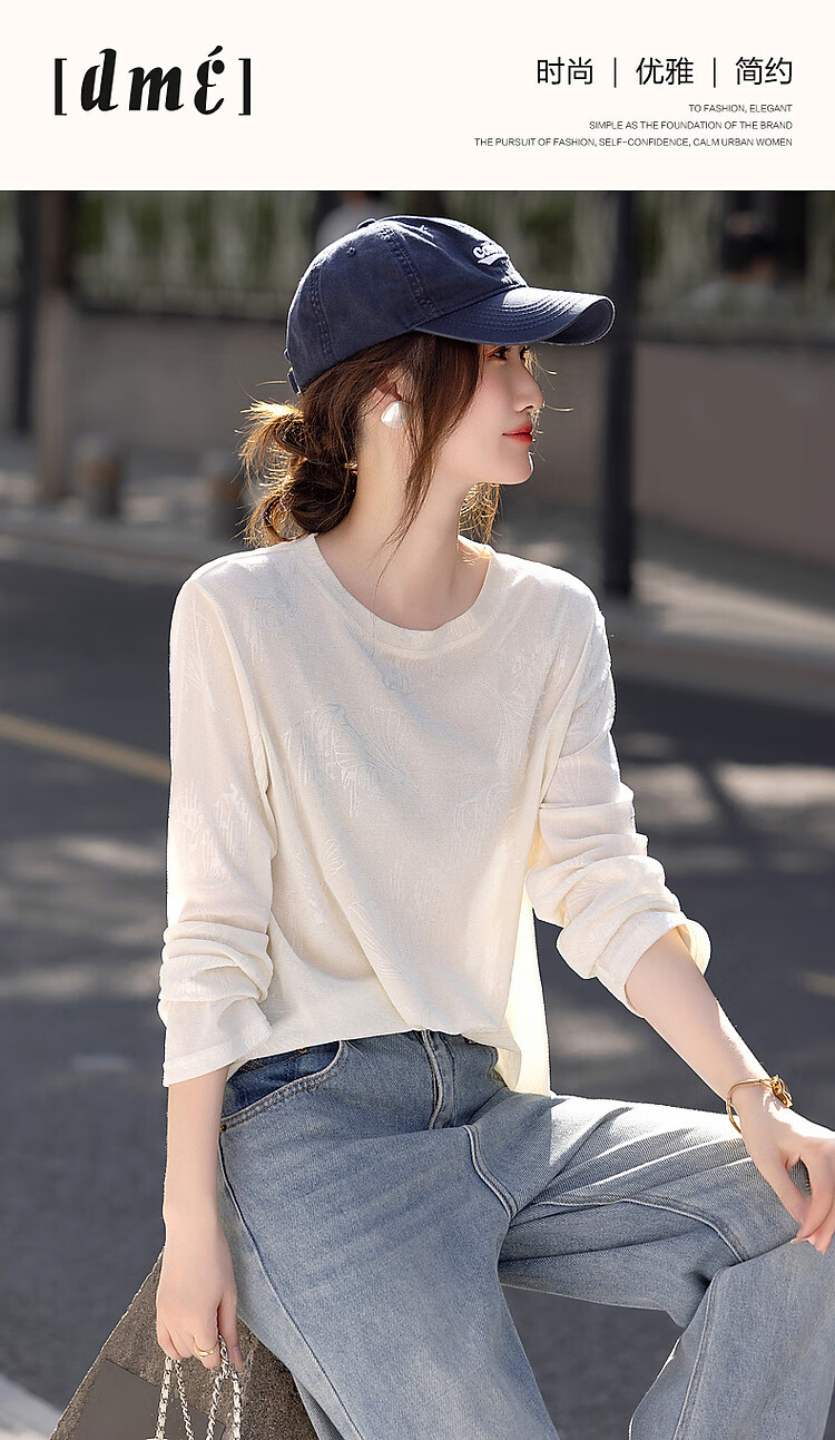 德玛纳【绒感针织压花】春季清冷风圆领长袖微弹舒适微透藏肉好搭t恤女