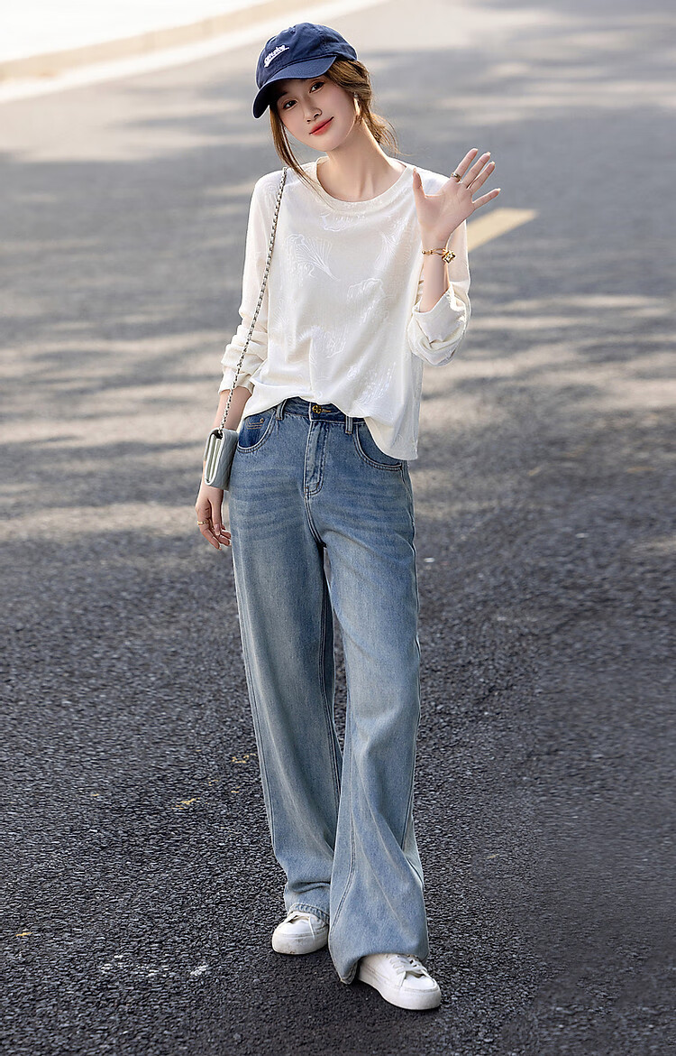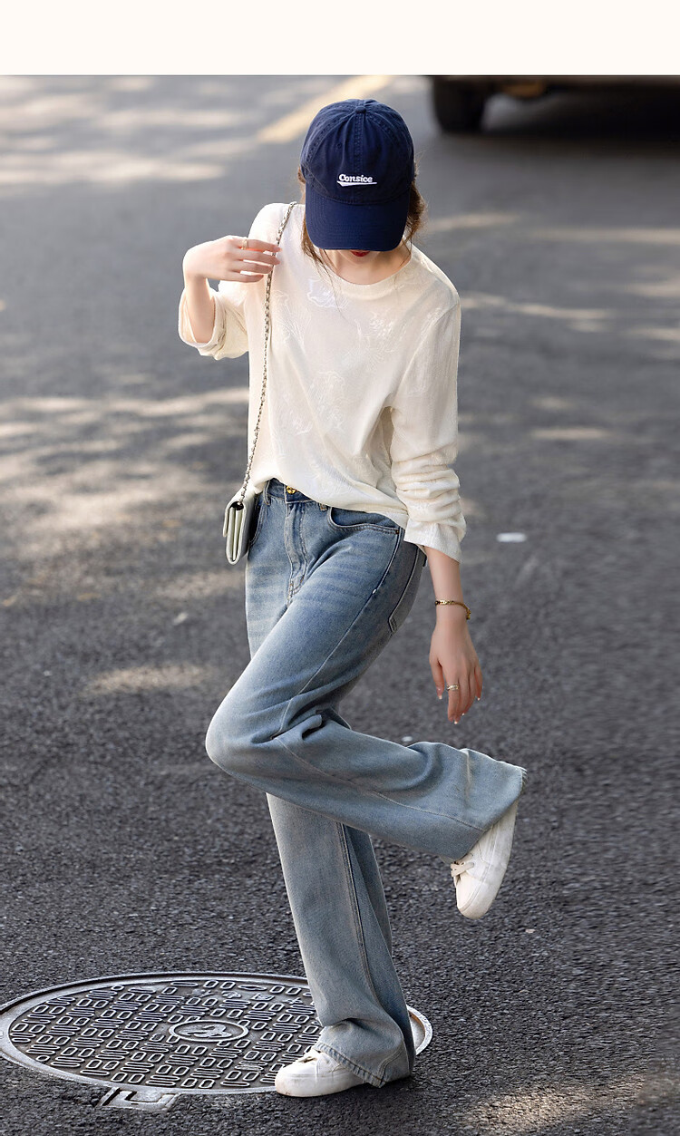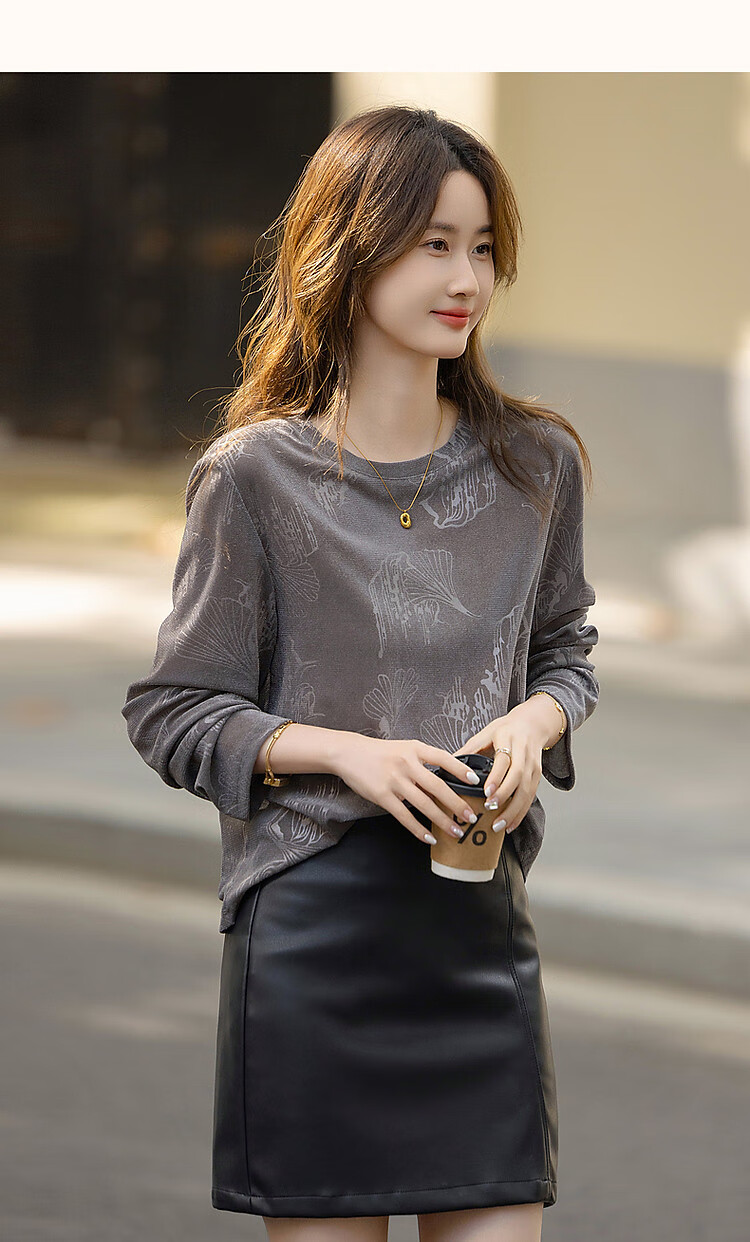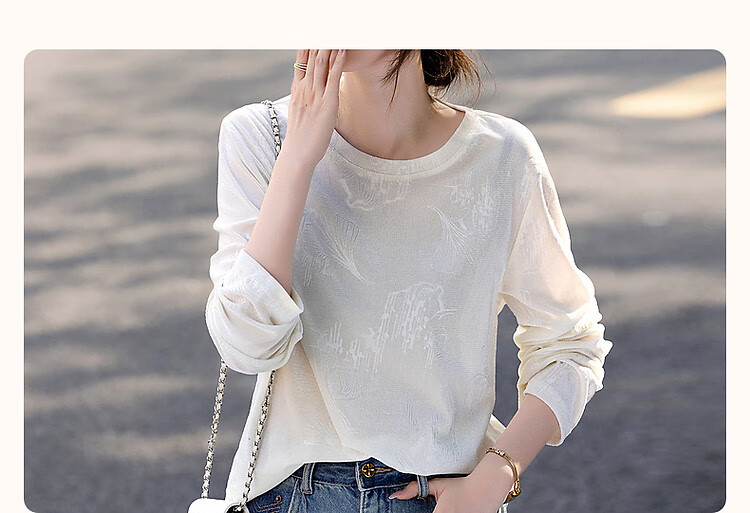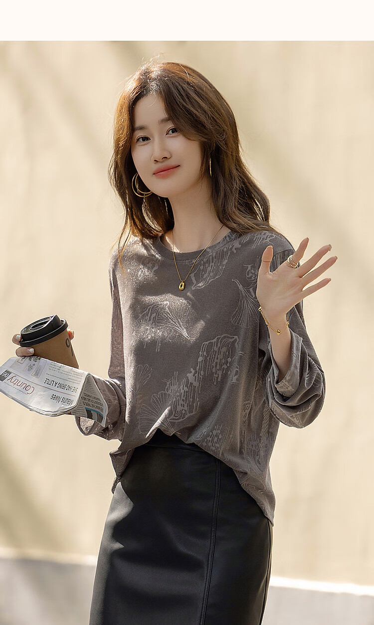 德玛纳【绒感针织压花】春季清冷风圆领长袖微弹舒适微透藏肉好搭t恤女